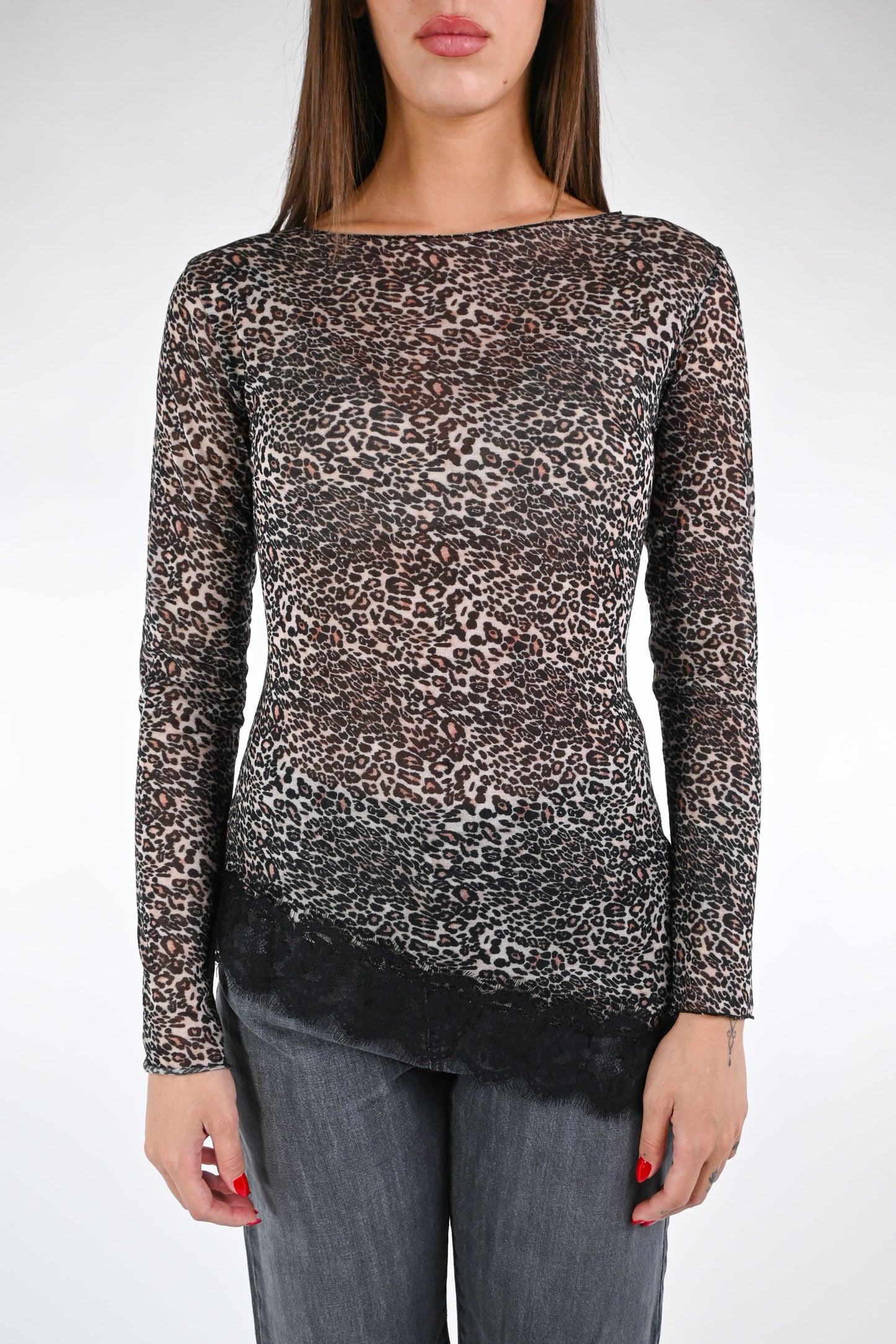 T-shirt misto cachemire scollo barchetta, manica lunga, dettaglio pizzo sul fondo, asimmetrico sul fondo, fantasia animalier