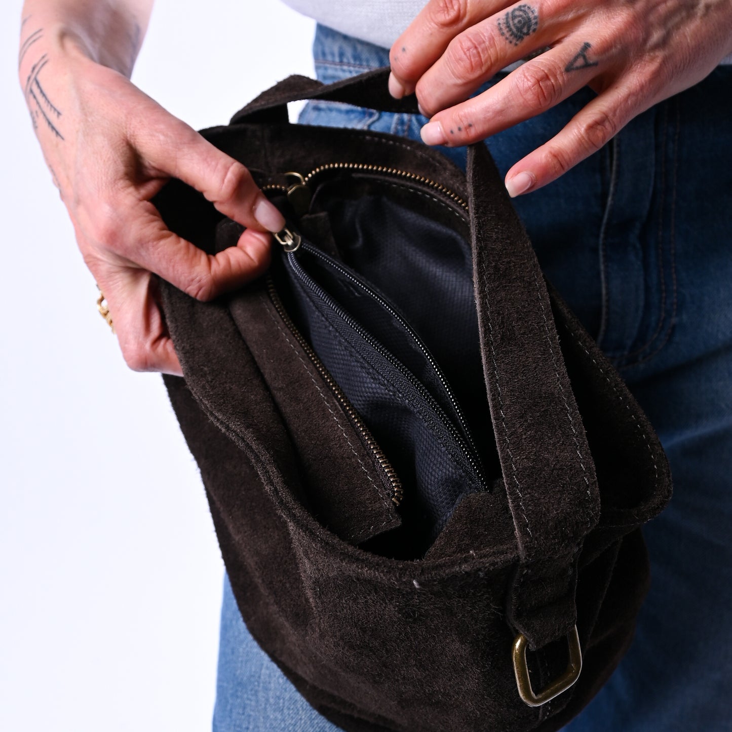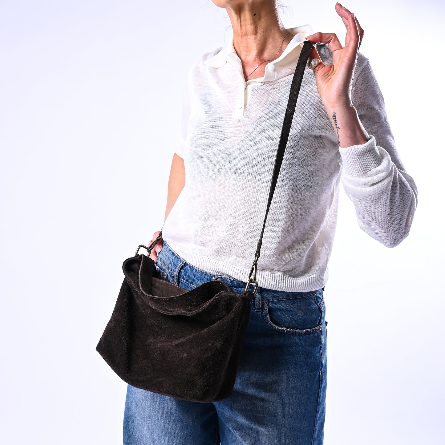 Piccola borsa buletto in camoscio morbido con tracolla regolabile e chiusura a zip, ideale per chi vuole portare l'essenziale con eleganza. Dotata di scomparti interni con zip per mantenere tutto organizzato e facilmente accessibile.