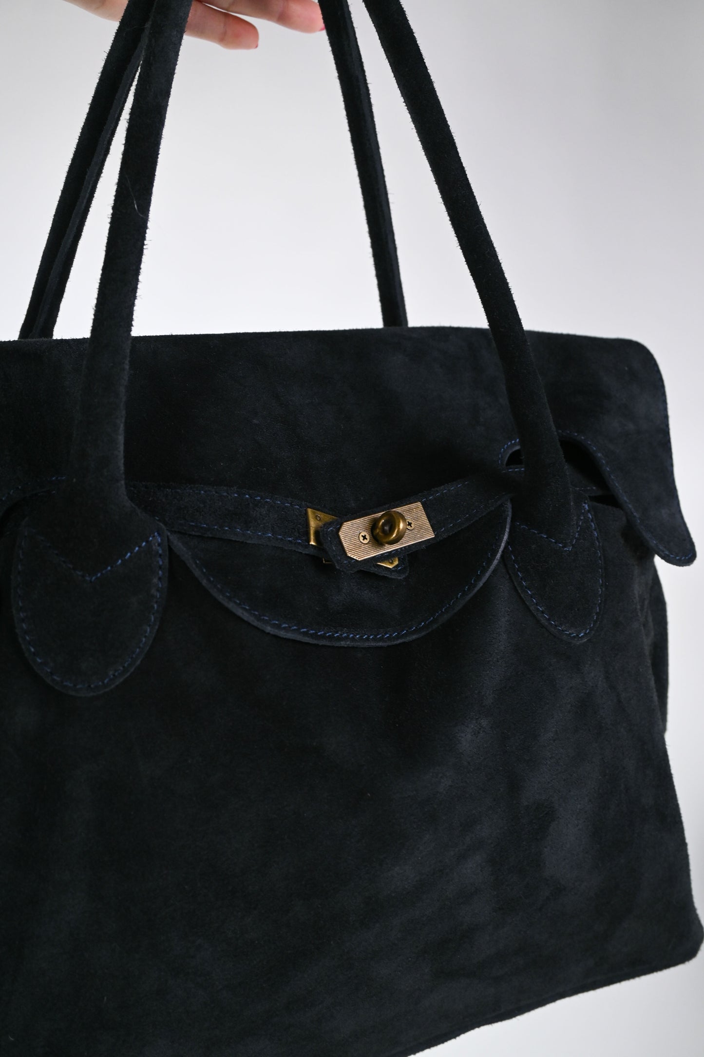 Borsa grande in pelle scamoscia, con manici e tracolla, con chiusura a morsetto, colore blu