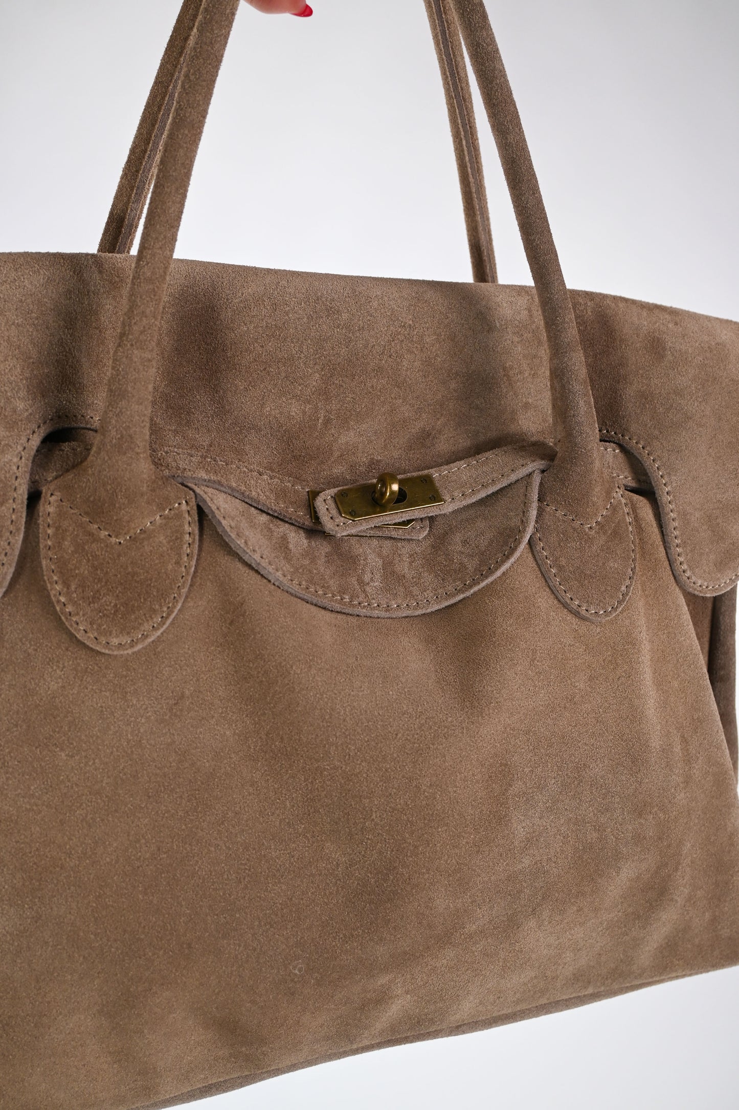 Borsa grande in pelle scamoscia, con manici e tracolla, con chiusura a morsetto, colore taupe