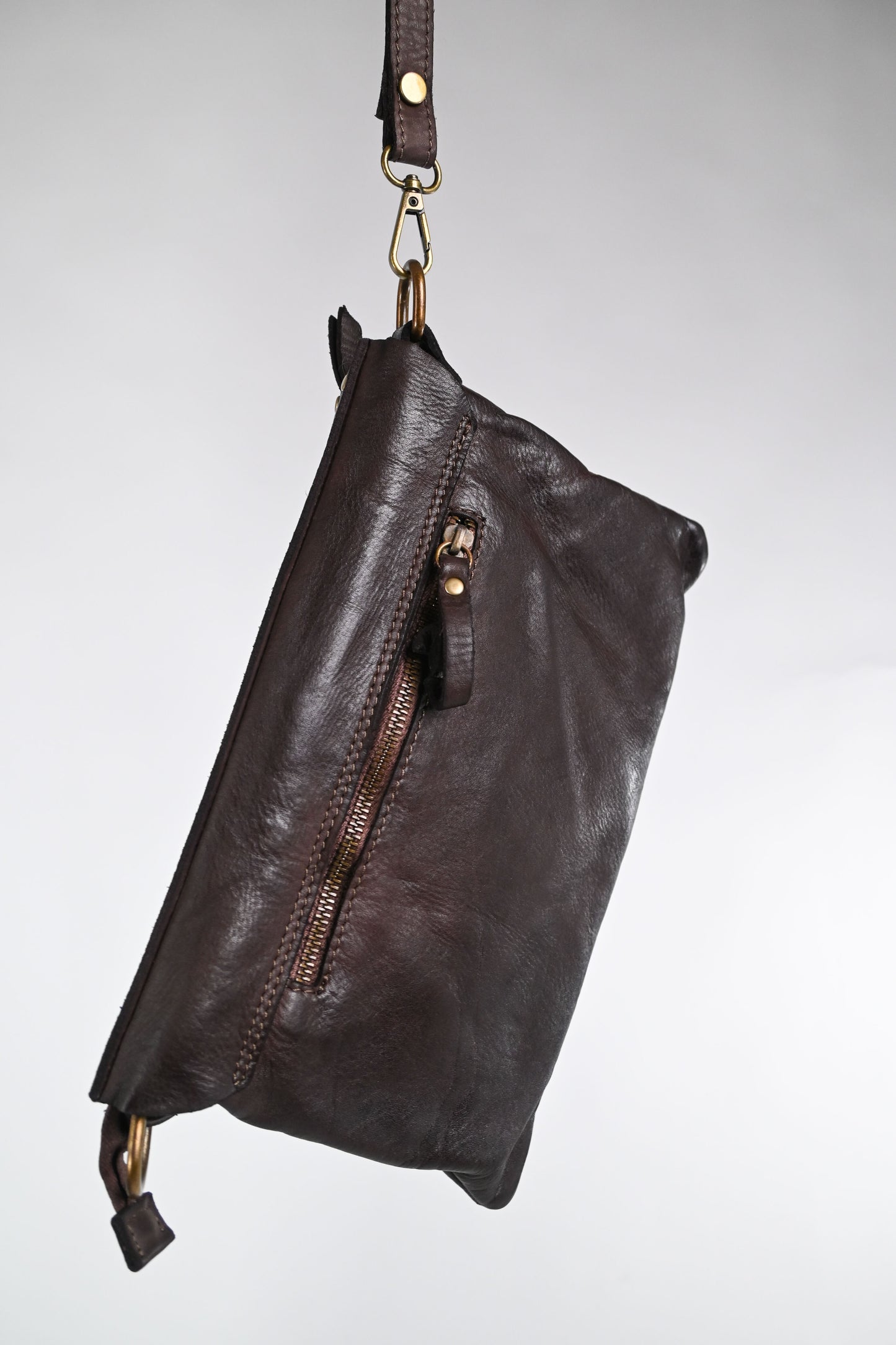 Borsa a bustina con borchie in pelle lavata, con tracolla, chiusura con bottone a clip e zip , colore moro