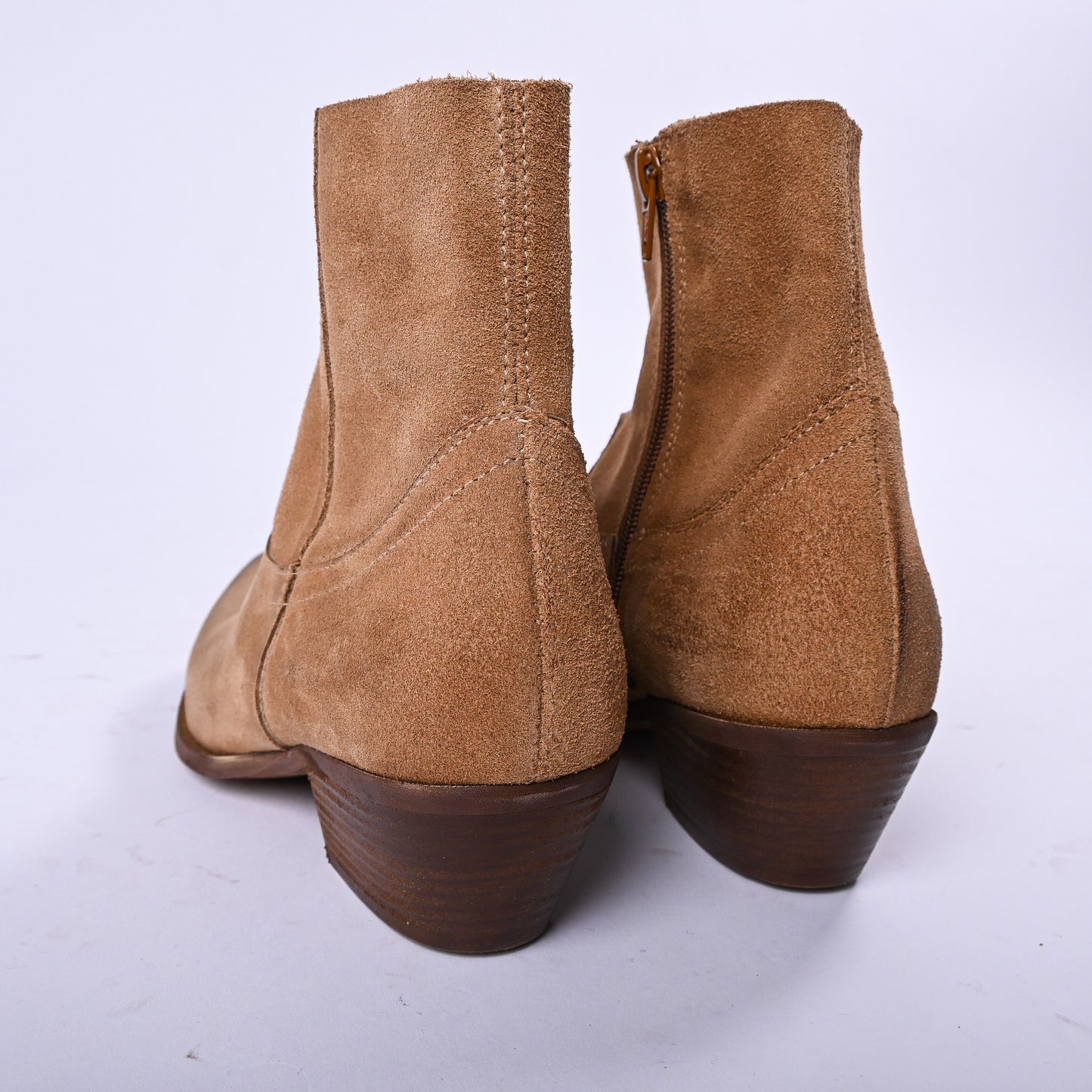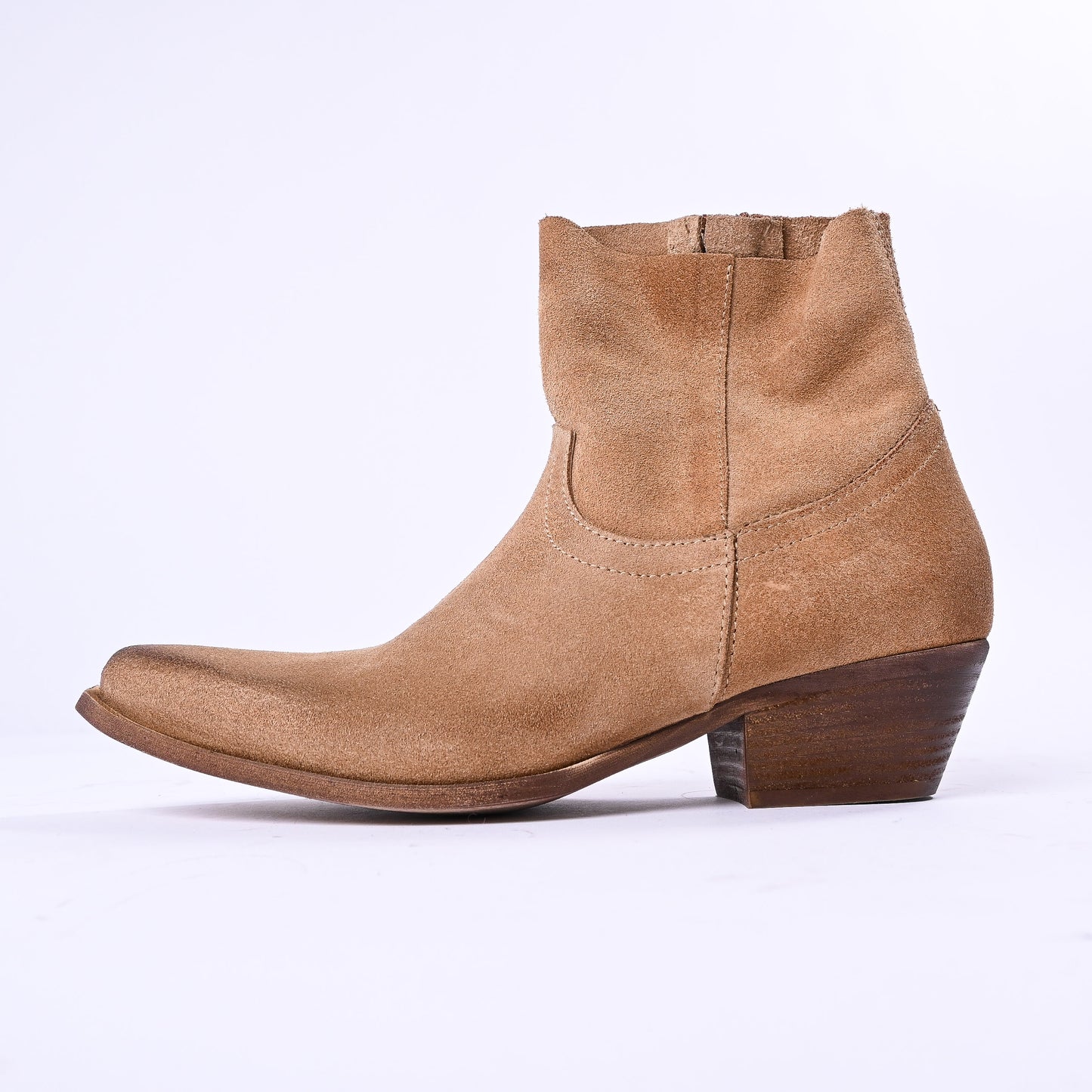 Texano in camoscio con il caratteristico taglio vivo che esalta la texture naturale del materiale. Dotato di zip interna per una praticità d'uso quotidiana, perfetto per chi ricerca un capo versatile e di qualità.