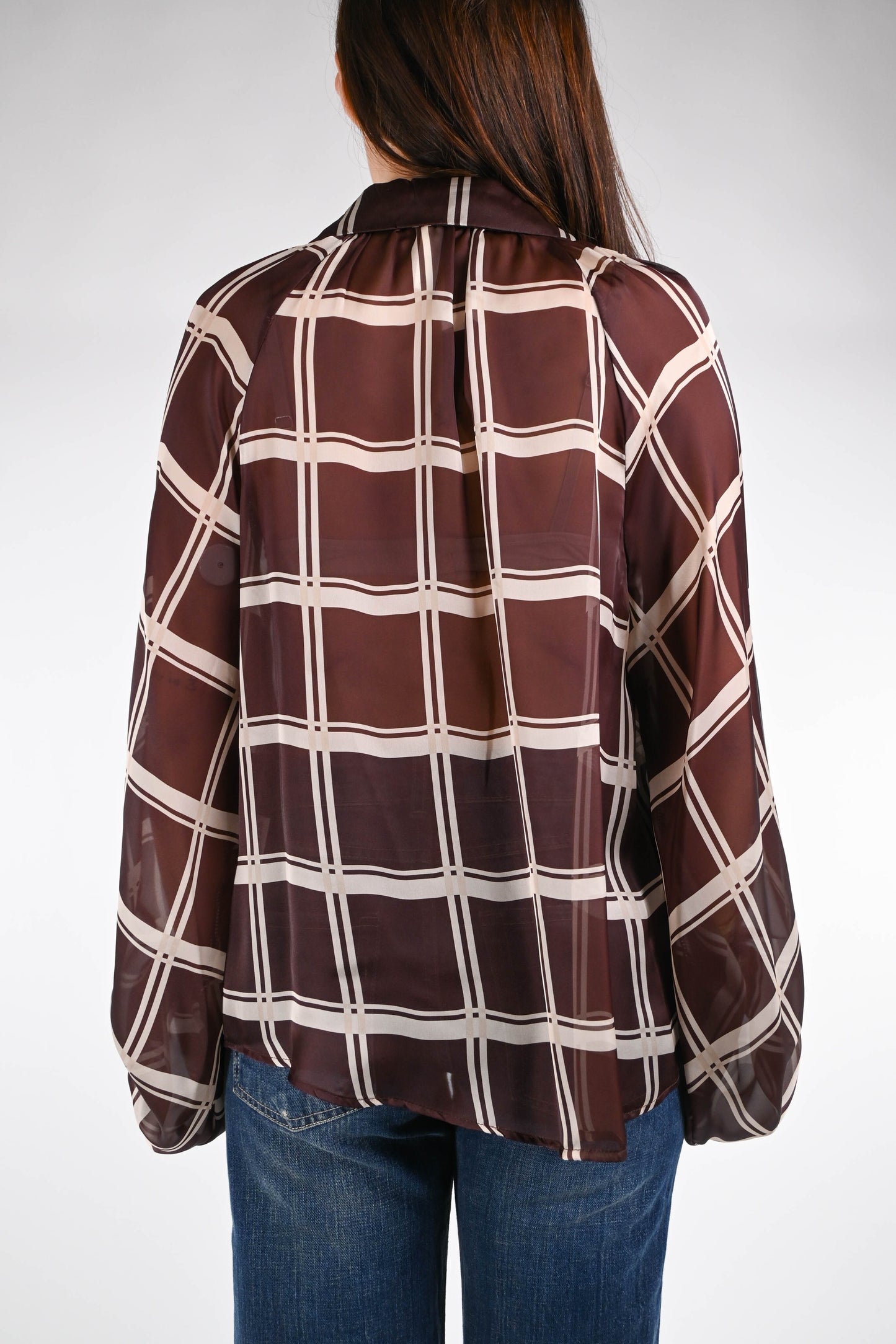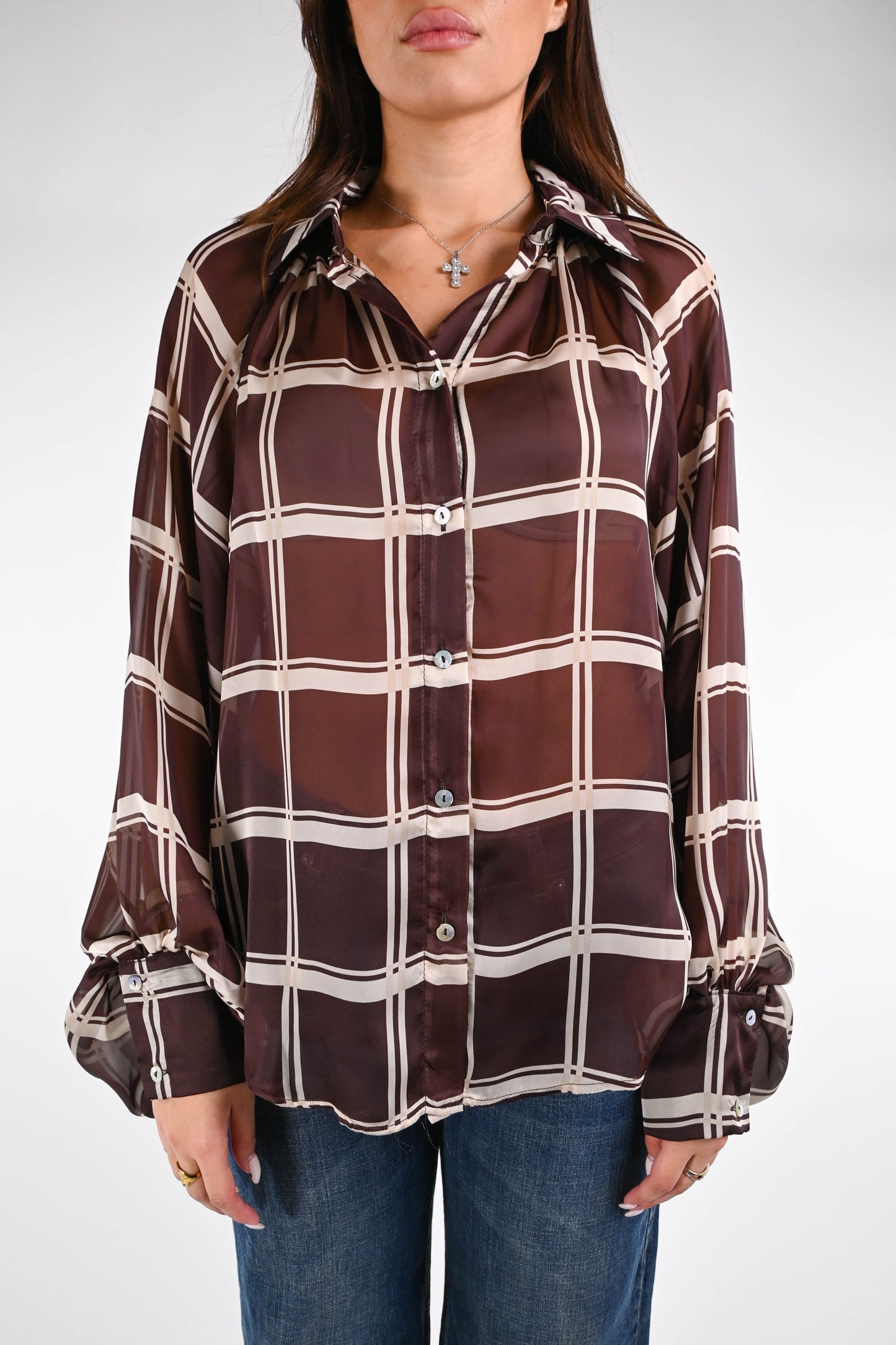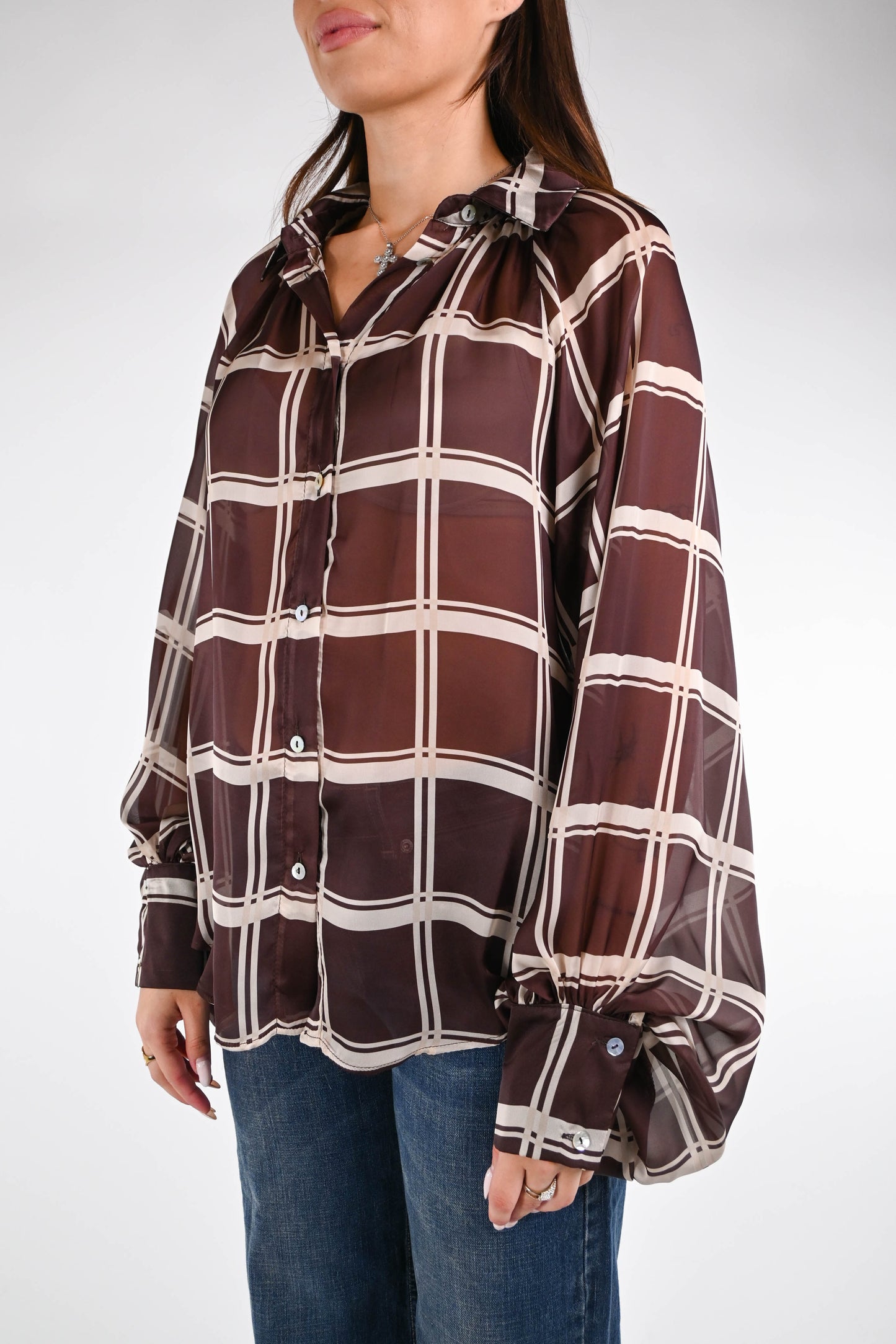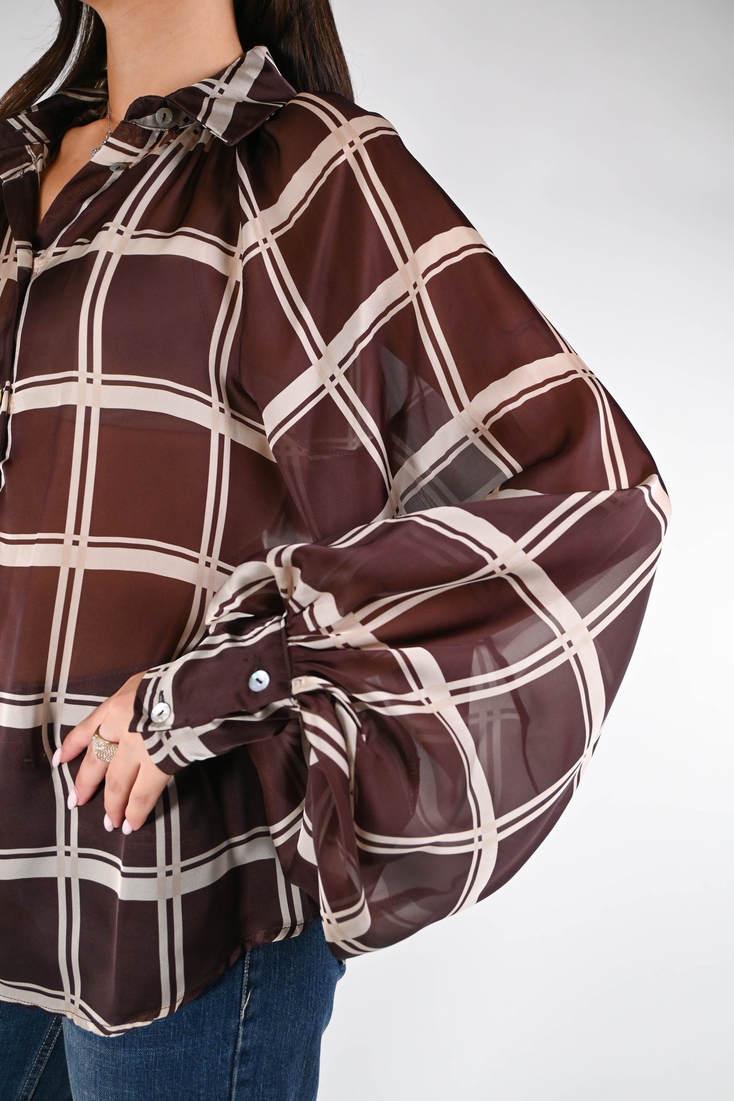 Camicia over, con manica a sbuffo, fantasia a quadri, leggermente trasparente colore Moro.
