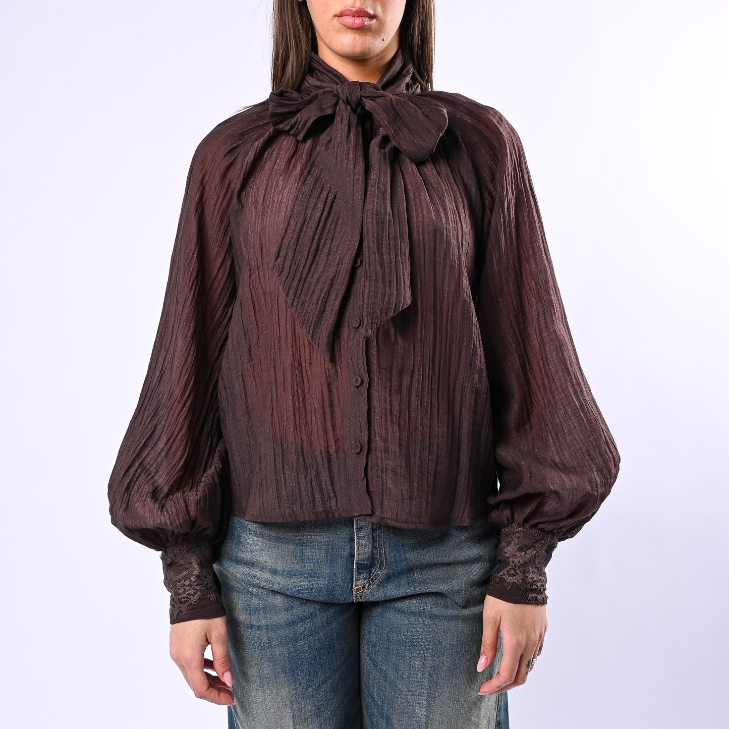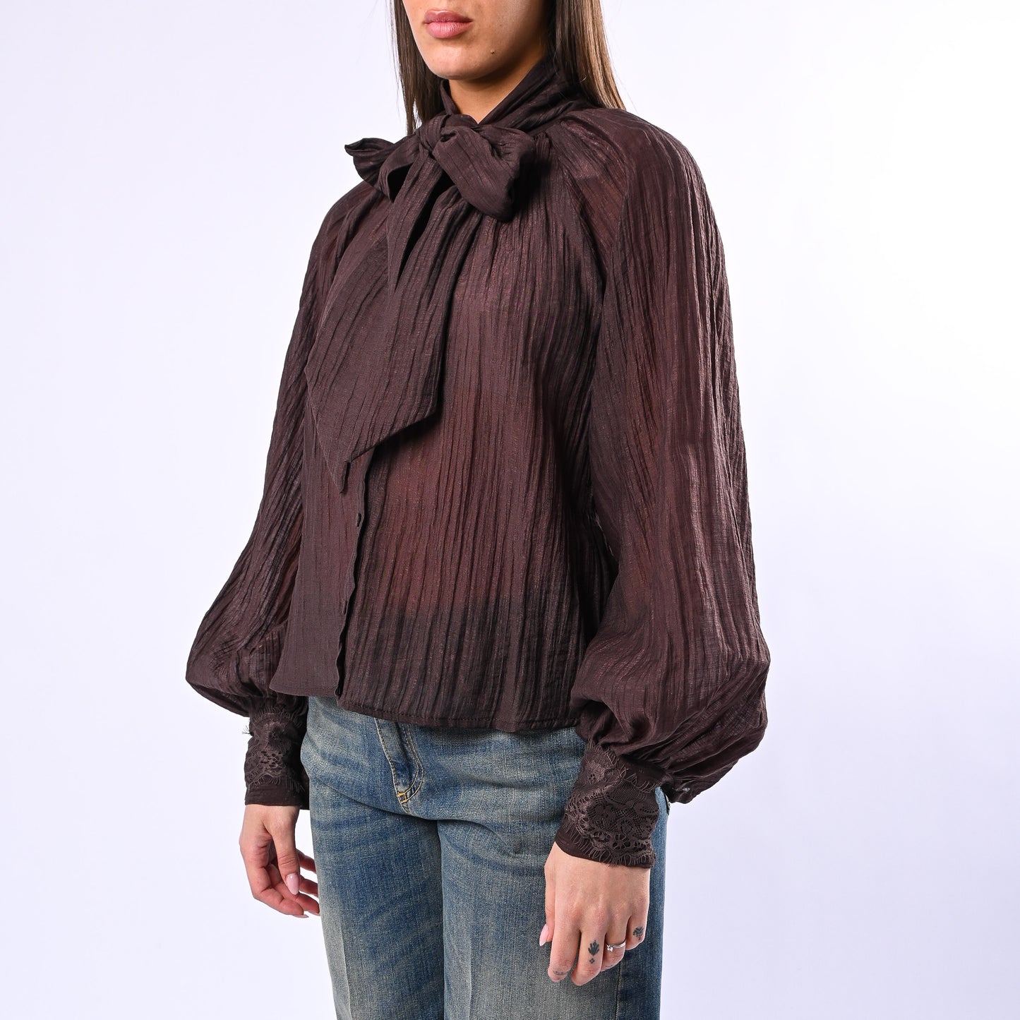 Camicia over in lyocell con fiocco decorativo e dettagli in pizzo sui polsini, ideale per uno stile raffinato e contemporaneo. Tessuto fluido e confortevole, perfetta da indossare sia in occasioni formali che casual.