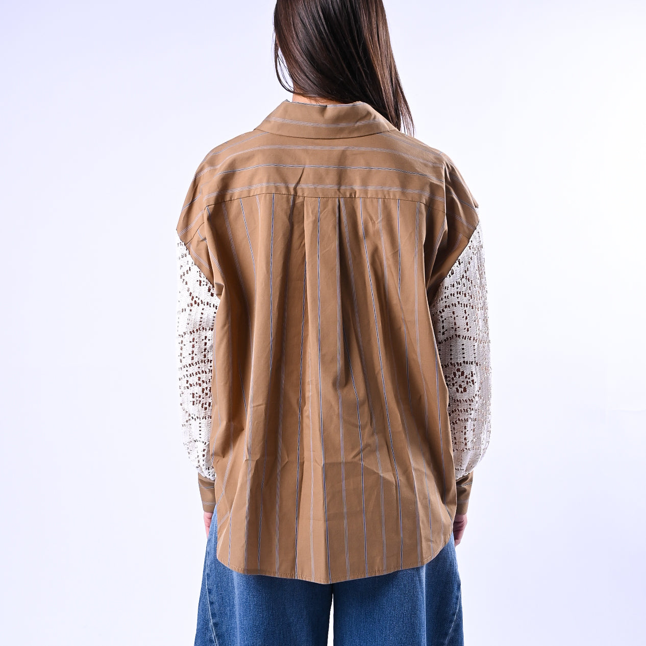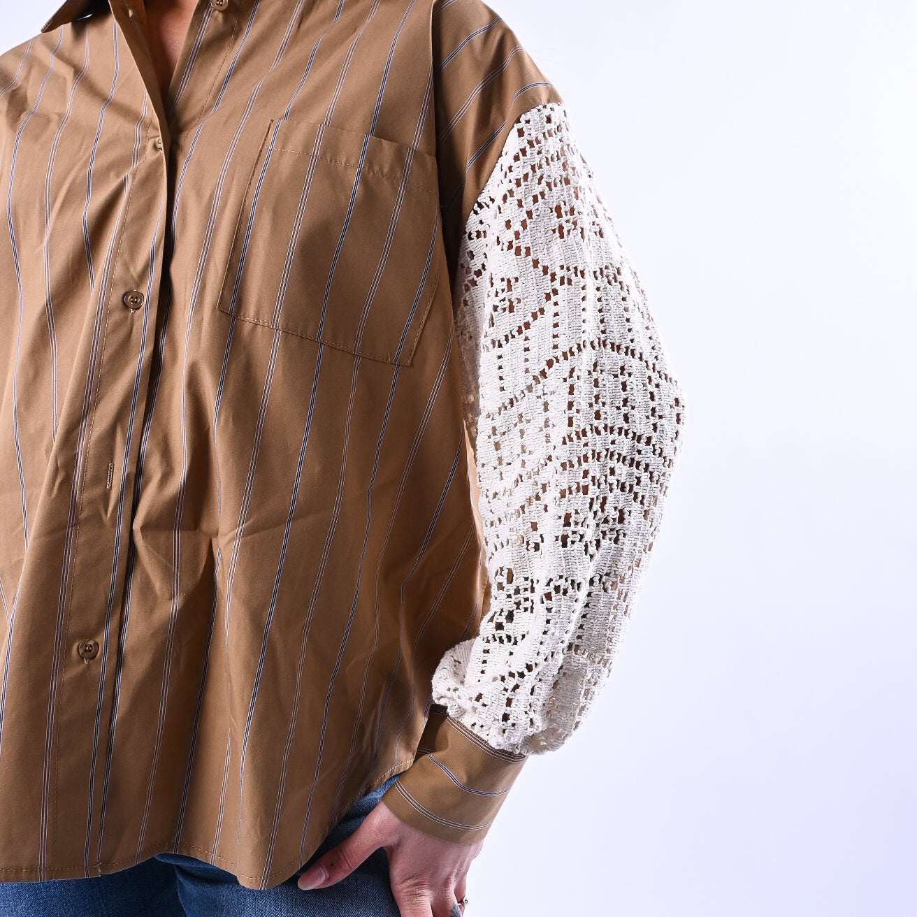 Camicia in popeline gessato con inserti in pizzo sulle maniche, perfetta per chi ricerca un capo sofisticato e versatile. Colore moro e panna crea un contrasto raffinato, ideale per occasioni speciali e look quotidiani.