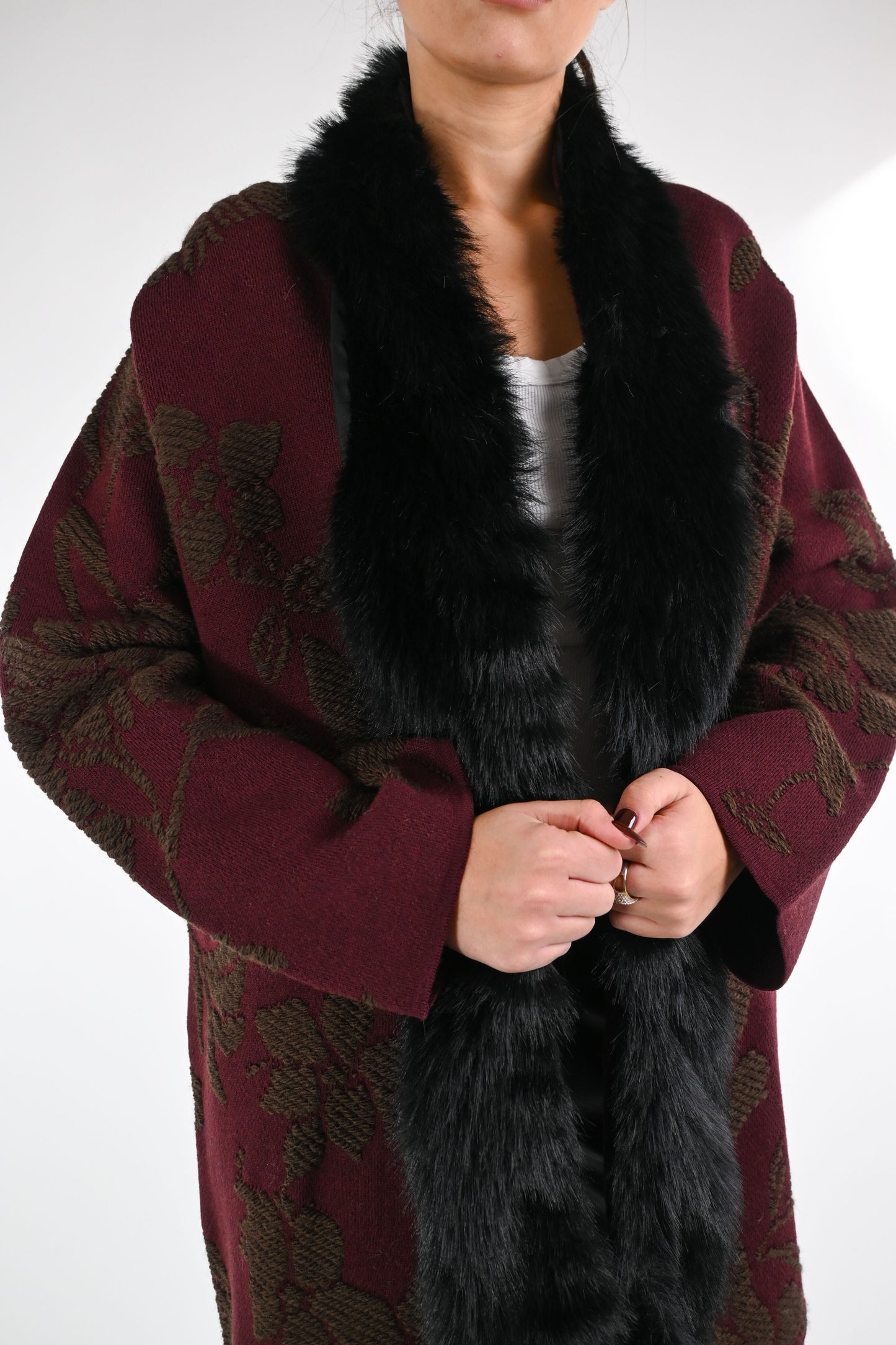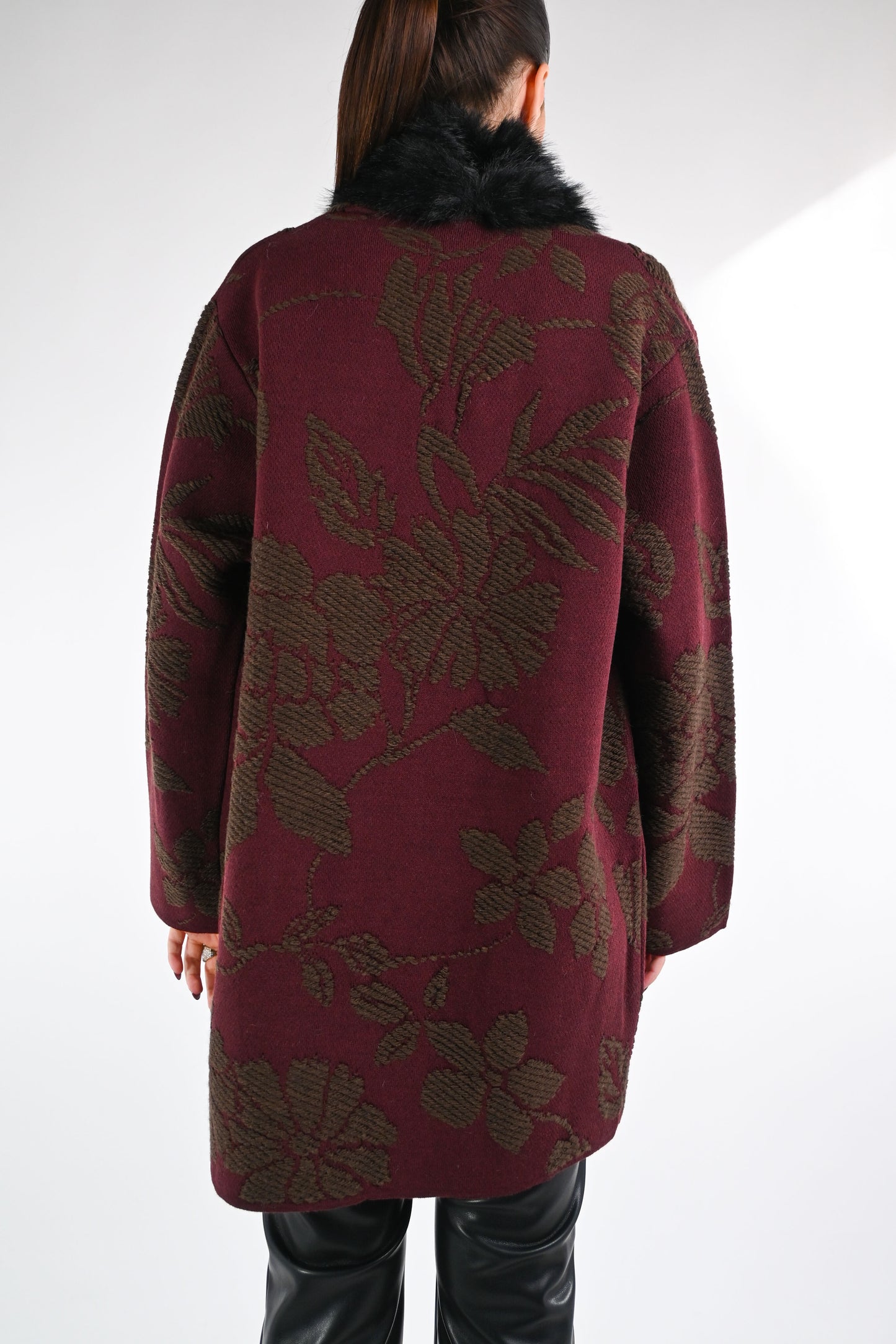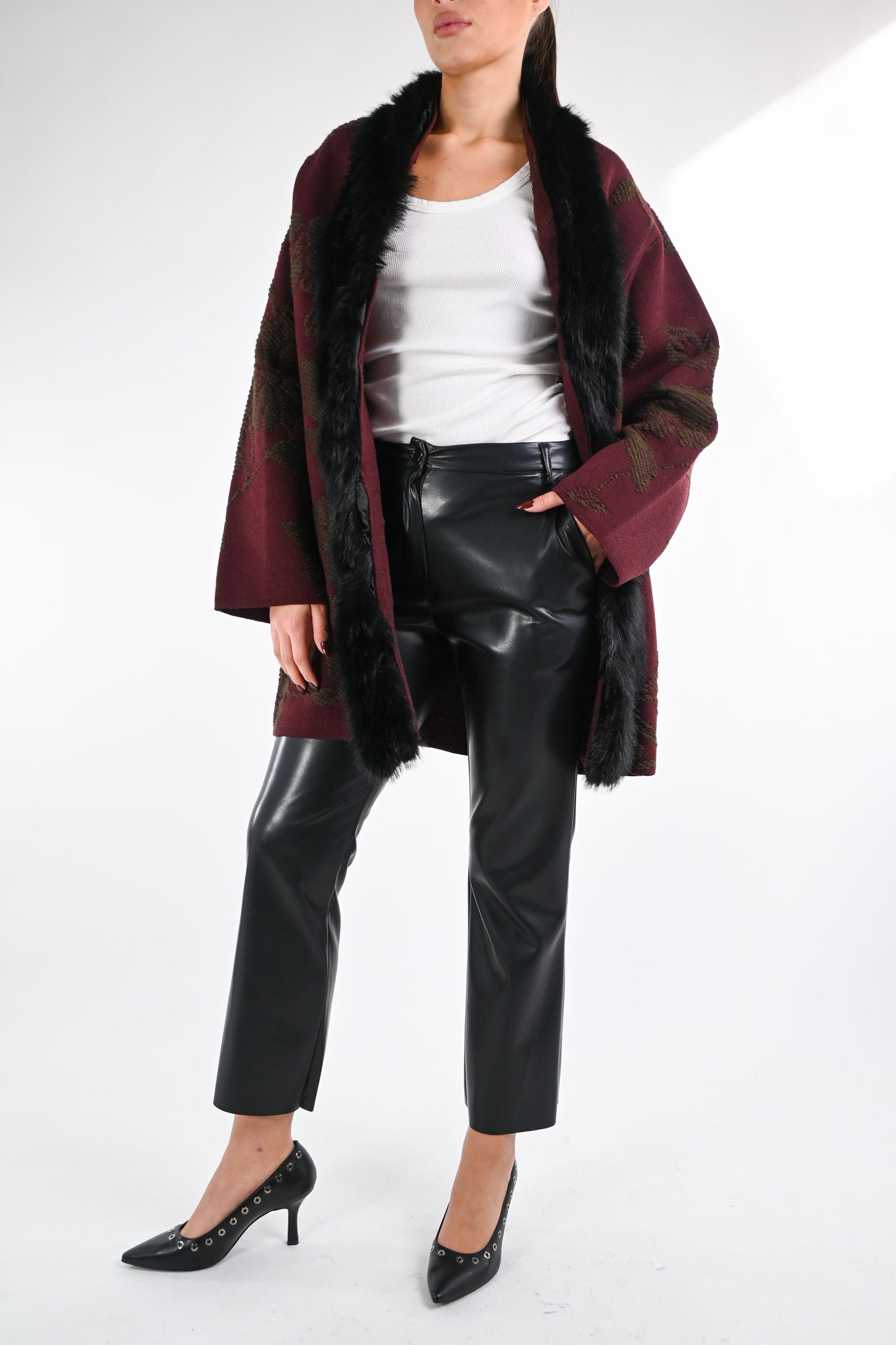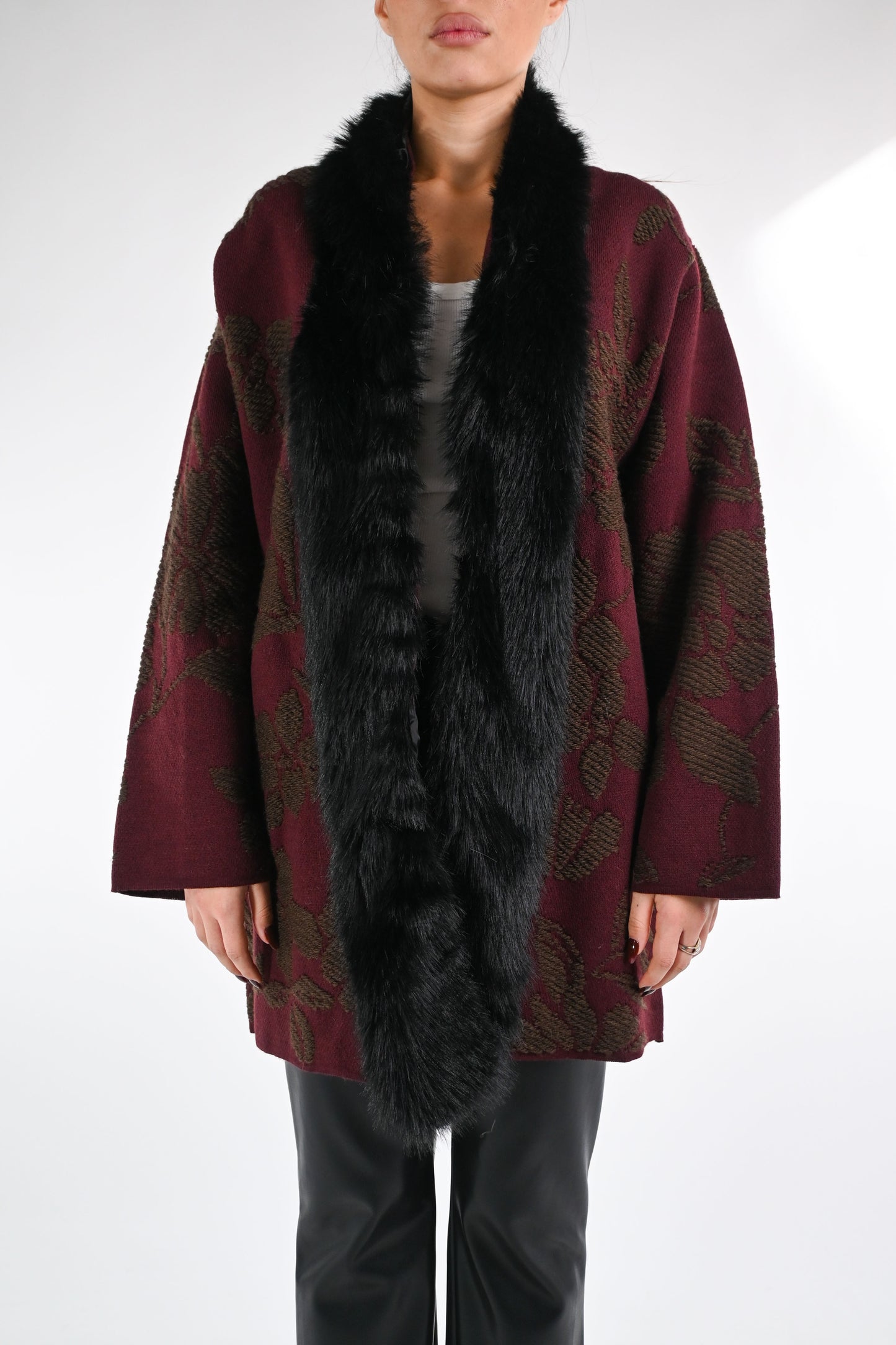 Cardigan/cappotto jaquard, con collo in ecopelliccia, senza bottoni, colore bordeaux/panna