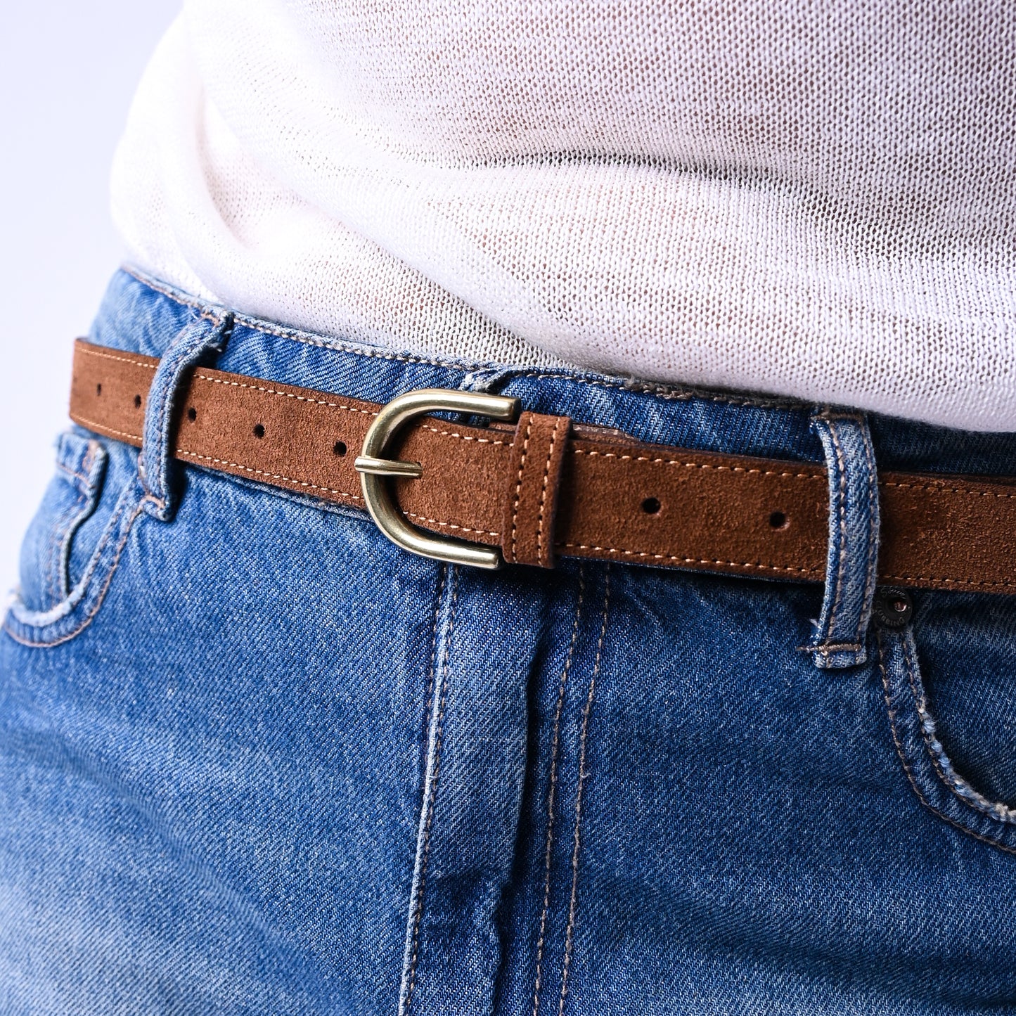 Cintura in morbida pelle scamosciata con fibbia ovale in ottone, un dettaglio raffinato che aggiunge carattere al tuo guardaroba. Ideale per chi ricerca qualità e design essenziale in un accessorio versatile e durevole.