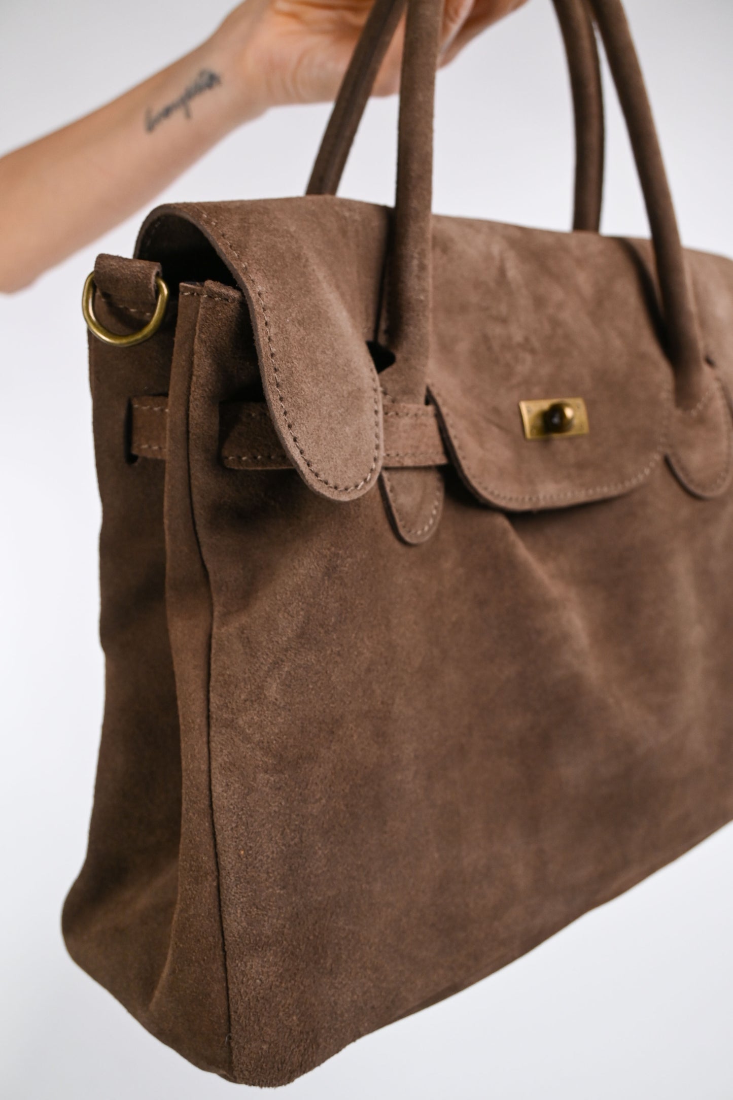 Borsa media in pelle scamoscia, con manici e tracolla, con chiusura a morsetto, colore fango