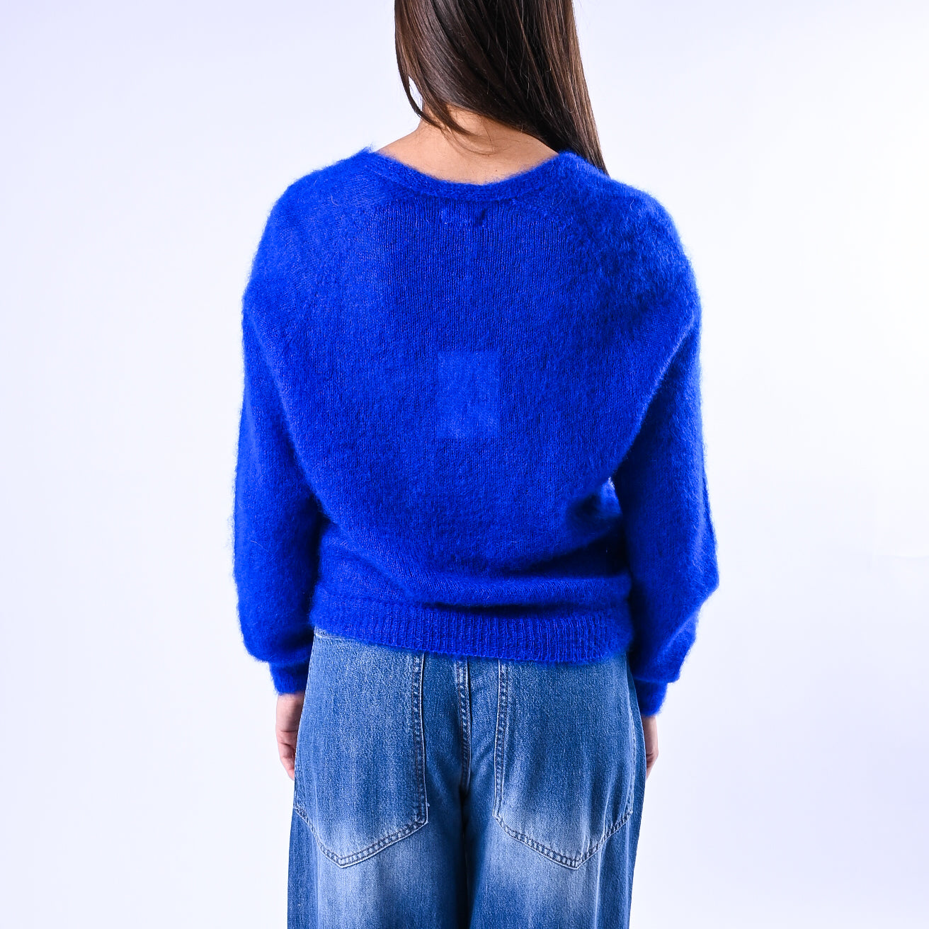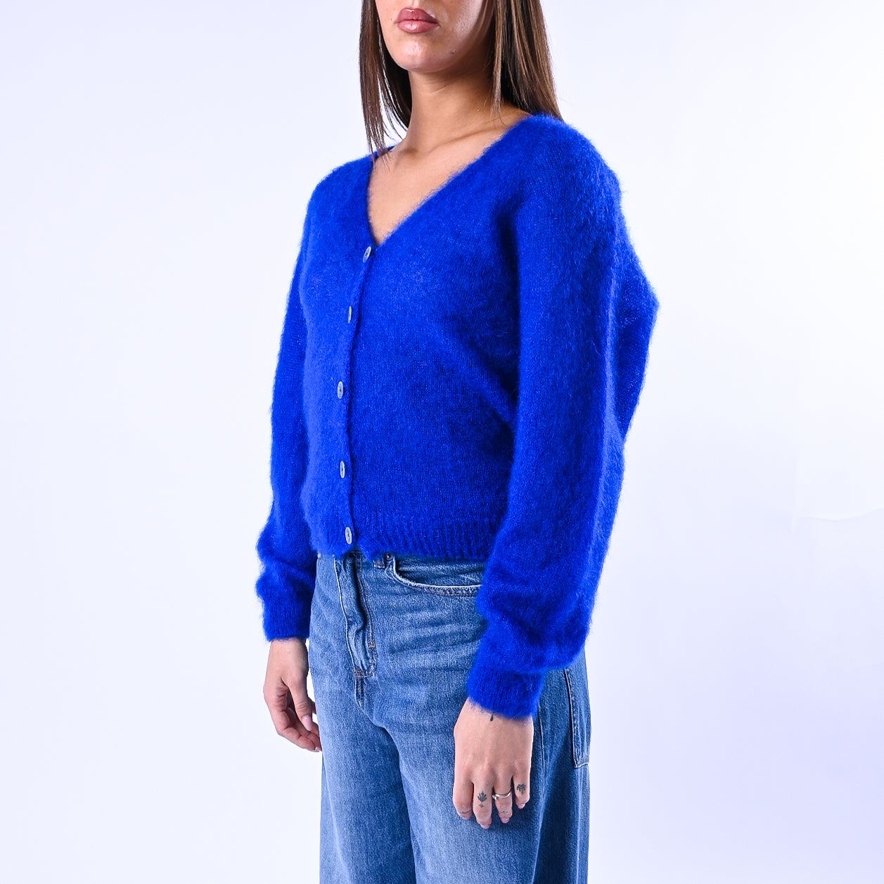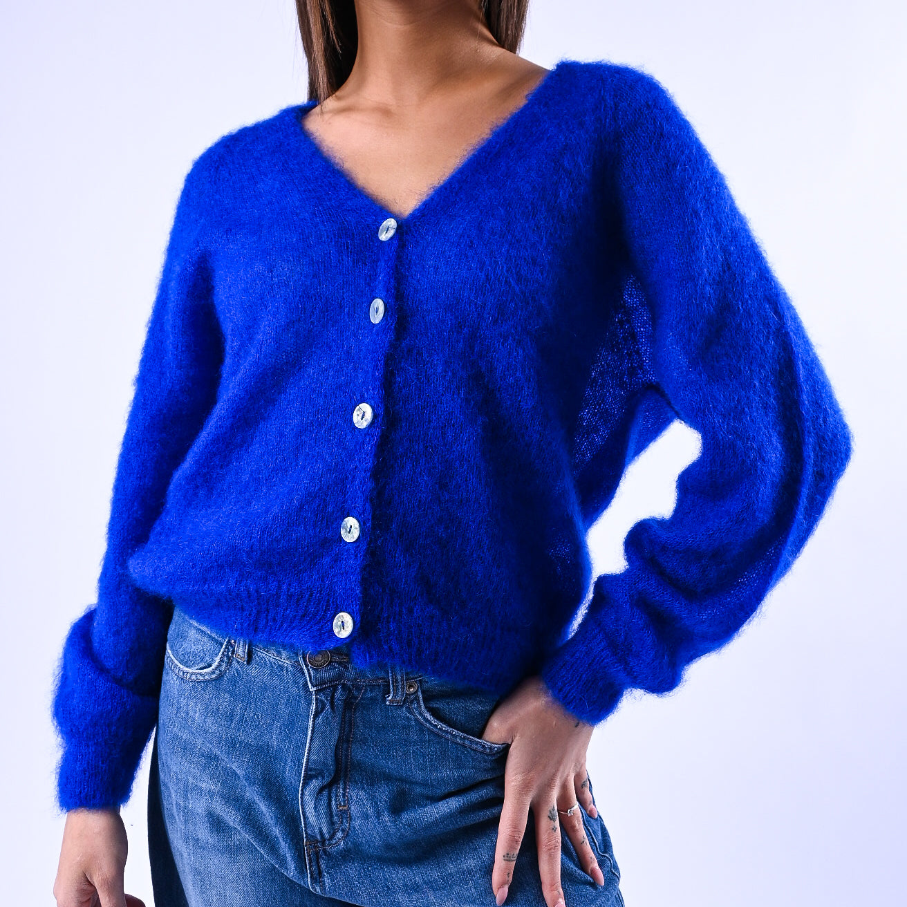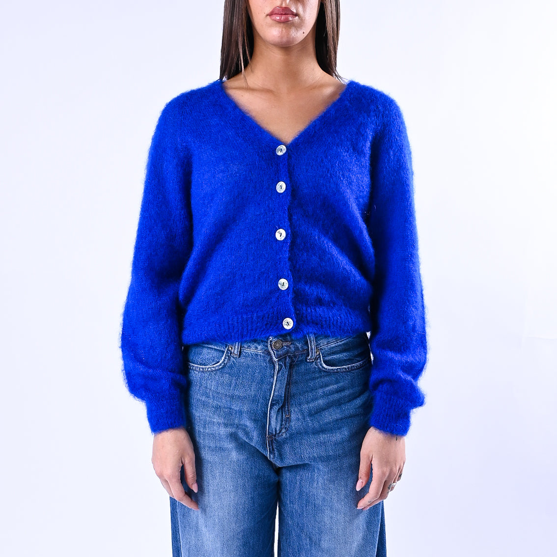 Prezzo normale €39,95Cardigan kid mohair extralight, con bottoni madre perla, colore bluette