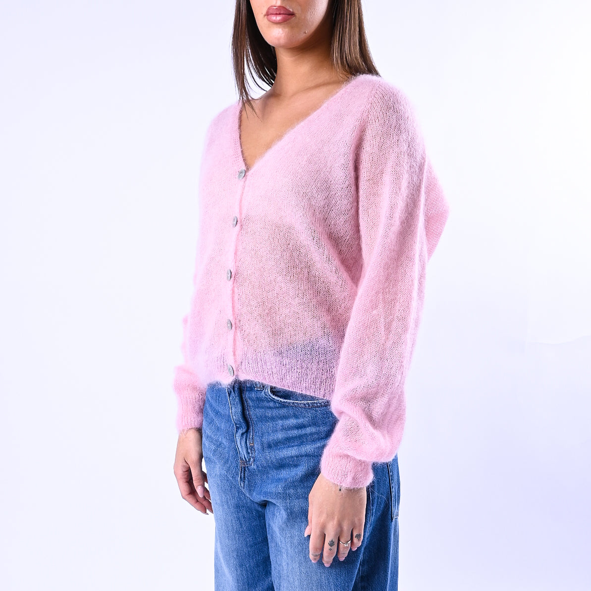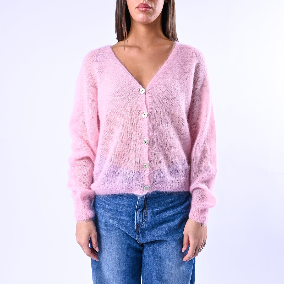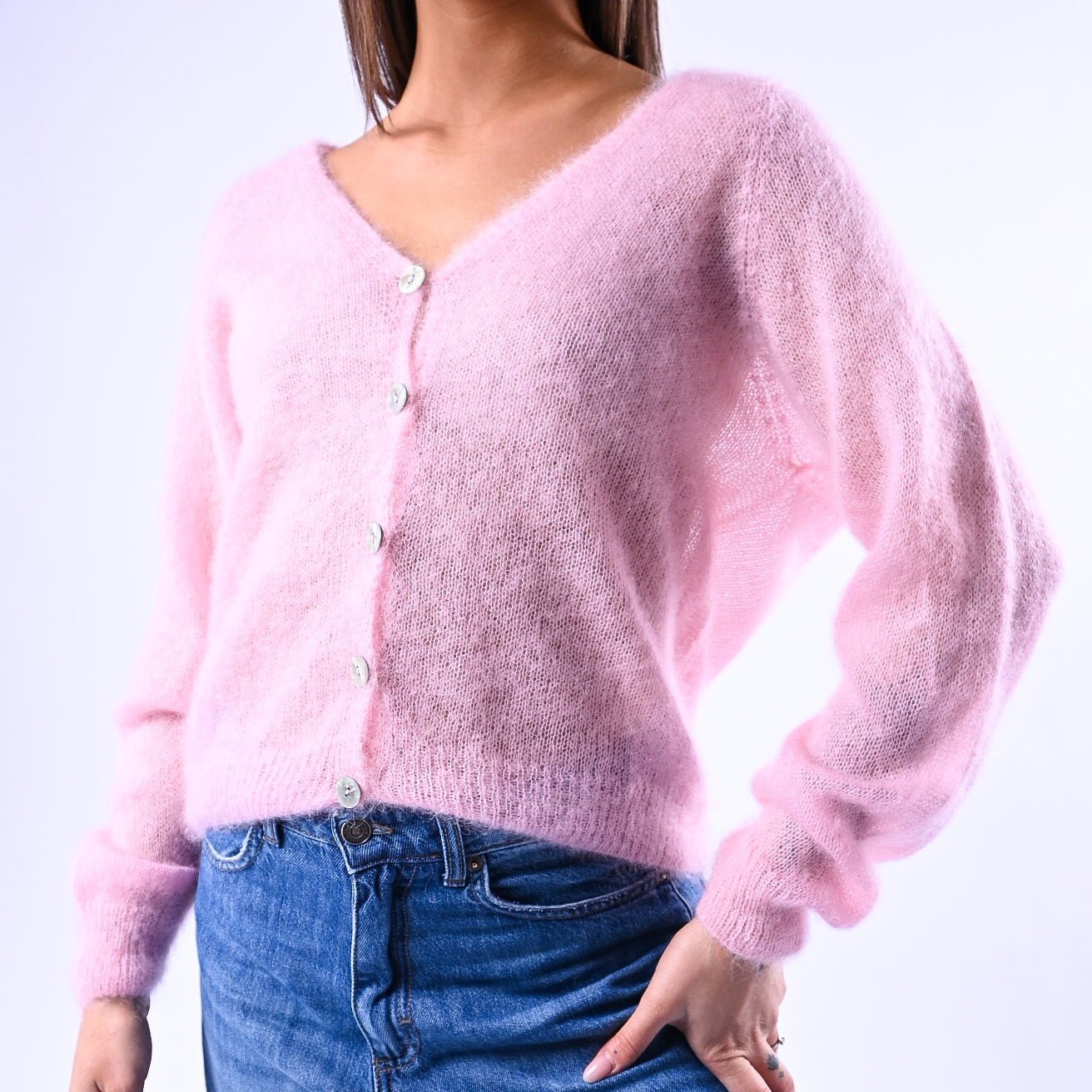 Prezzo normale €39,95Cardigan kid mohair extralight, con bottoni madre perla, colore rosa