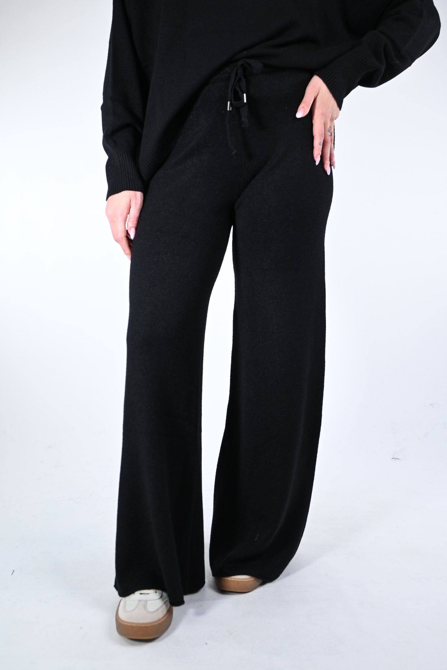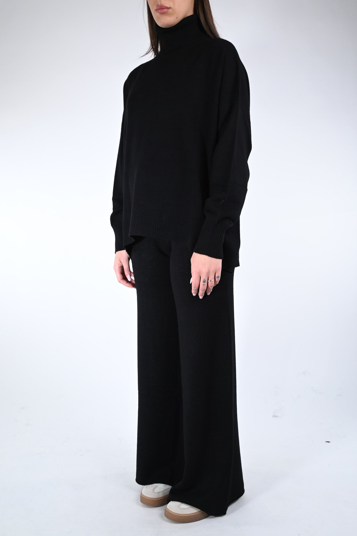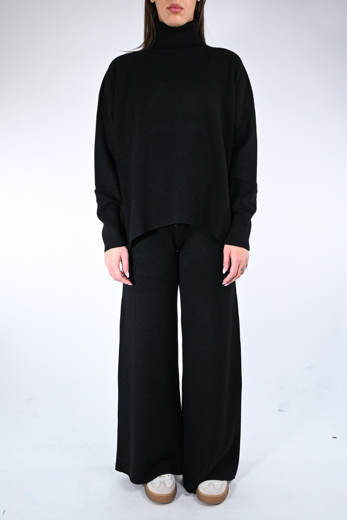 Prezzo normale €54,50Completo in maglia dolcevita con pantalone palazzo con coulisse in vita, elasticizzato, colore nero