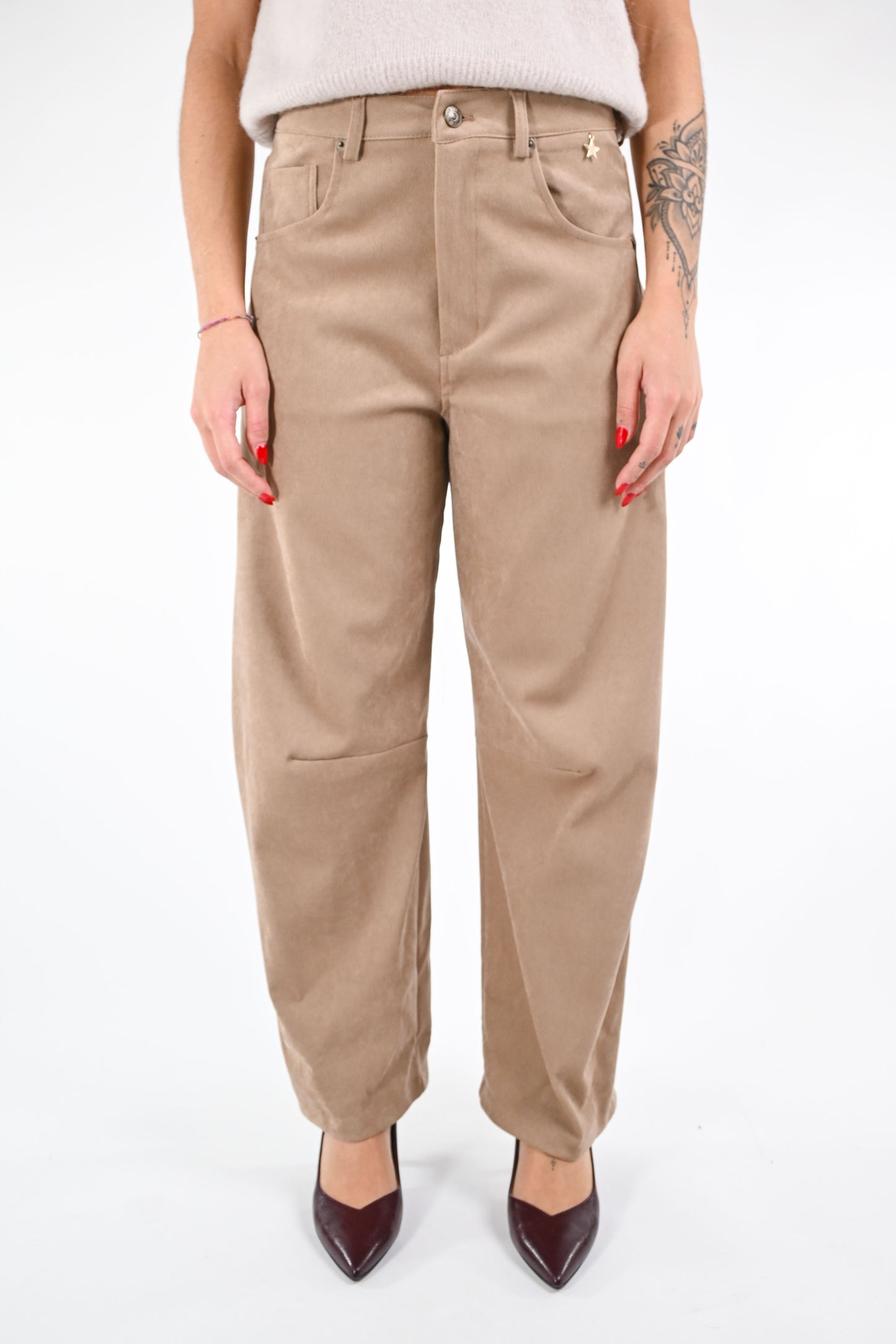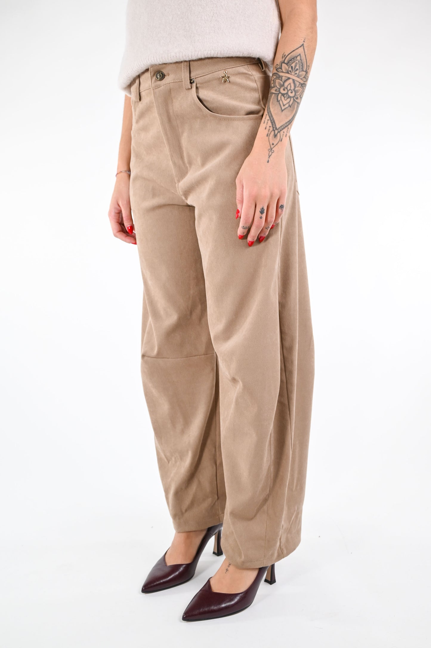 Pantalone modello Gaia in velluto liscio, con cucitura sulle ginocchia, colore cammello