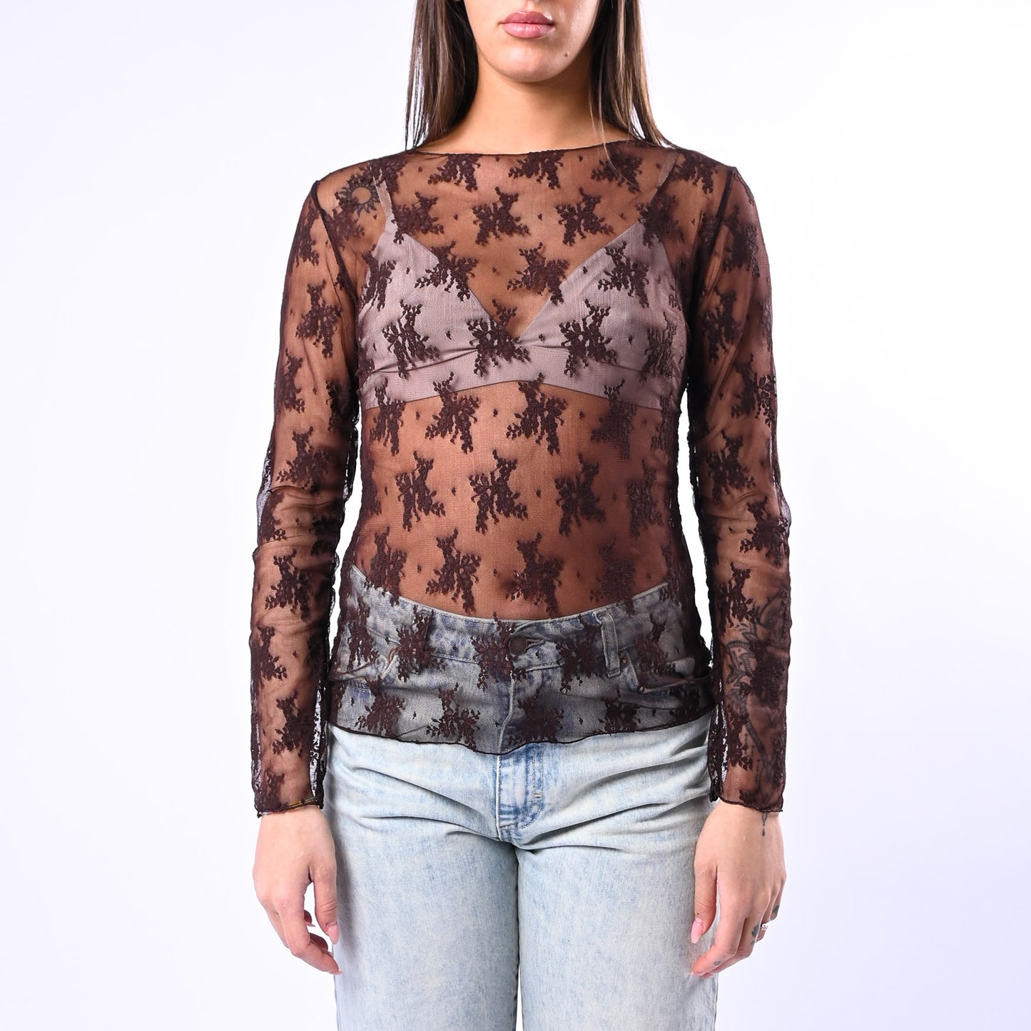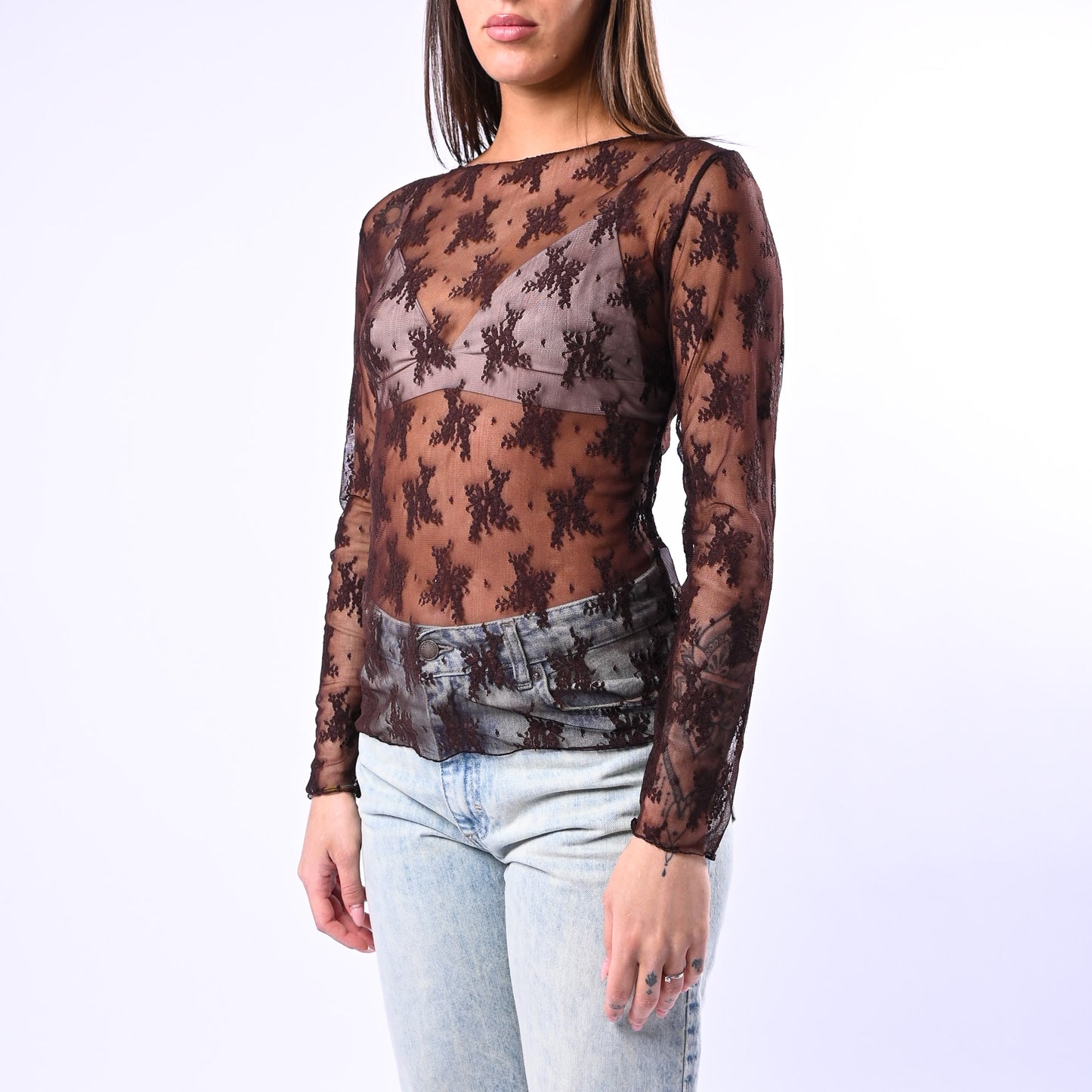 Blusa in pizzo con scollo barchetta che incornicia delicatamente le spalle, perfetta per creare look sofisticati sia di giorno che di sera. La manica lunga e il tessuto elasticizzato garantiscono comfort e una vestibilità.