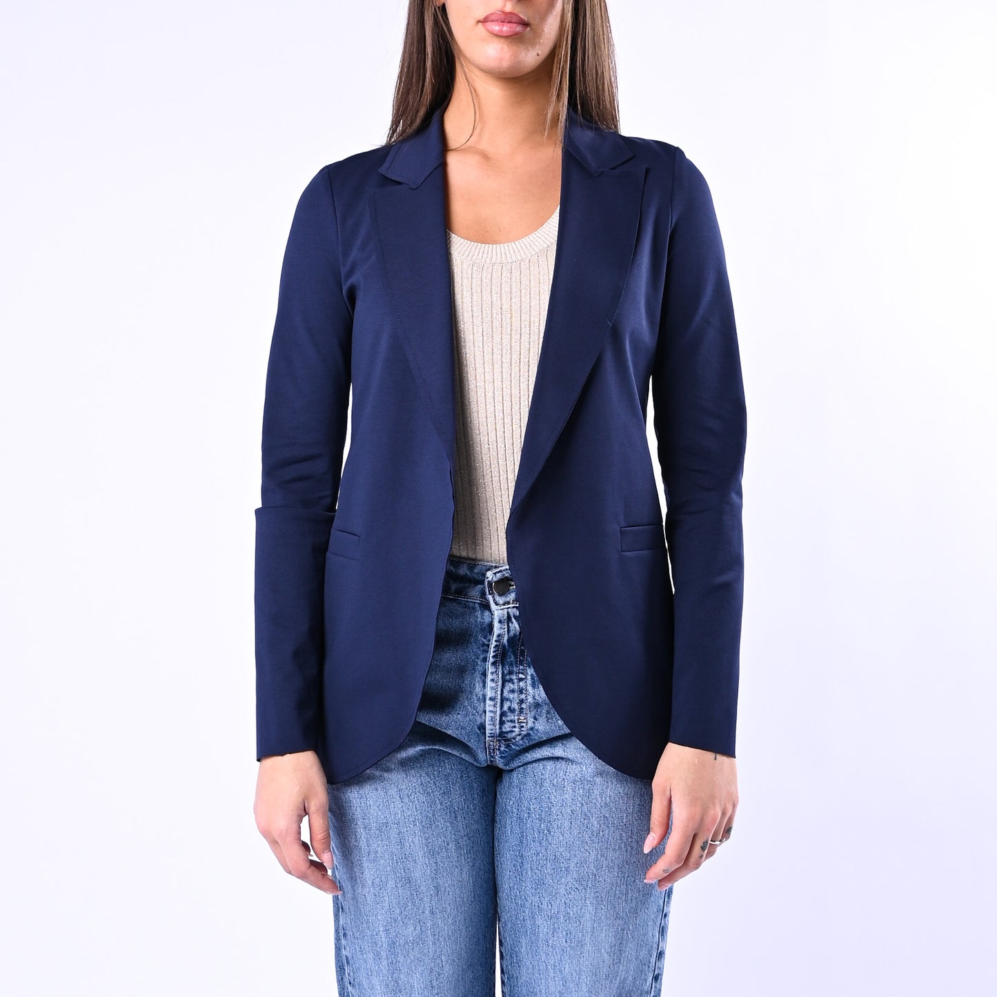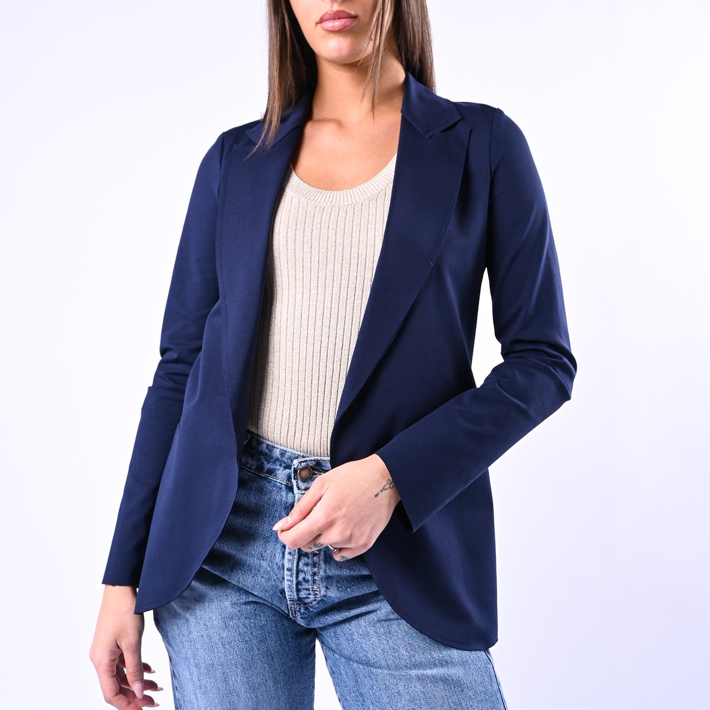 Giacca Easy in punto Milano elasticizzato dal taglio vivo e minimalista, senza bottoni per uno stile contemporaneo e versatile. Perfetta per chi ricerca comfort e eleganza in un capo dal design essenziale e facile da indossare.