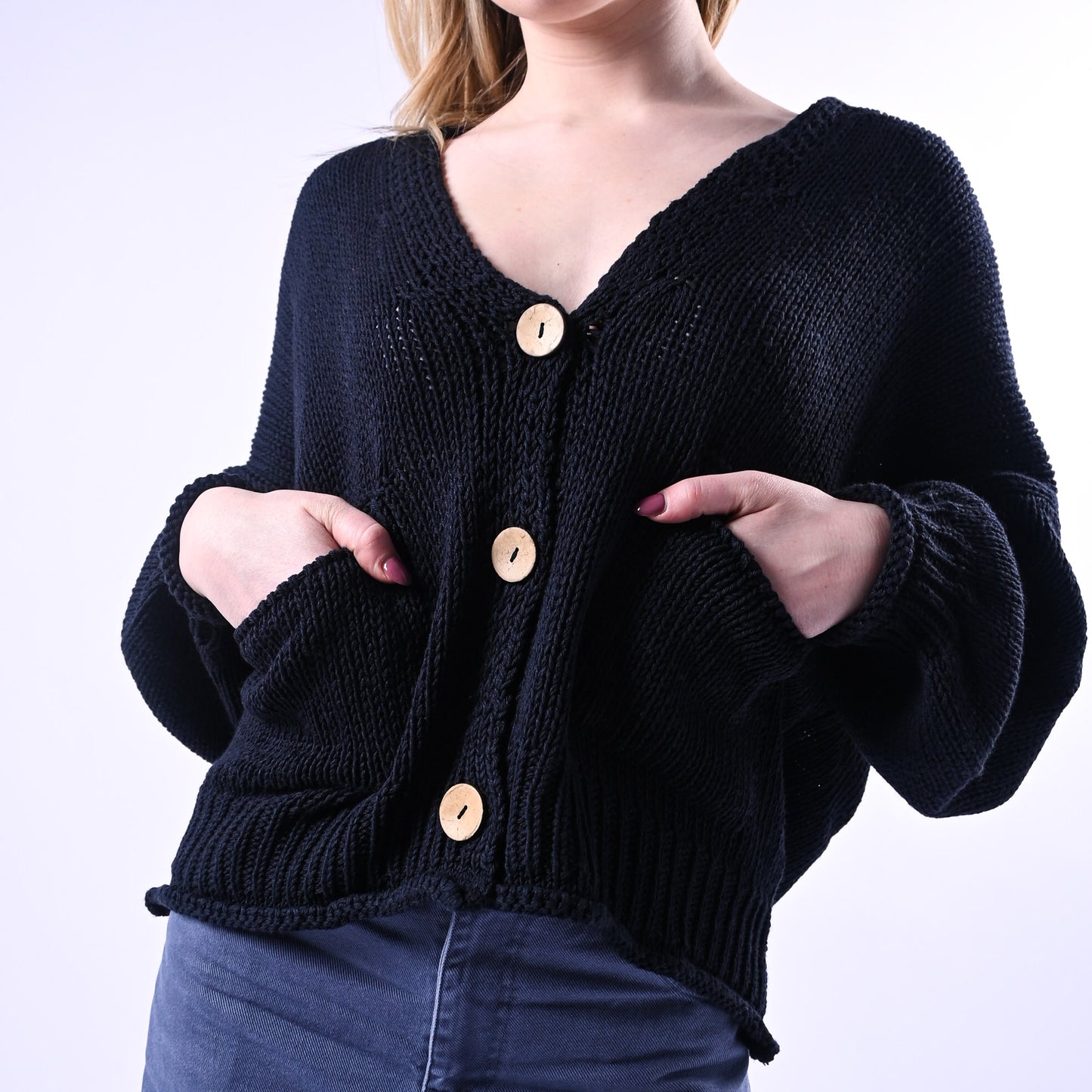 Cardigan over con bottoni in legno naturale e tasche funzionali. Perfetto per uno stile casual-chic che unisce comfort e eleganza senza compromessi.