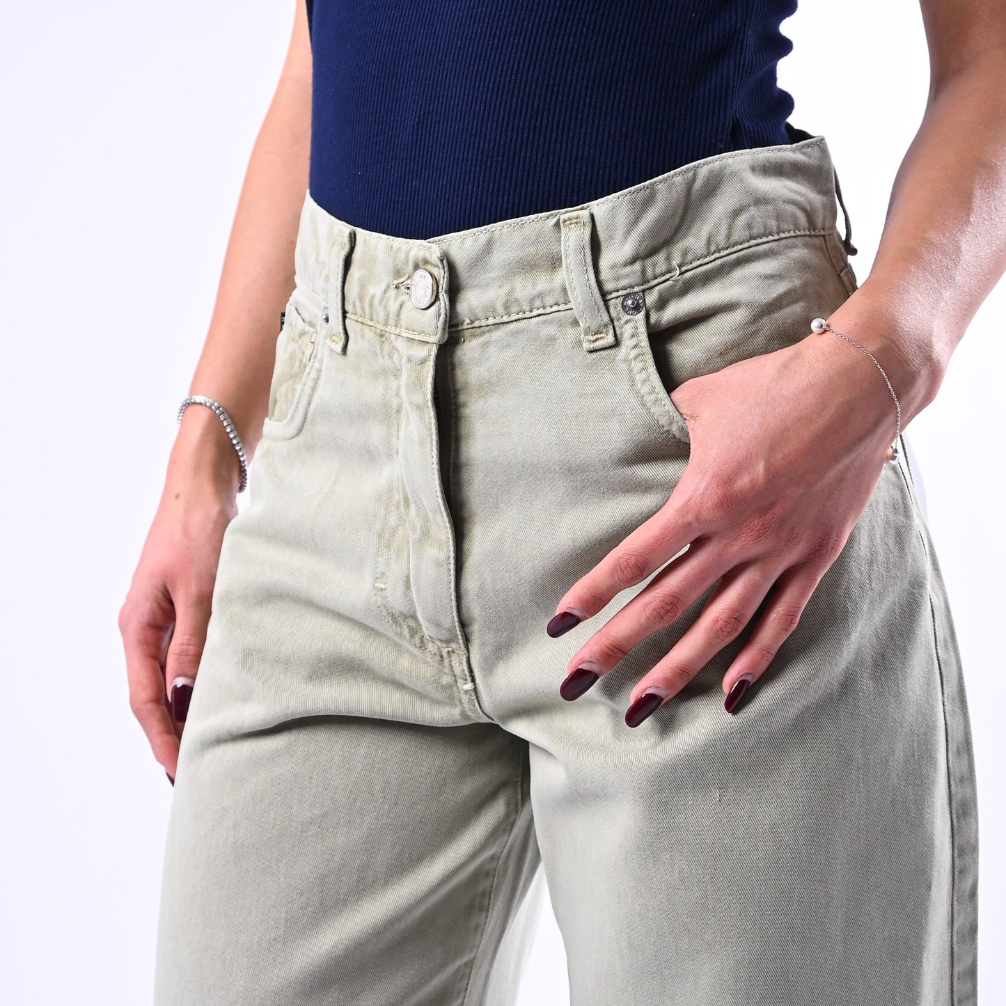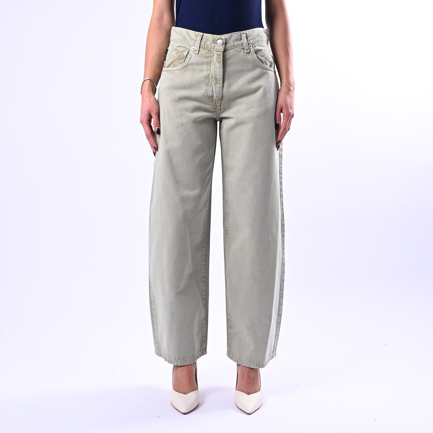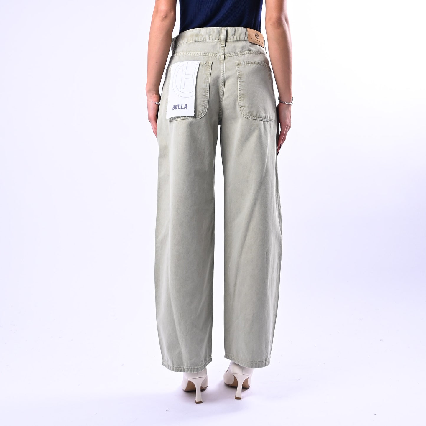 Pantalone Bella in gabardiana leggera con cinque tasche e dettagli ricercati, perfetto per uno stile sofisticato e versatile. La tonalità acidato verde salvia conferisce un carattere distintivo.