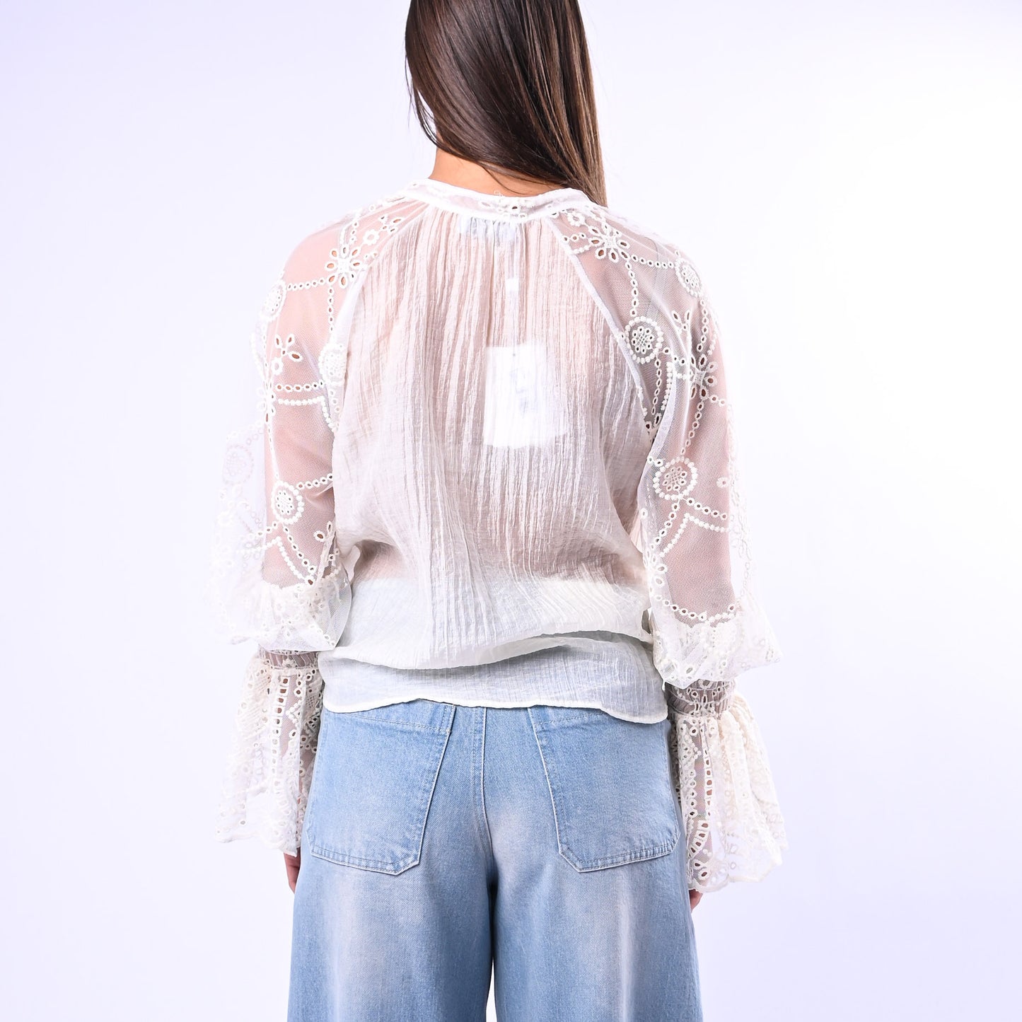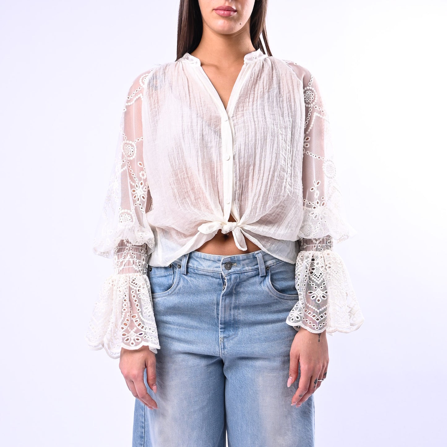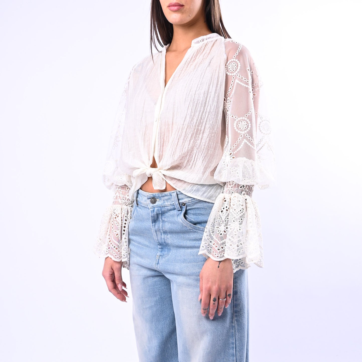 Camicia elegante in lyocell con colletto alla coreana e maniche in pizzo a sbuffo. Versatile e raffinata, può essere indossata aperta con un nodo per un look contemporaneo e sofisticato.