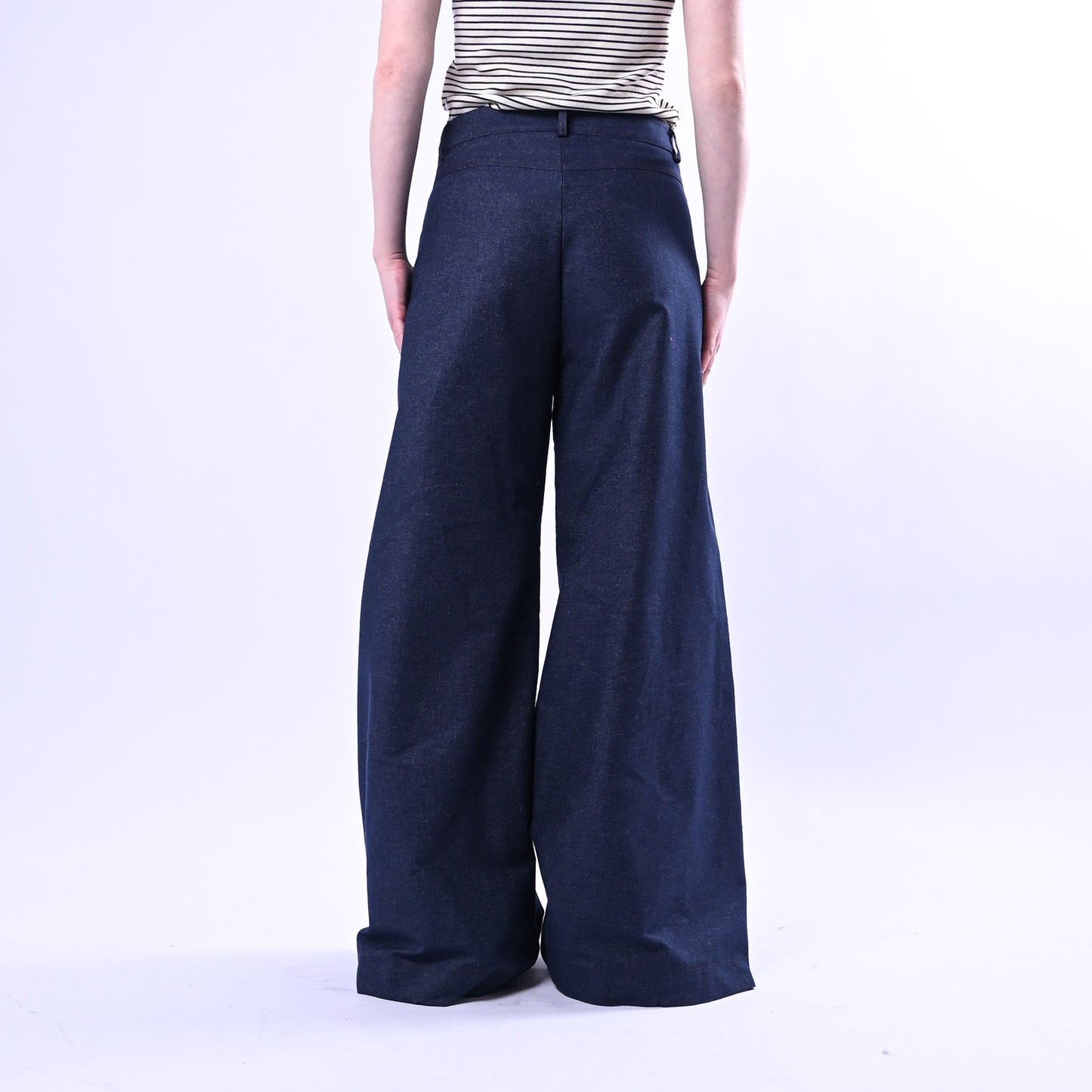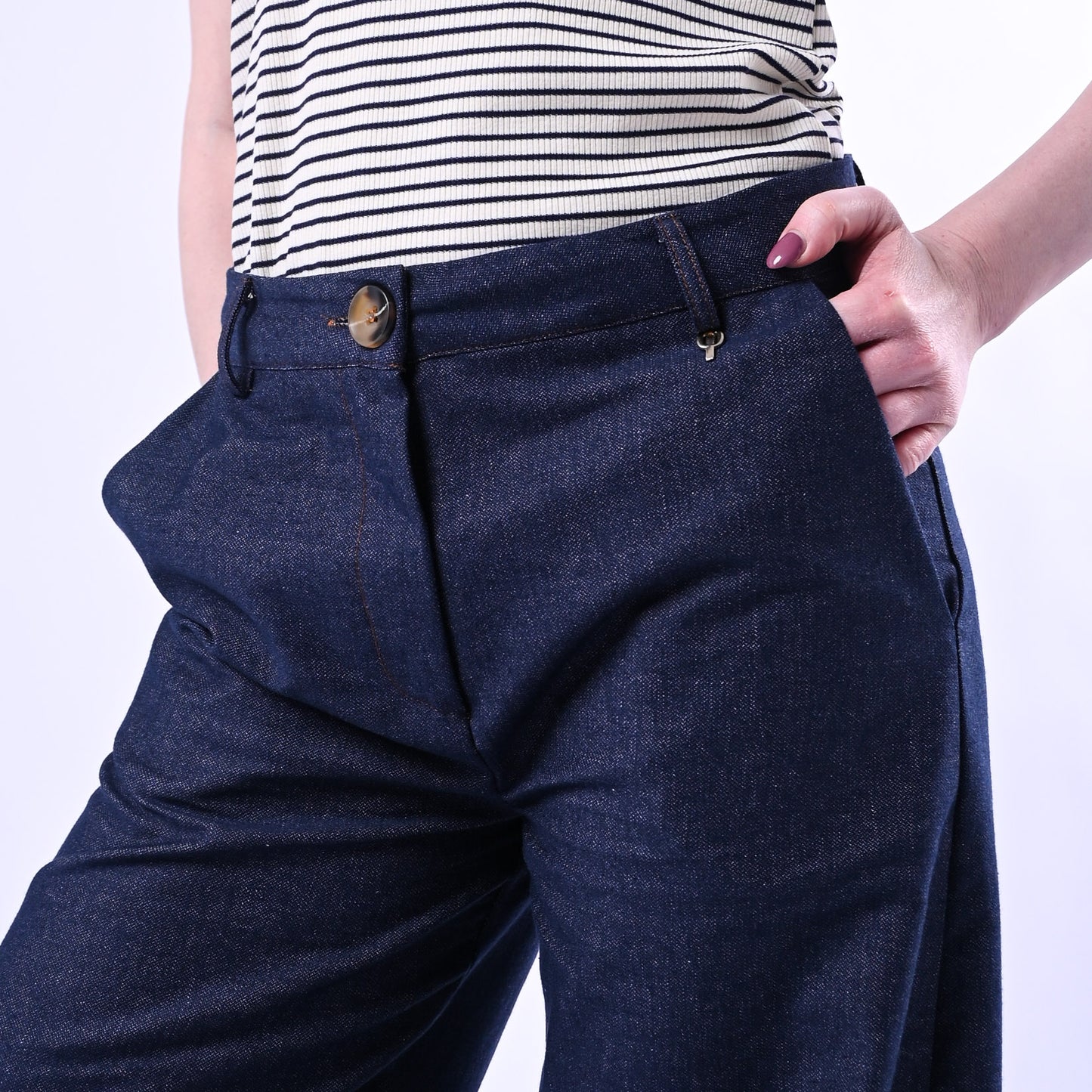 Pantalone palazzo in chambray denim scuro, taglio ampio e confortevole per uno stile sofisticato e versatile. Abbinabile alla camicia coordinata della collezione per un look curato e coordinato.