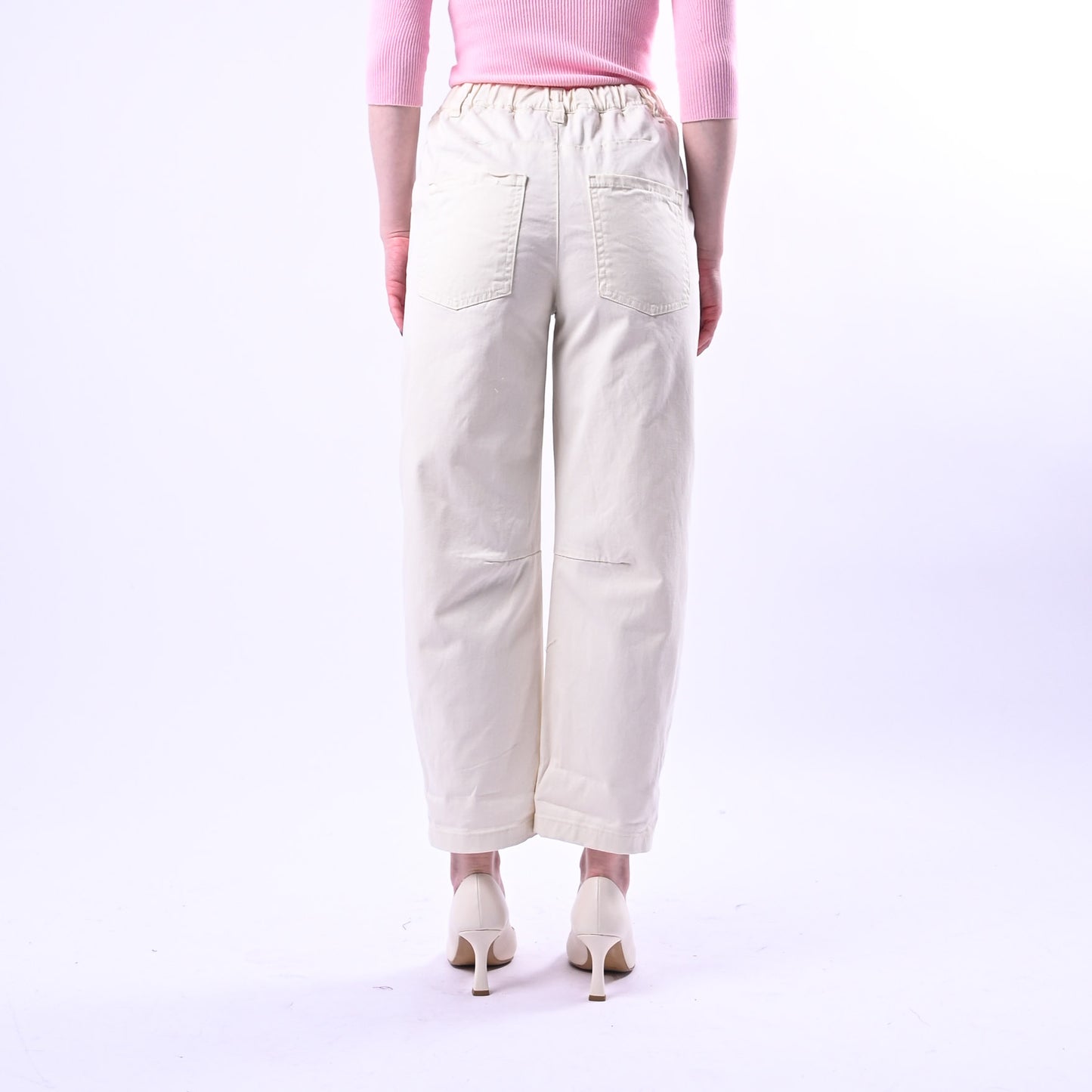 Pantalone barrel con elastico in vita sul dietro per massimo comfort e libertà di movimento. Realizzato in leggera gabardina con riprese strutturate.