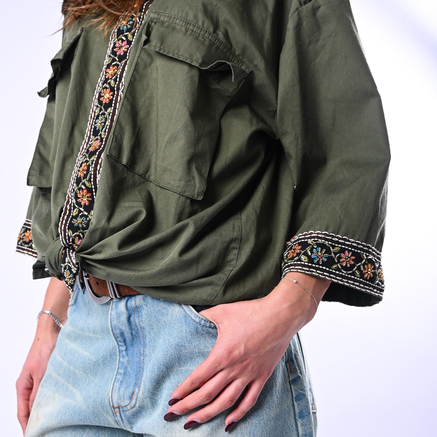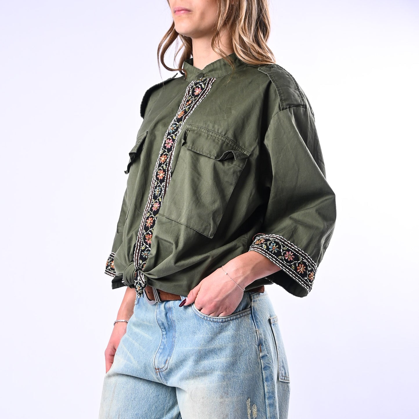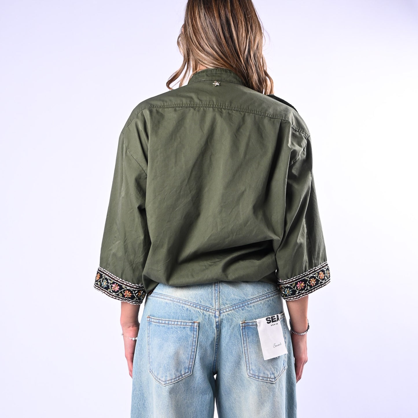 Giacca-camicia SOUVENIR in verde militare con dettagli di passamaneria che esaltano il design editoriale. Collo coreana e tasche applicate per uno stile contemporaneo e versatile.