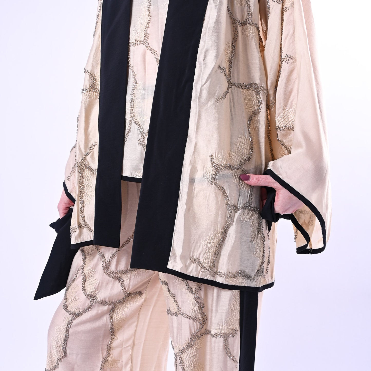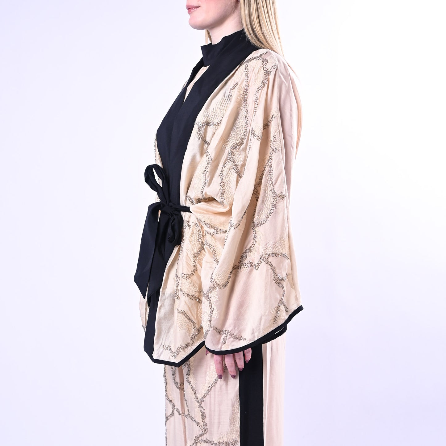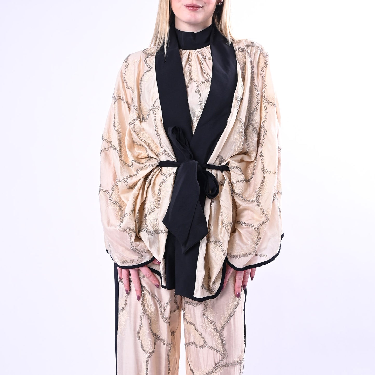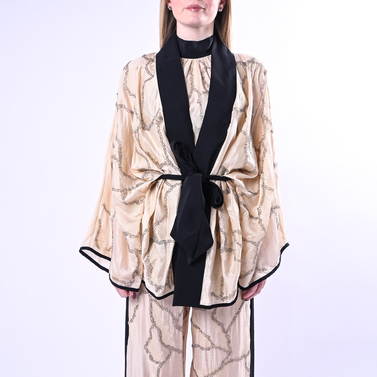 Kimono in tessuto pregiato con ricami e paillettes che catturano la luce, perfetto per chi ricerca un pezzo statement dal fascino bohémien. Completo di cintura abbinata.