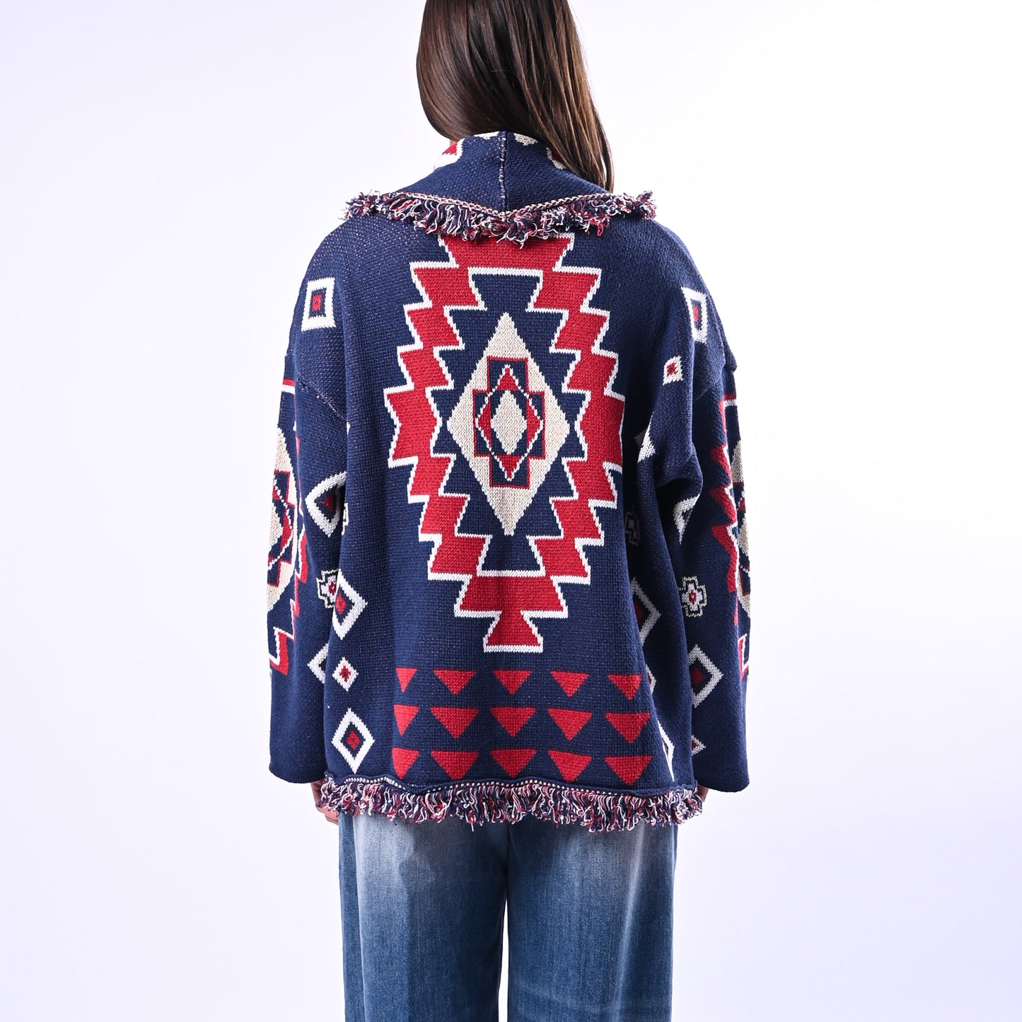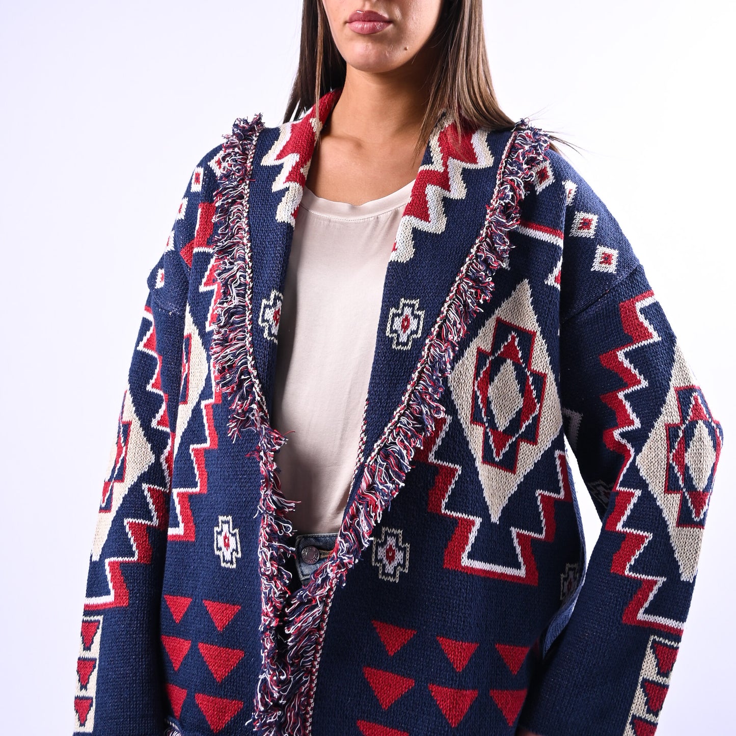 Cardigan Micol fantasia etnica con dettagli in frange che catturano movimento e personalità. Perfetto per chi ricerca un pezzo versatile che unisce stile bohemien e comfort, ideale da stratificare nelle transizioni di stagione.