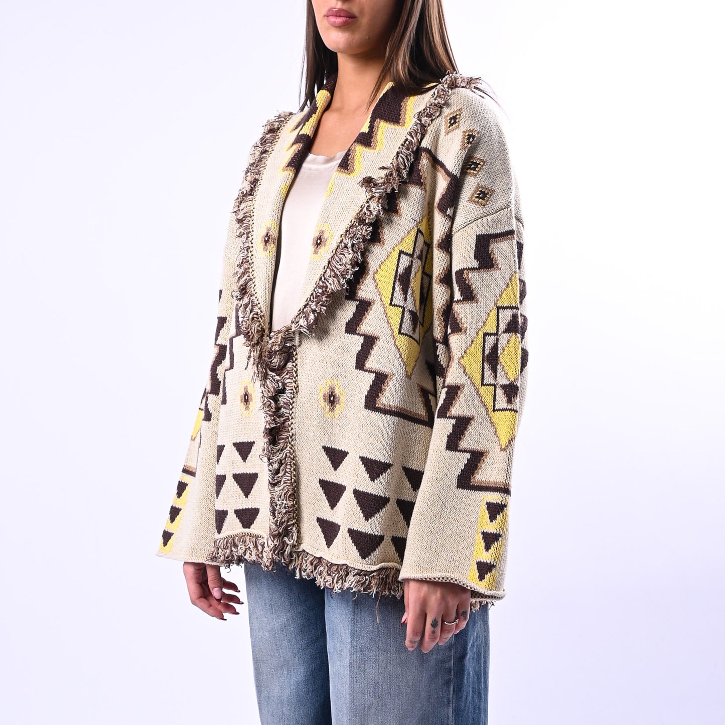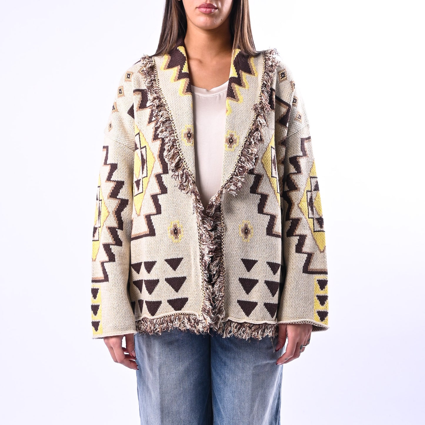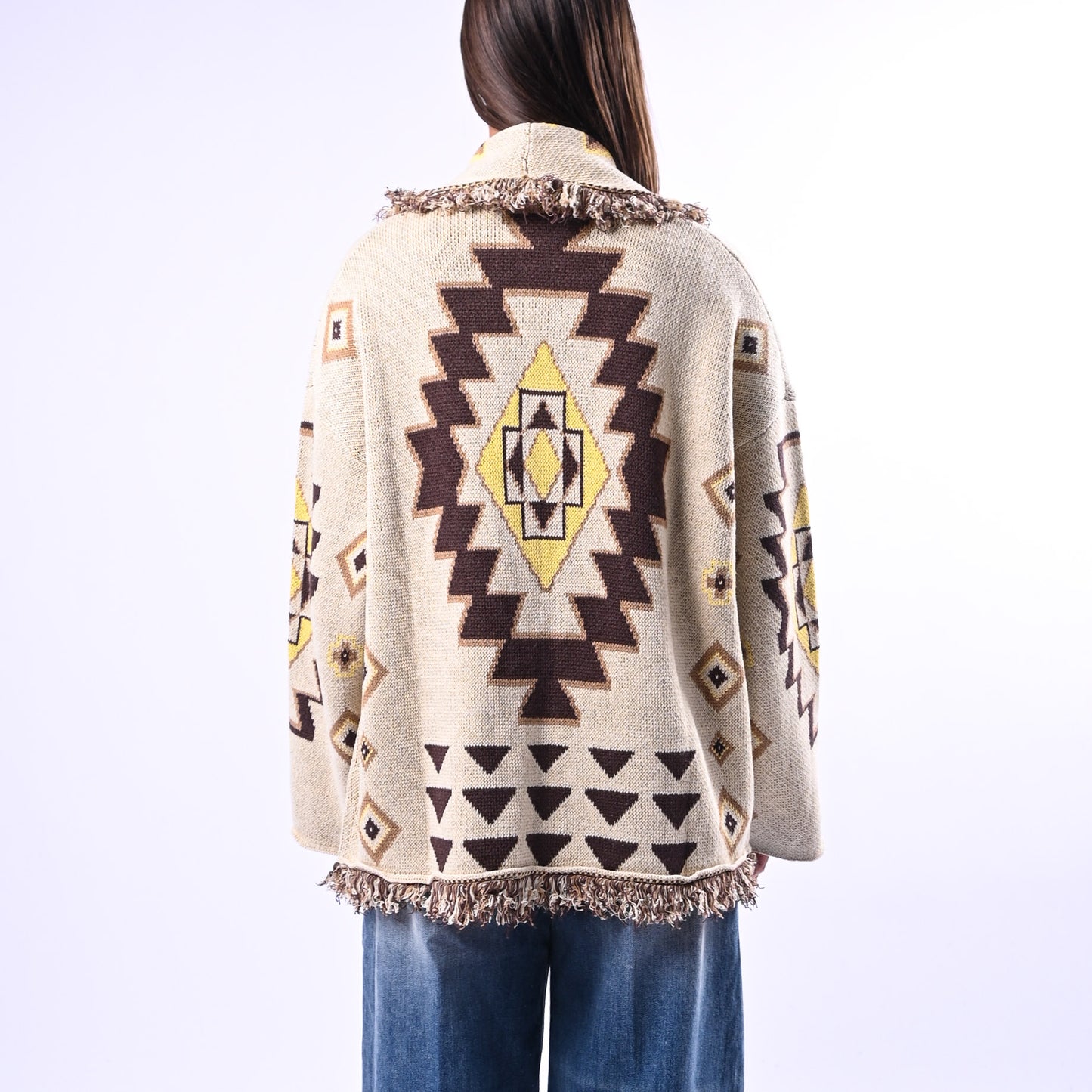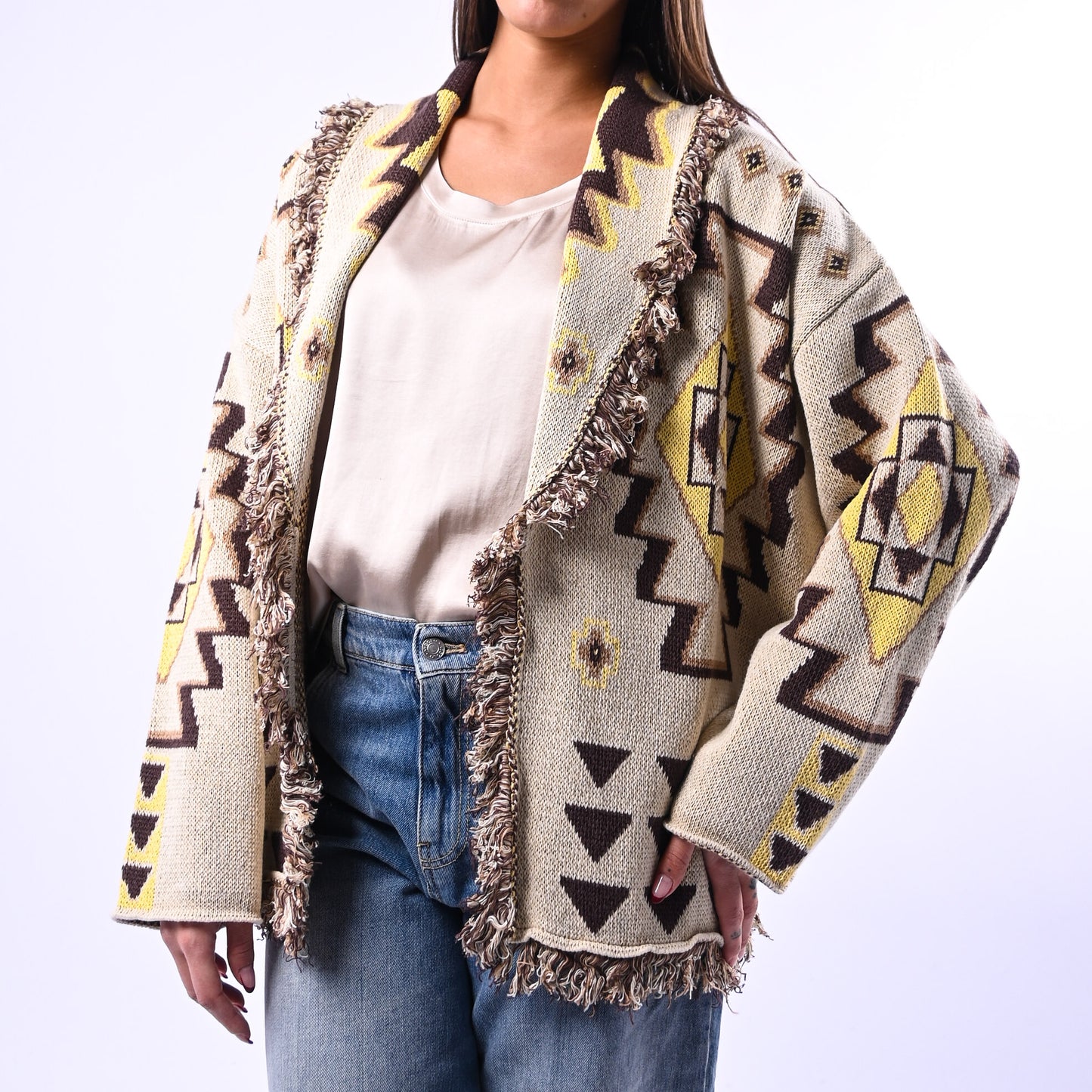 Cardigan Micol fantasia etnica con dettagli in frange che catturano movimento e personalità. Perfetto per chi ricerca un pezzo versatile che unisce stile bohemien e comfort, ideale da stratificare nelle transizioni di stagione.