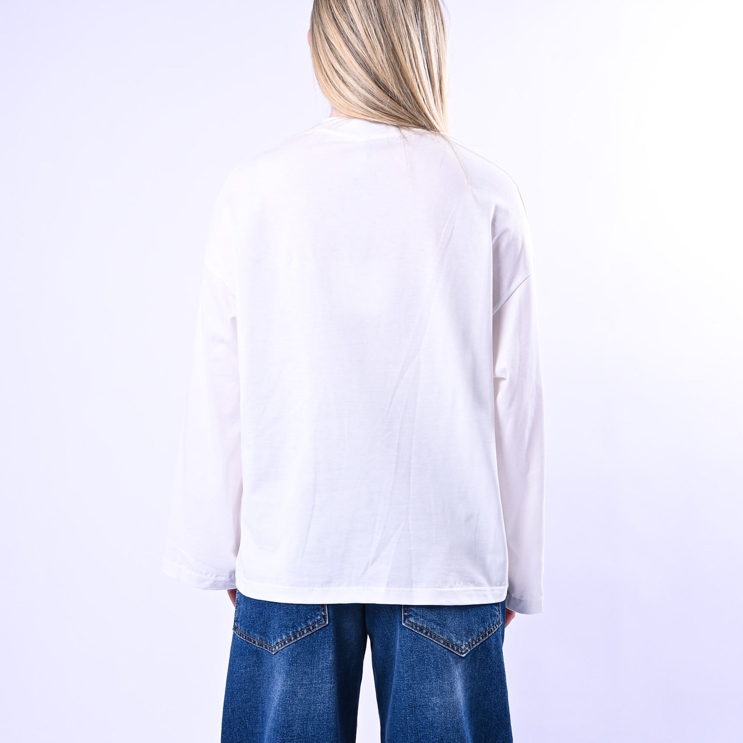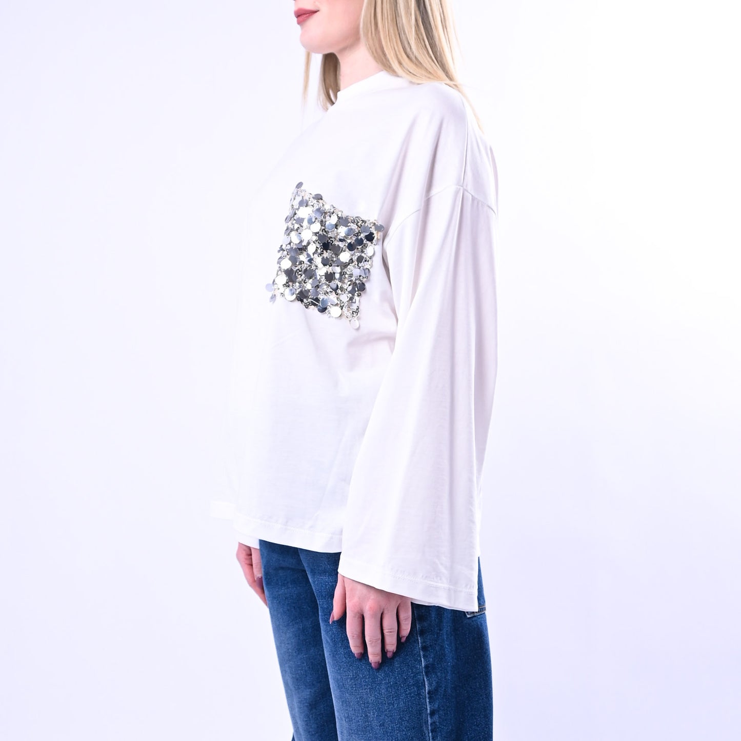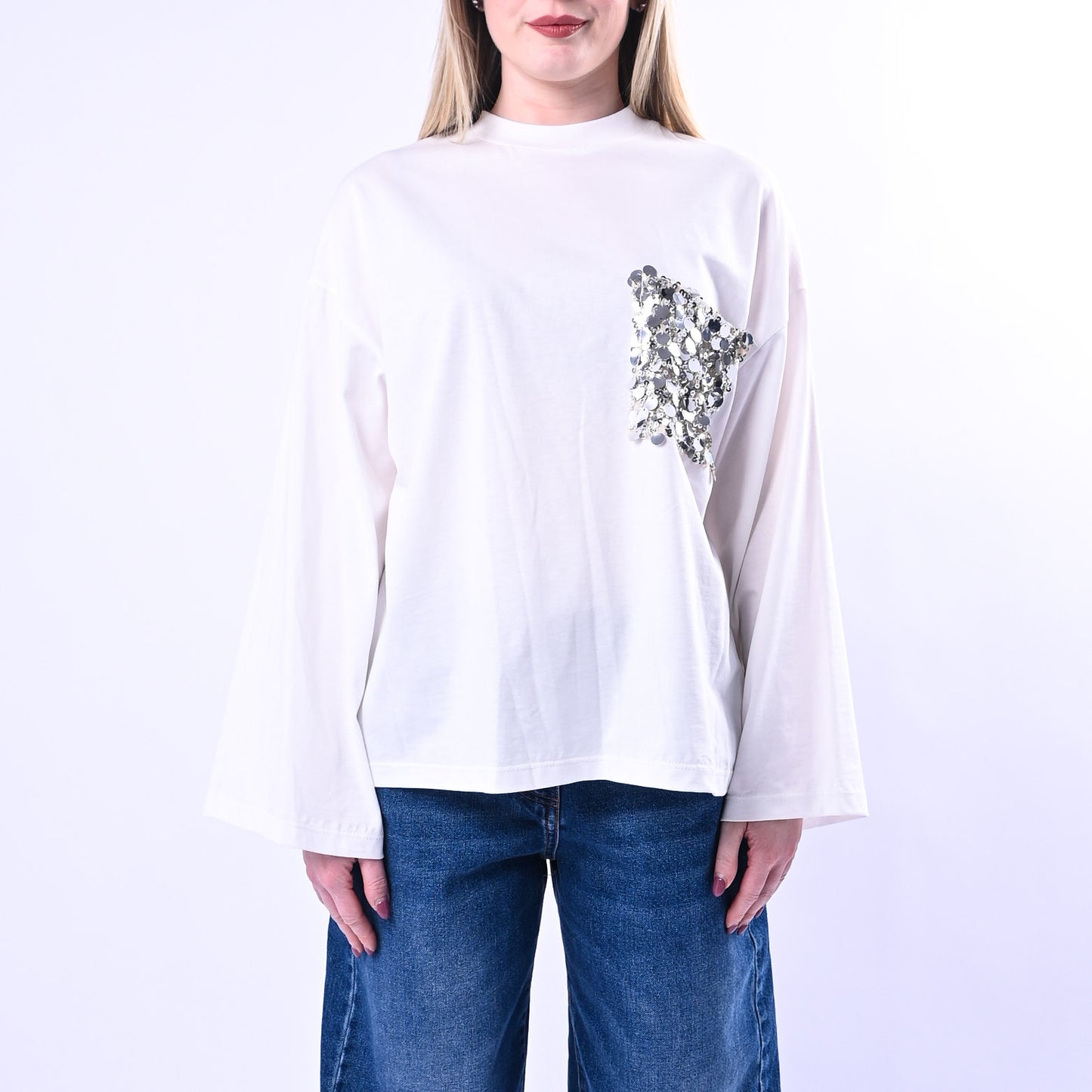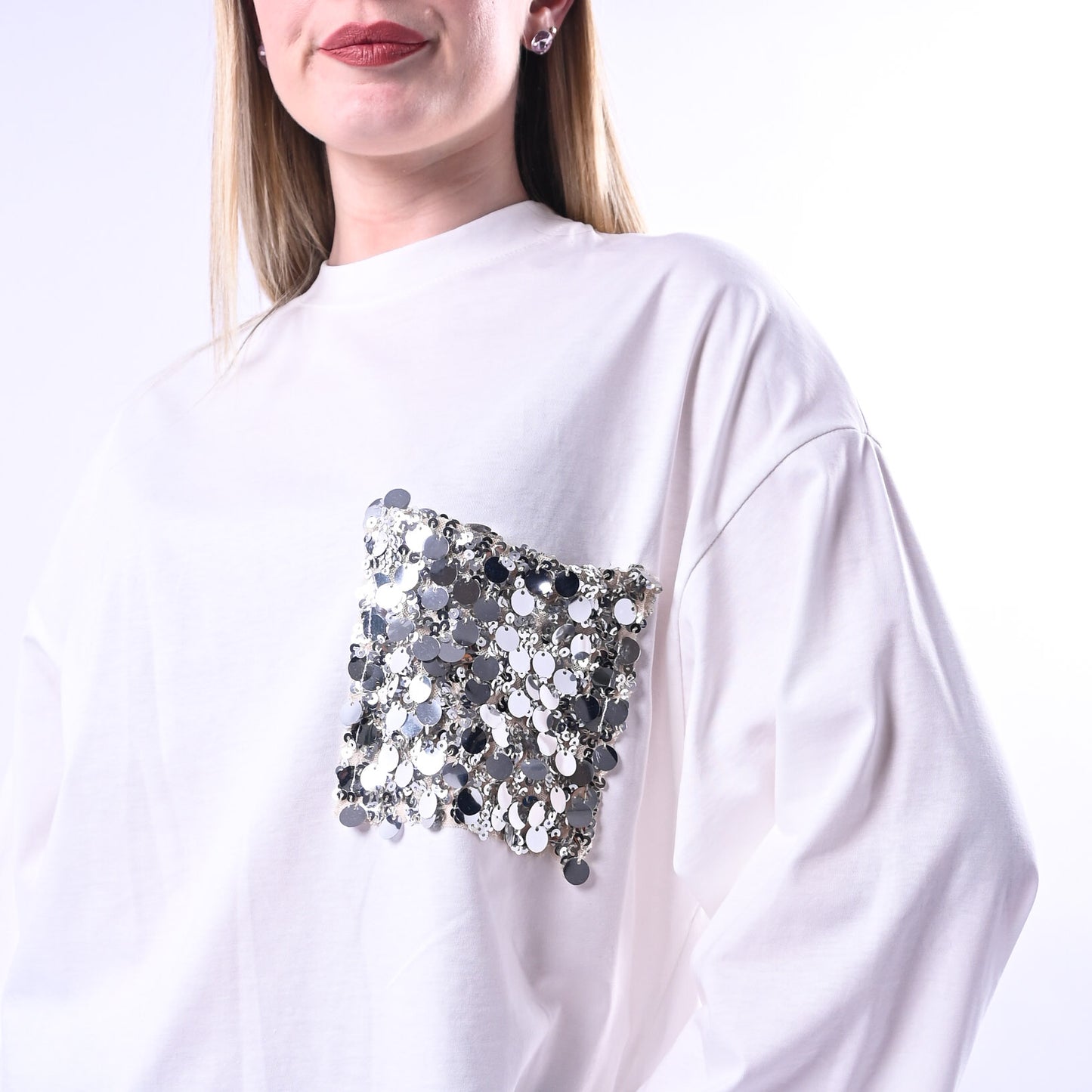 T-shirt oversize in cotone con manica lunga e larga e girocollo classico. Caratterizzata dalla tasca frontale decorata con paillettes che cattura la luce, perfetta per uno stile casual-chic con un tocco di brillantezza.