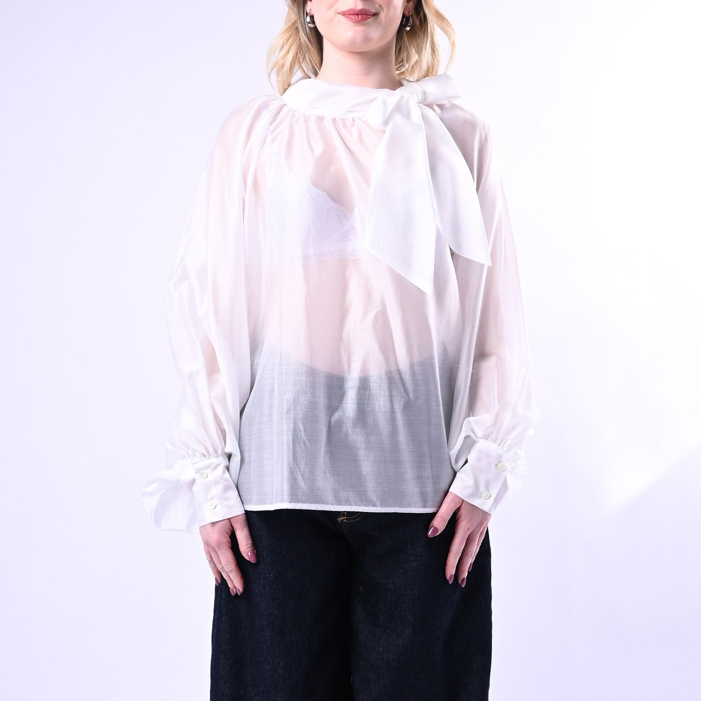 Camicia elegante in lyocell con fiocco al collo e maniche sbuffo, perfetta per uno stile sofisticato e femminile. Tessuto morbido e traspirante, ideale per la stagione primaverile ed estiva.
