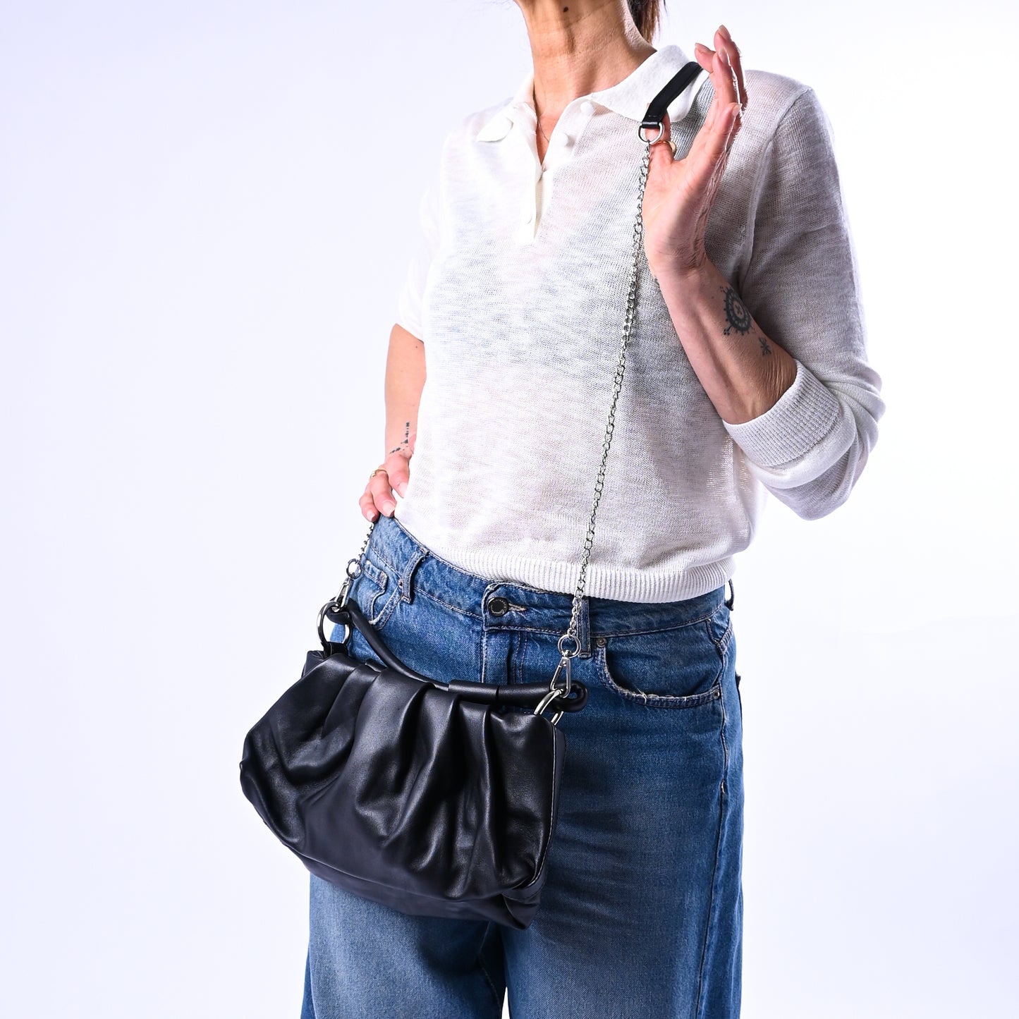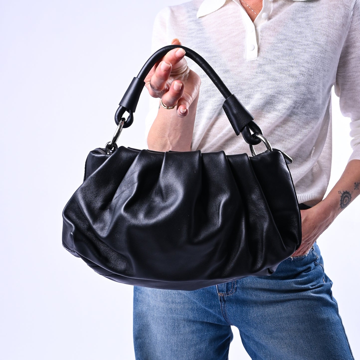 Borsetta bauletto in morbida nappa con dettagli arricciati che aggiungono carattere e movimento al design. Dotata di tracolla pratica e zip di chiusura, è l'accessorio essenziale per chi ama la semplicità elegante.
