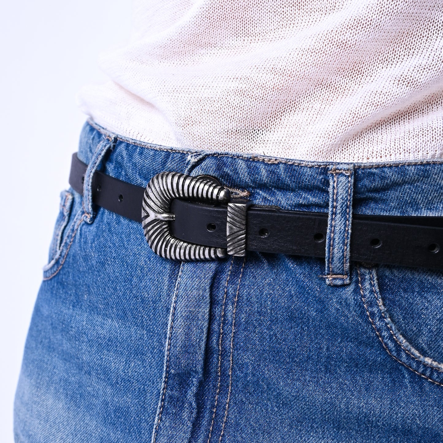 Cintura in pelle nera con fibbia western in argento anticato, dal design audace e versatile. Perfetta per completare look casual e rock, garantisce qualità artigianale e comfort durante tutto il giorno. Con possibilità di accorciare la cintura dalla fibbia