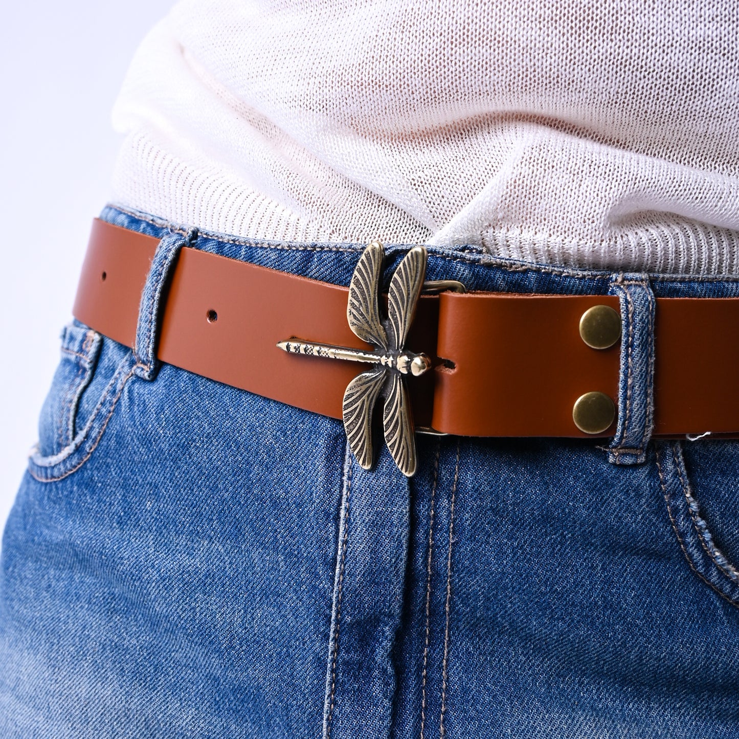 Cintura realizzata in pelle di qualità con fibbia in ottone che raffigura una delicata libellula. Un pezzo essenziale dal design distintivo, ideale per valorizzare il tuo stile quotidiano.