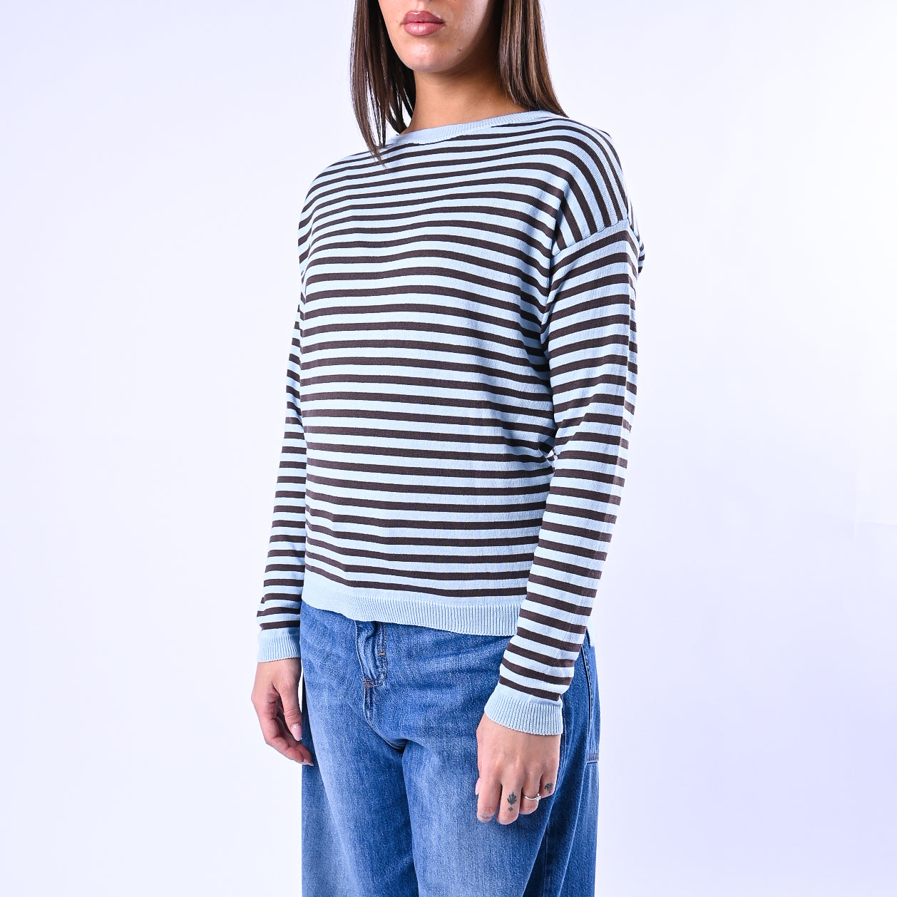 Maglia a righe in cotone puro, leggera e confortevole, con scollo barchetta che scende dolcemente sulle spalle. Gli spacchetti laterali regalano libertà di movimento, perfetta per uno stile casual e senza tempo.