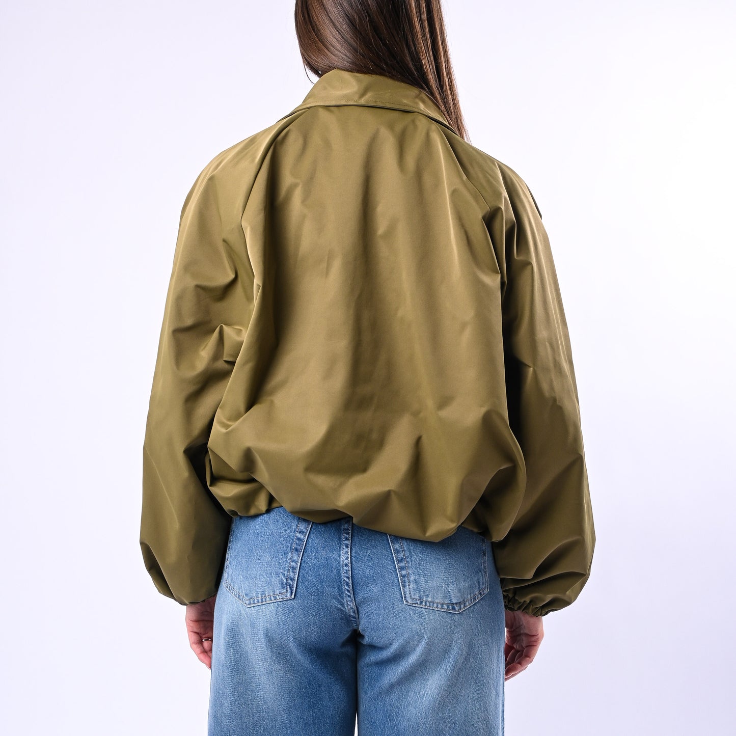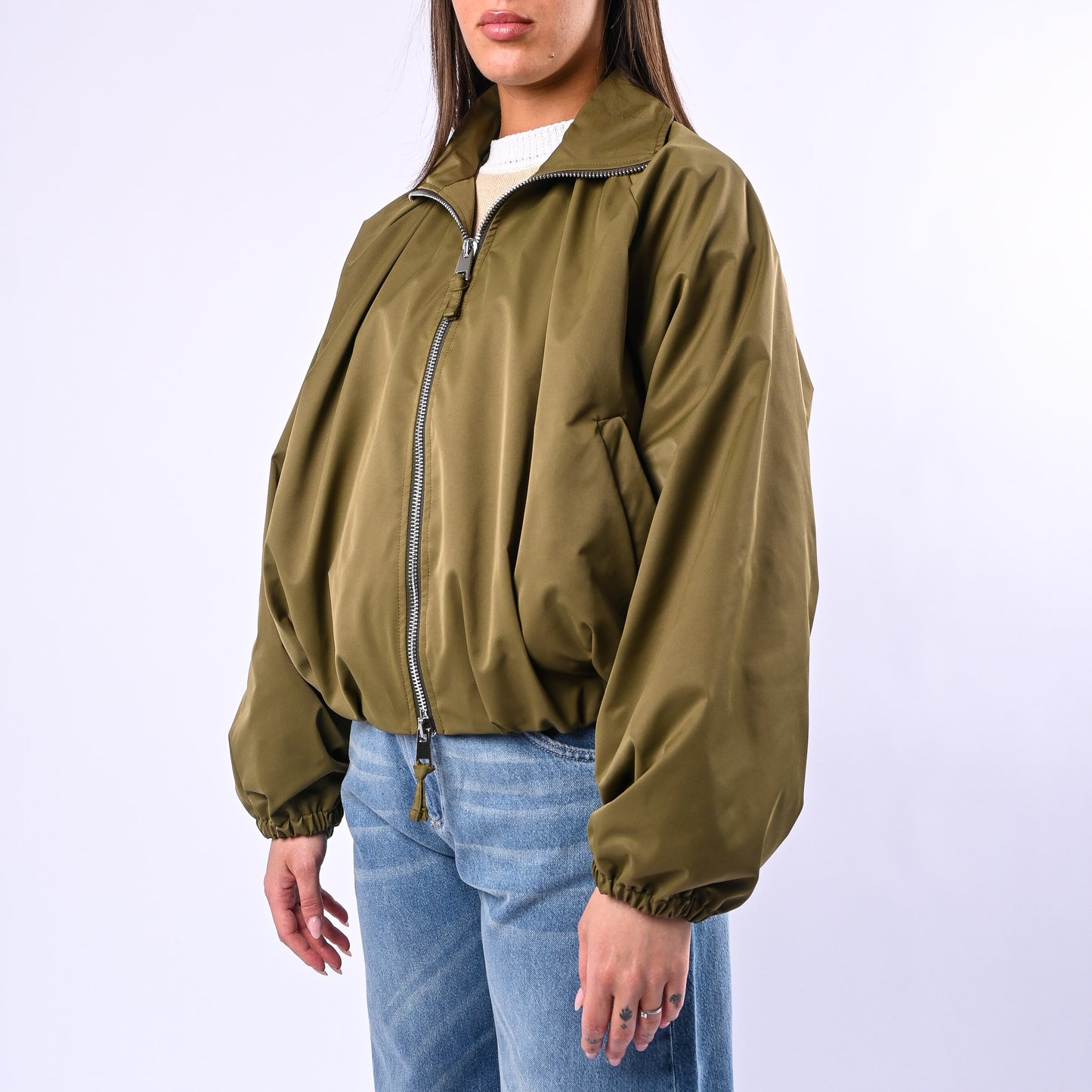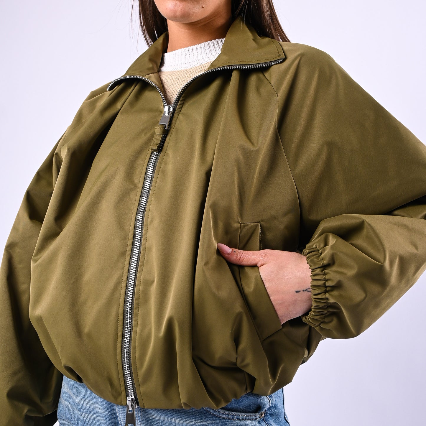 Bomber over in tessuto tecnico con chiusura a zip, tasche laterali e dettagli arricciati su polsi e orlo inferiore. La fodera interna garantisce comfort e protezione, ideale per un look casual e contemporaneo.