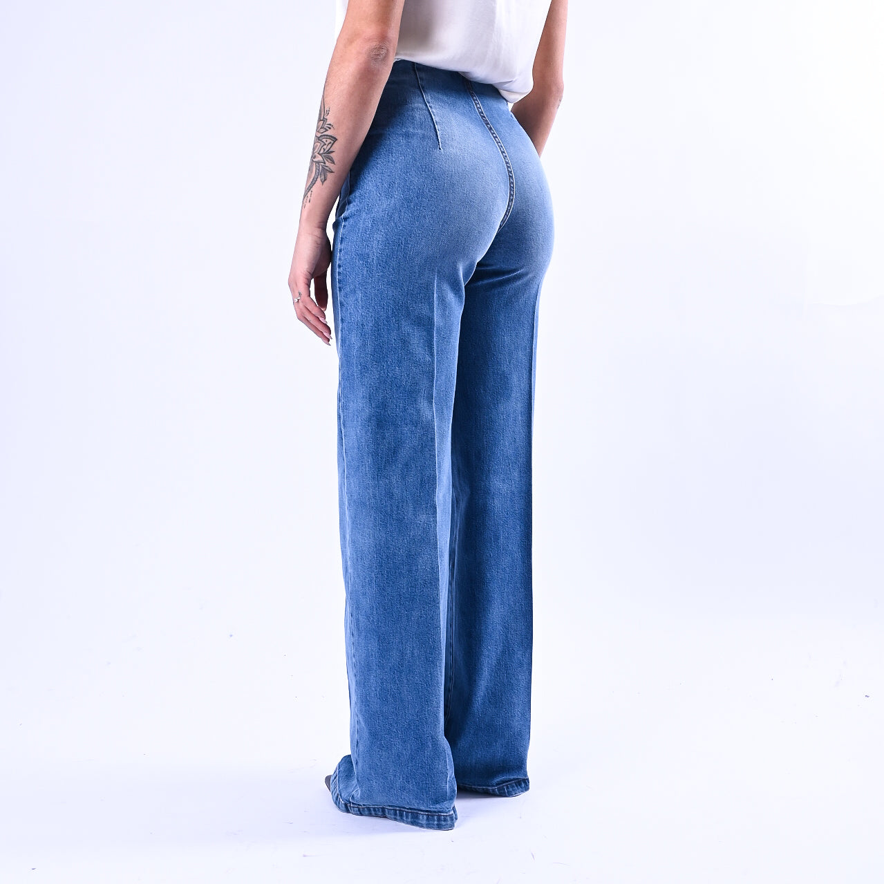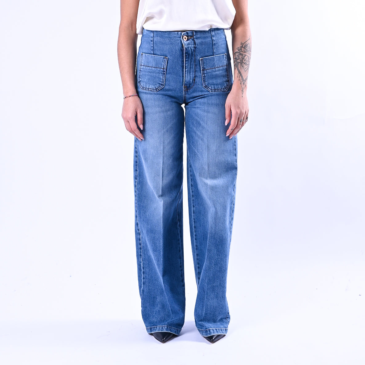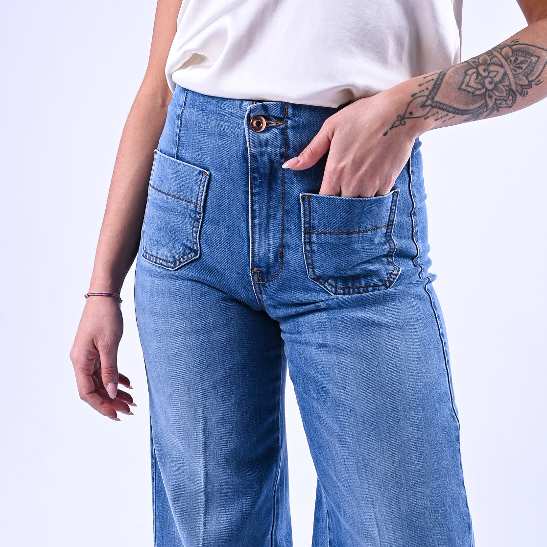 Jeans palazzo in denim elasticizzato con tasche frontali generose, perfetto per uno stile comodo e versatile. Lavaggio medio che esalta la texture naturale del tessuto.