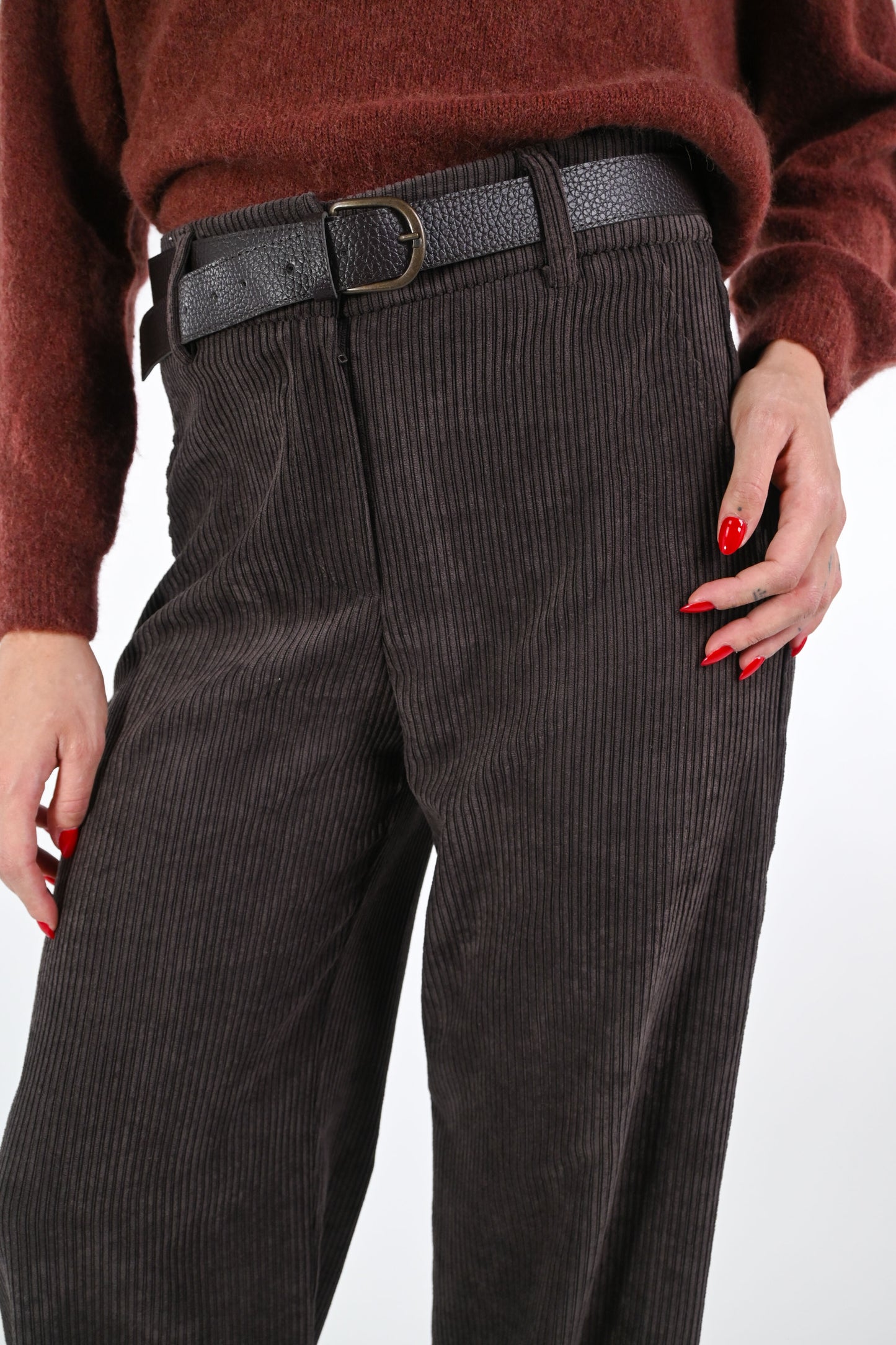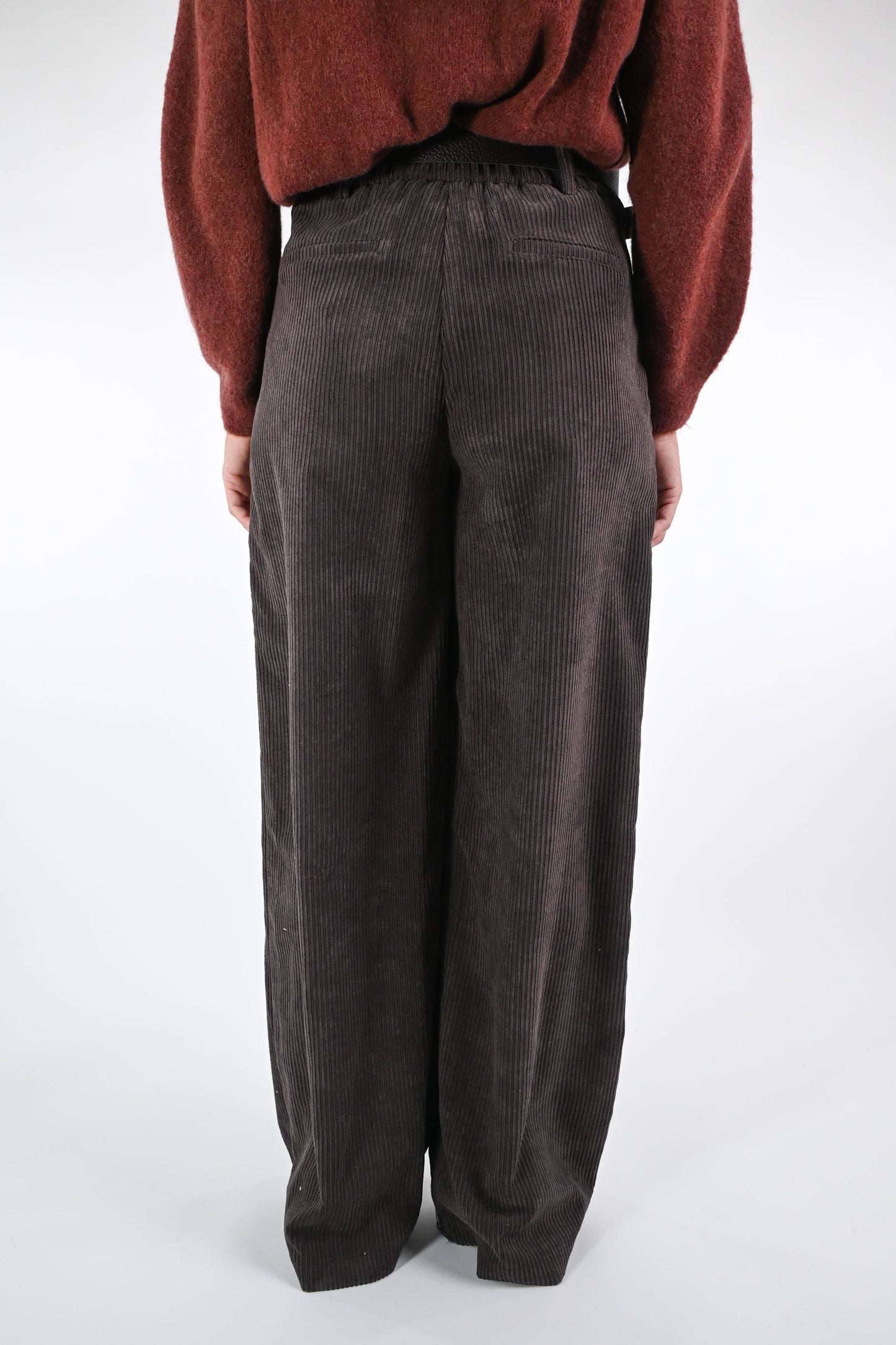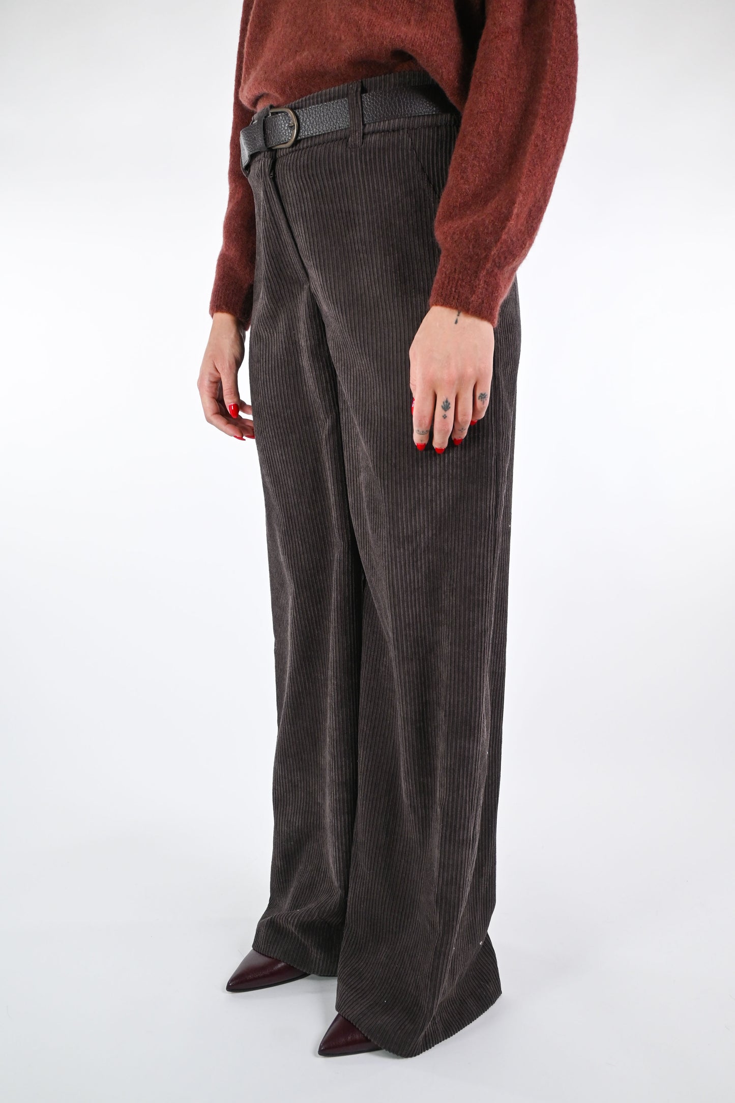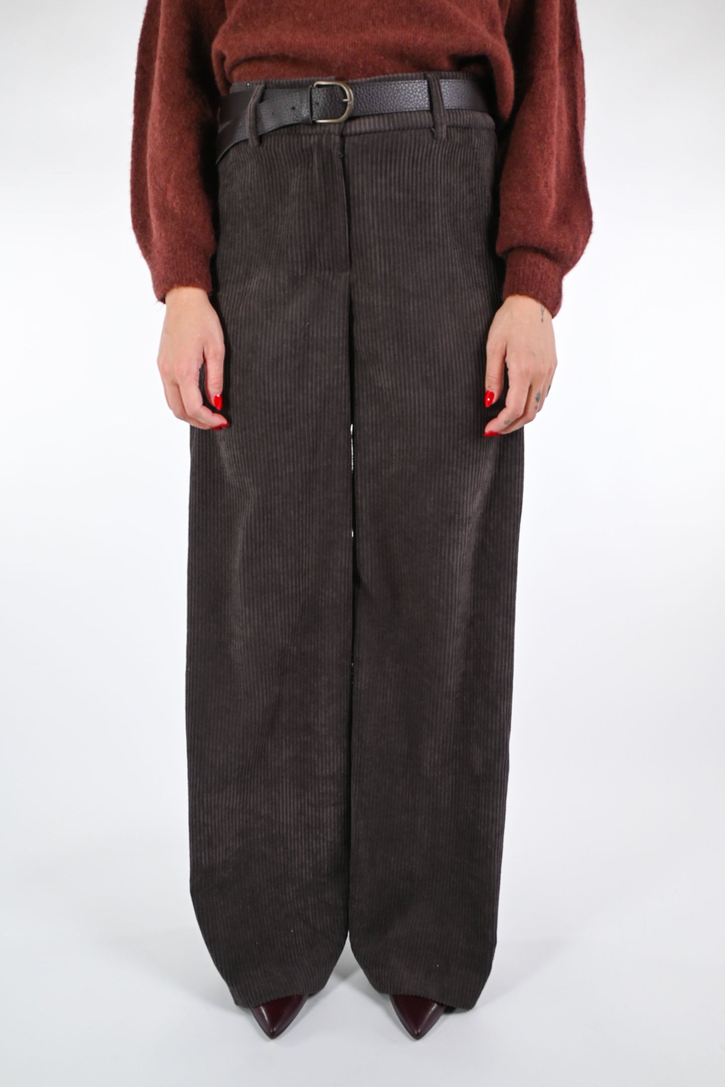 Pantalone palazzo in velluto a coste, con mezzo elastico in vita, con tasche, color moro