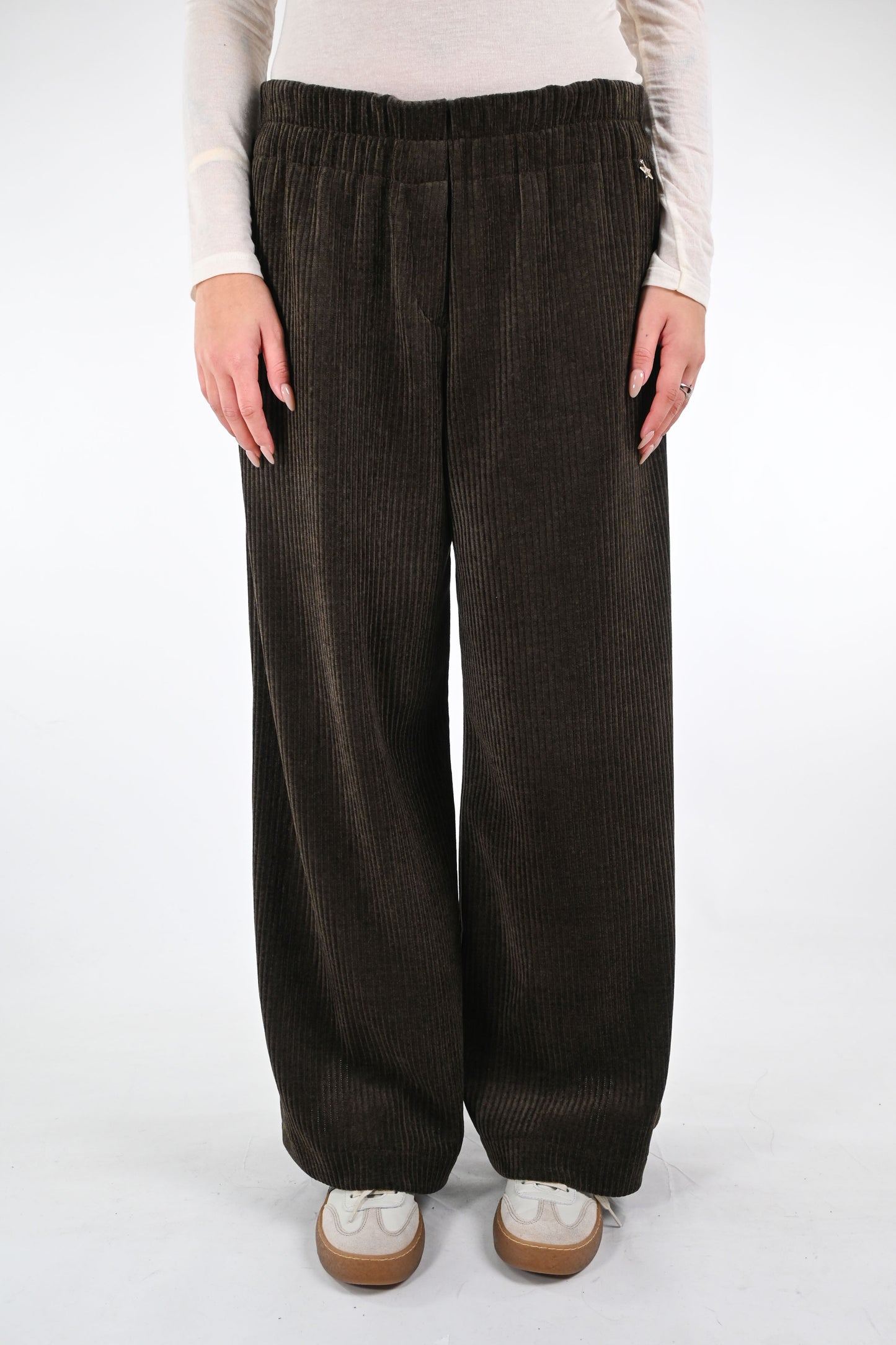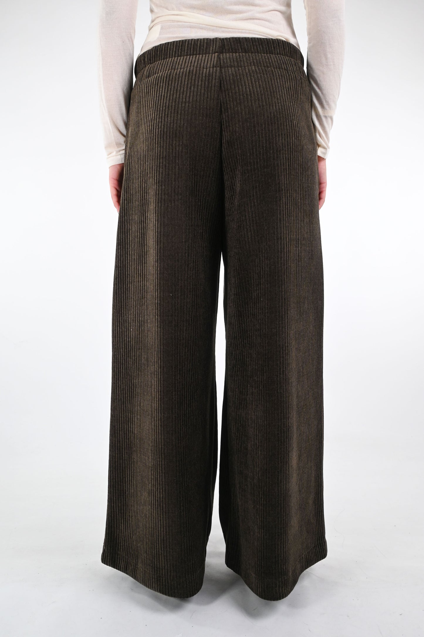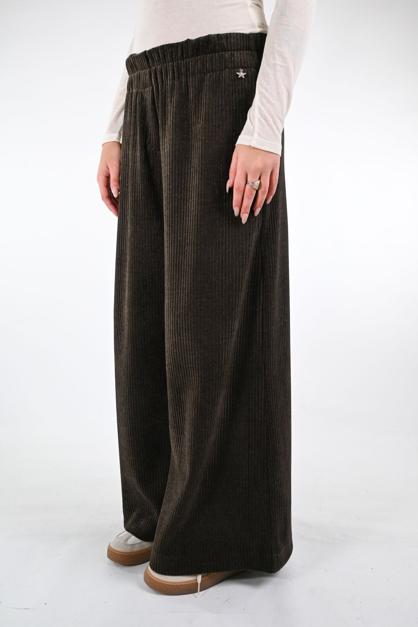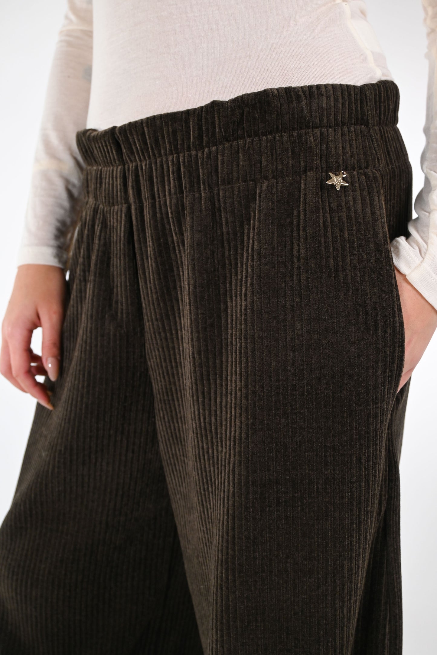 Pantalone palazzo in corposa ciniglia a coste, con tasche a filo, con elastico in vita, colore moro