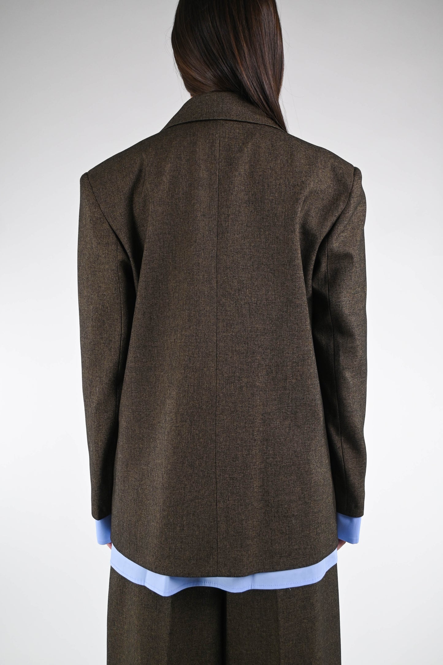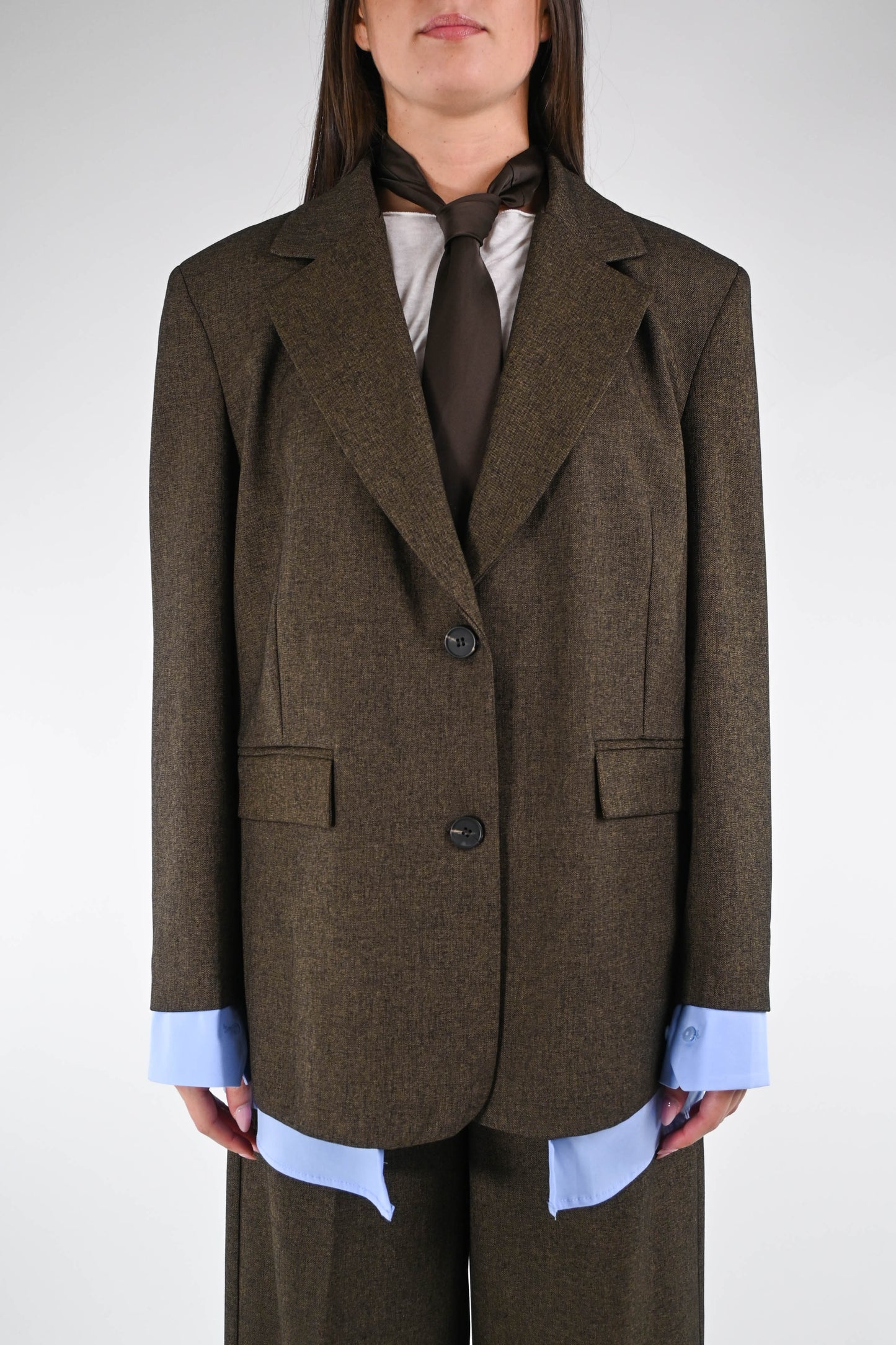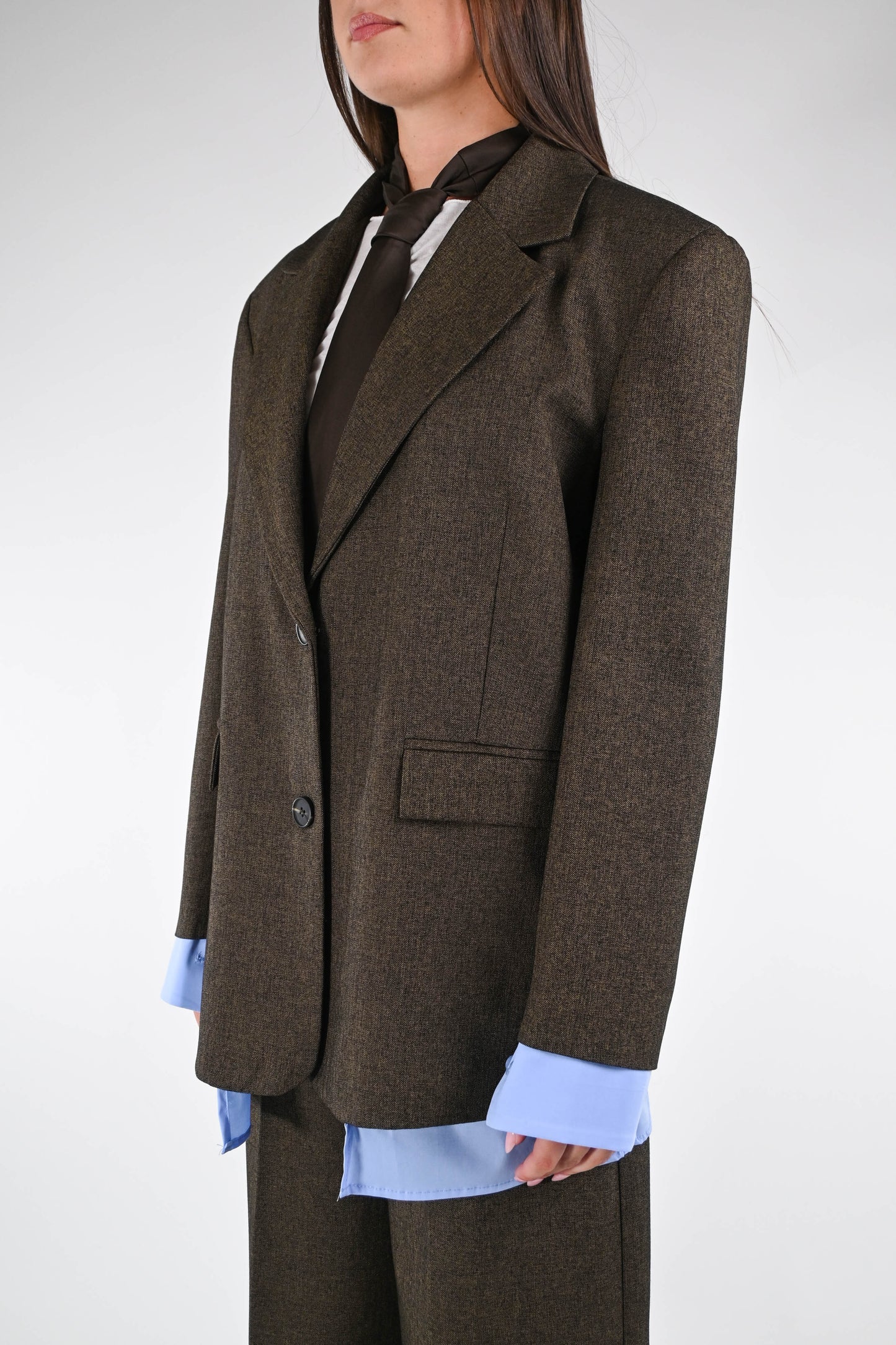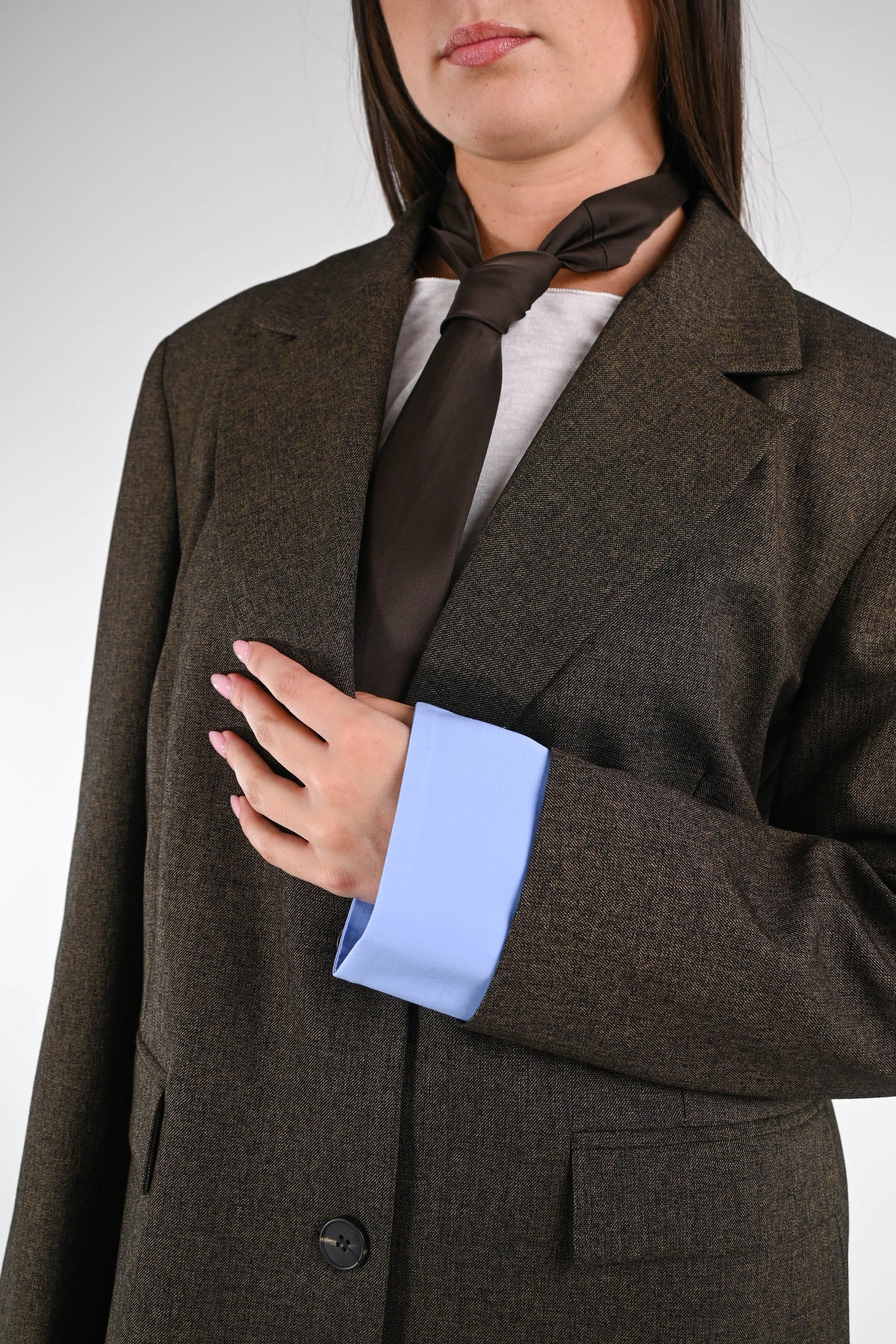 Giacca con camicia e cravatta integrata, due bottoni, con tasche, in tessuto armaturato pepe e sale, color Moro.