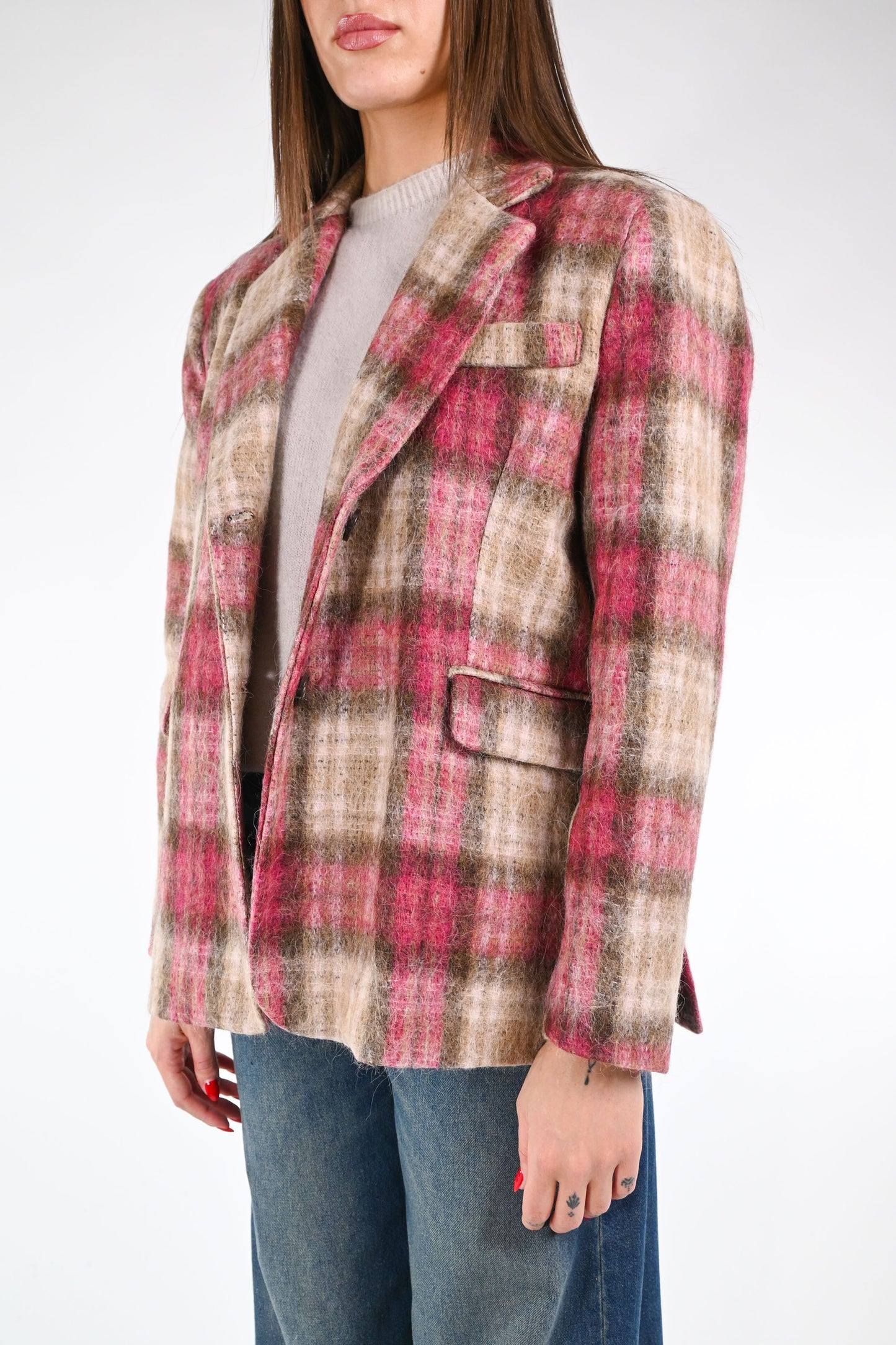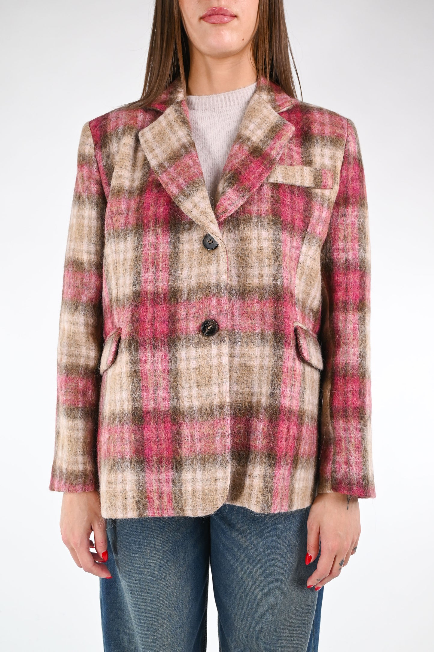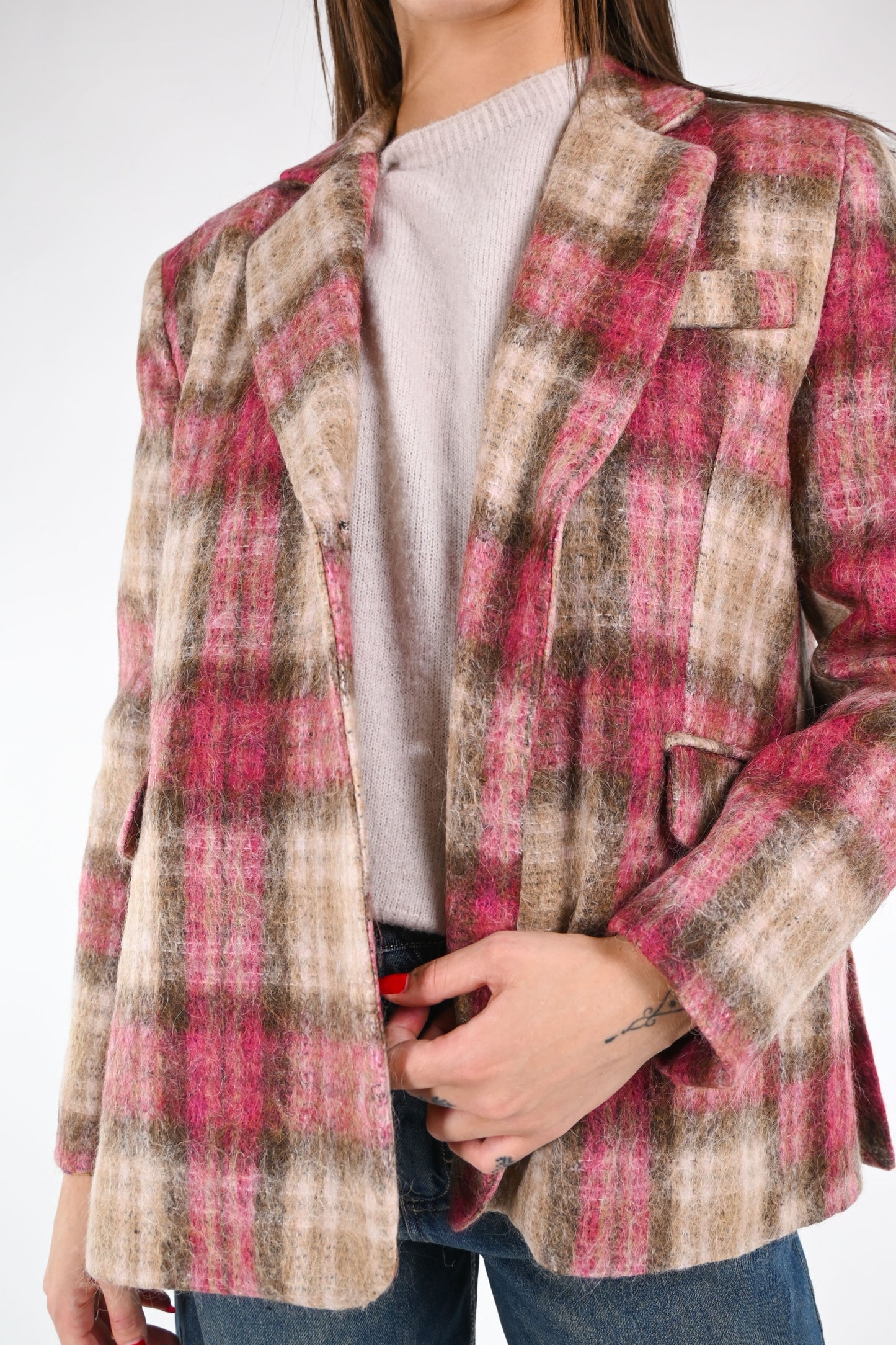Giacca over in lana a quadri, con spacchi dietro, due bottoni, con tasche, color fuxia/beige