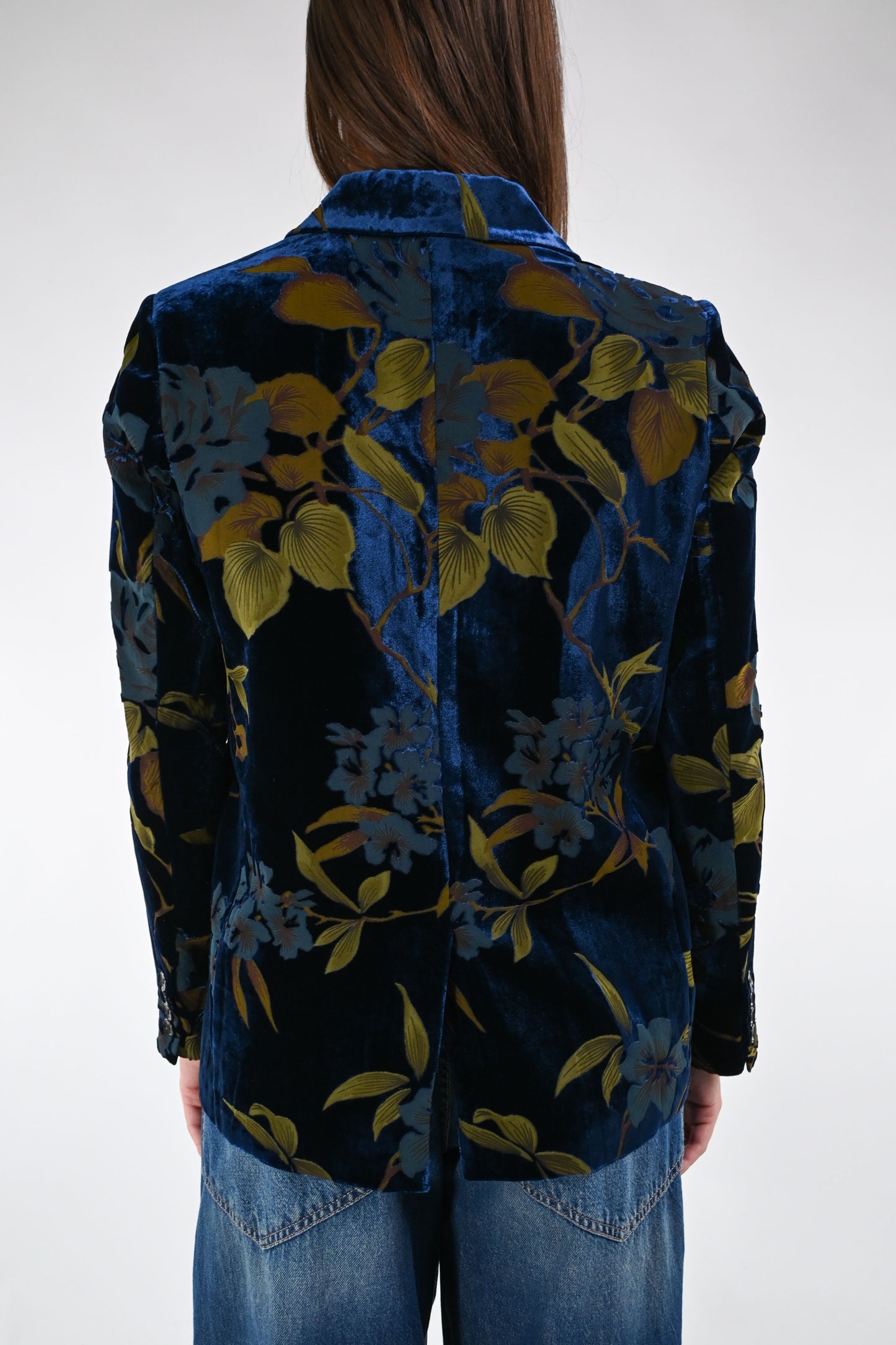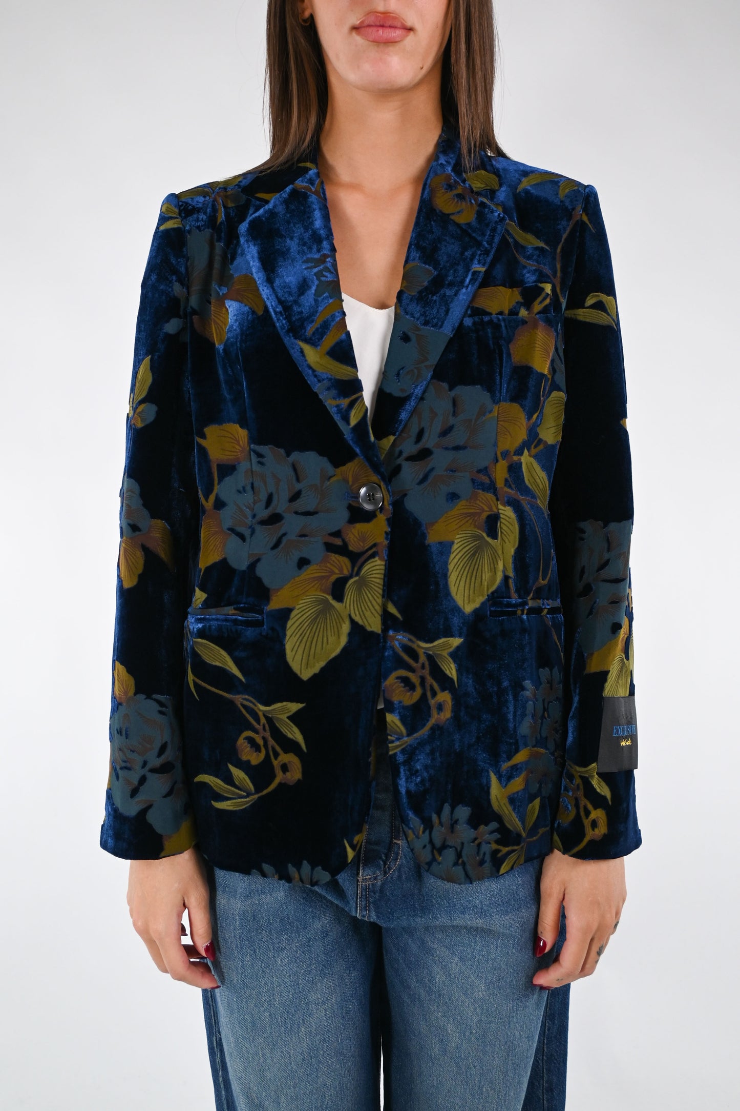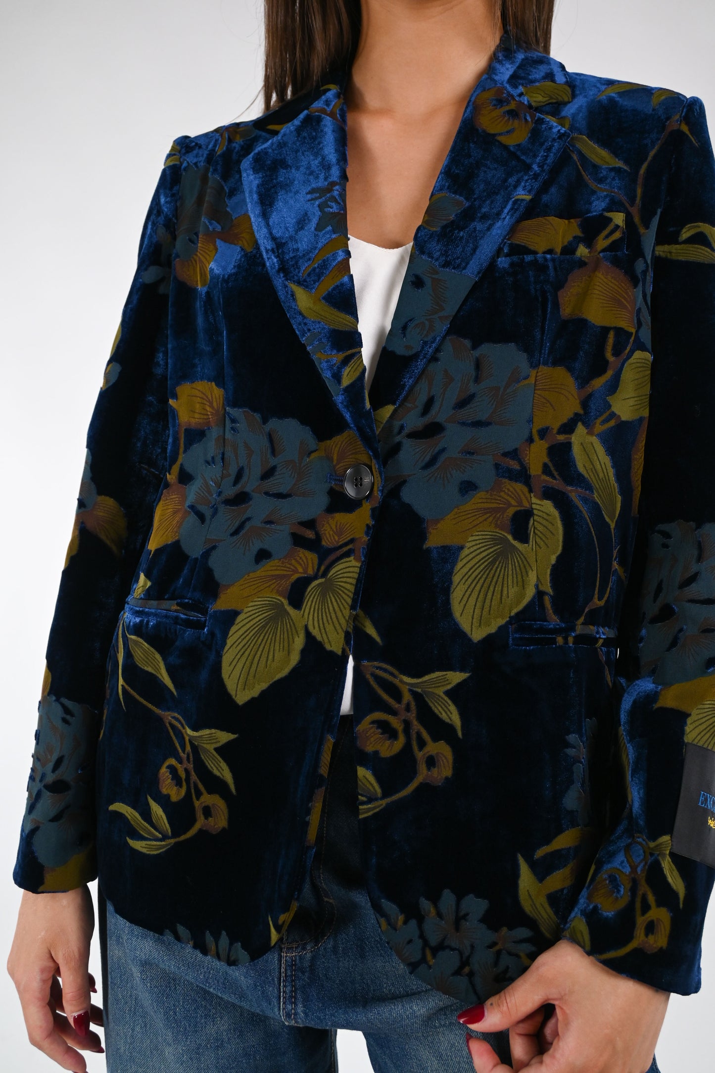 Giacca velluto liscio devorè, fantasia floreale, ad un bottone, foderata, con tasche, colore blu