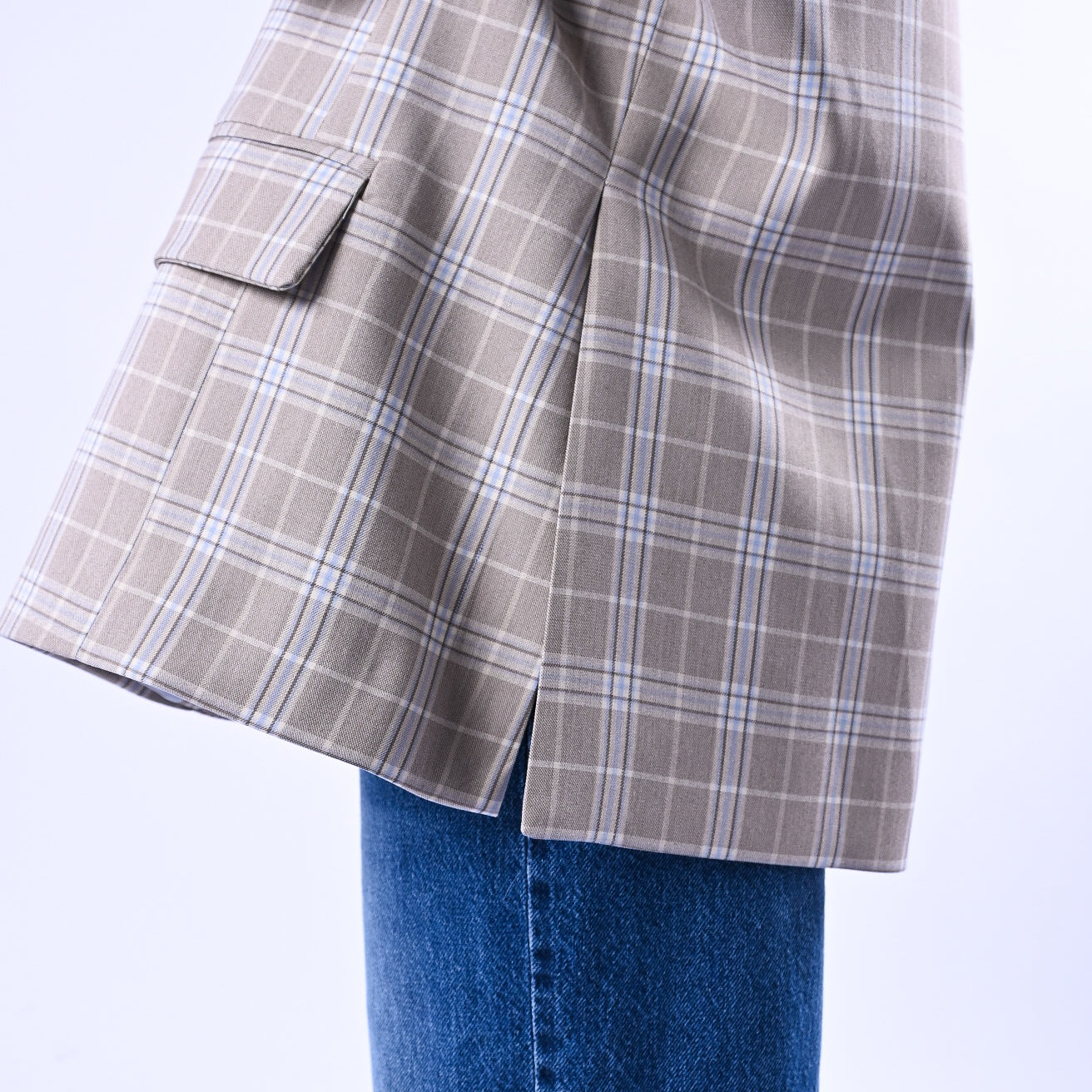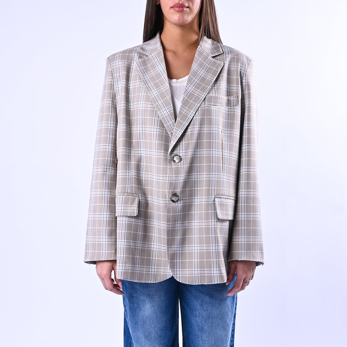 Giacca over in tartan beige e celeste con abbottonatura asimmetrica che crea un effetto dinamico e moderno. Un capo versatile e raffinato, perfetto per stratificare con stile e aggiungere carattere.