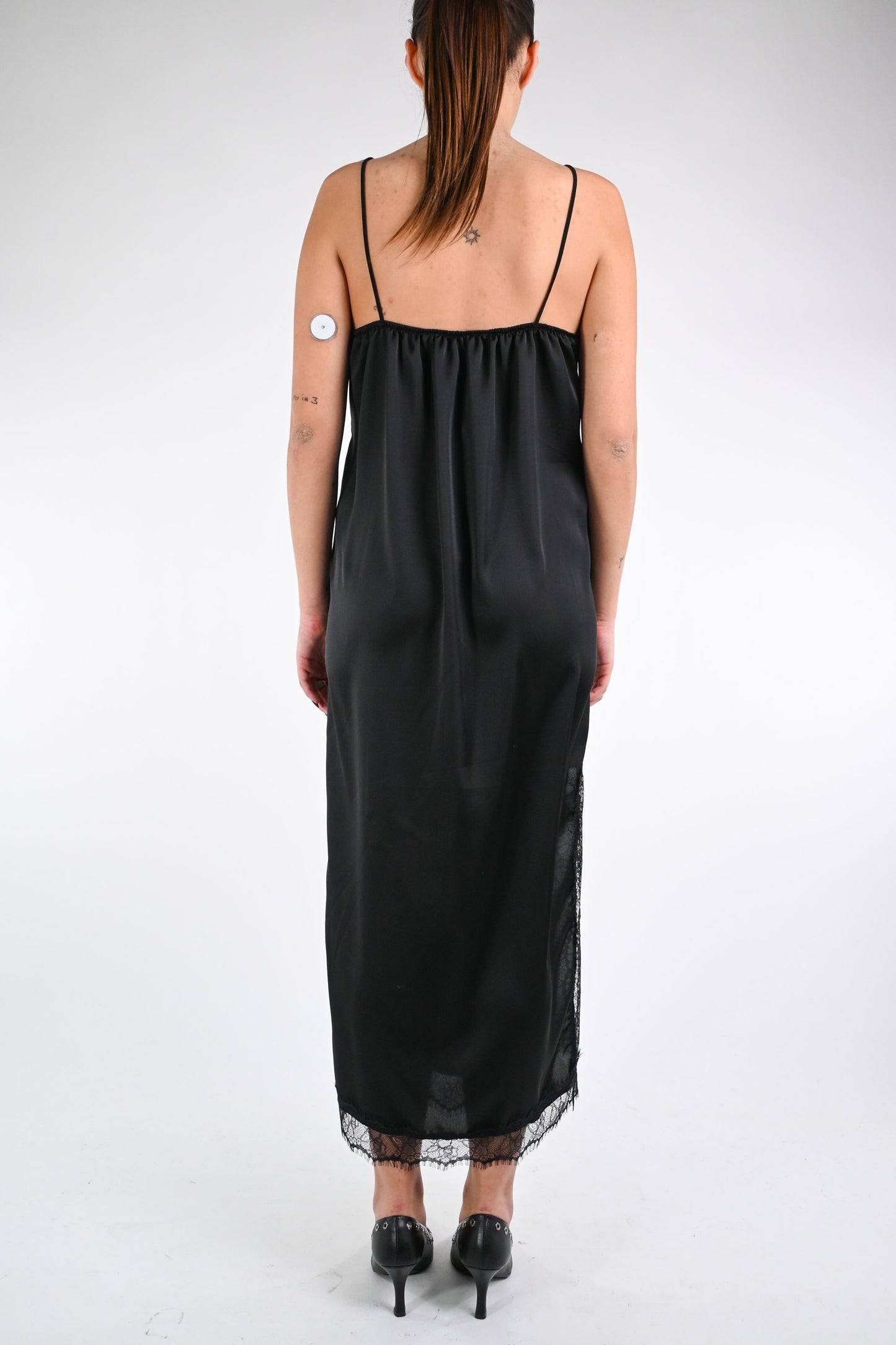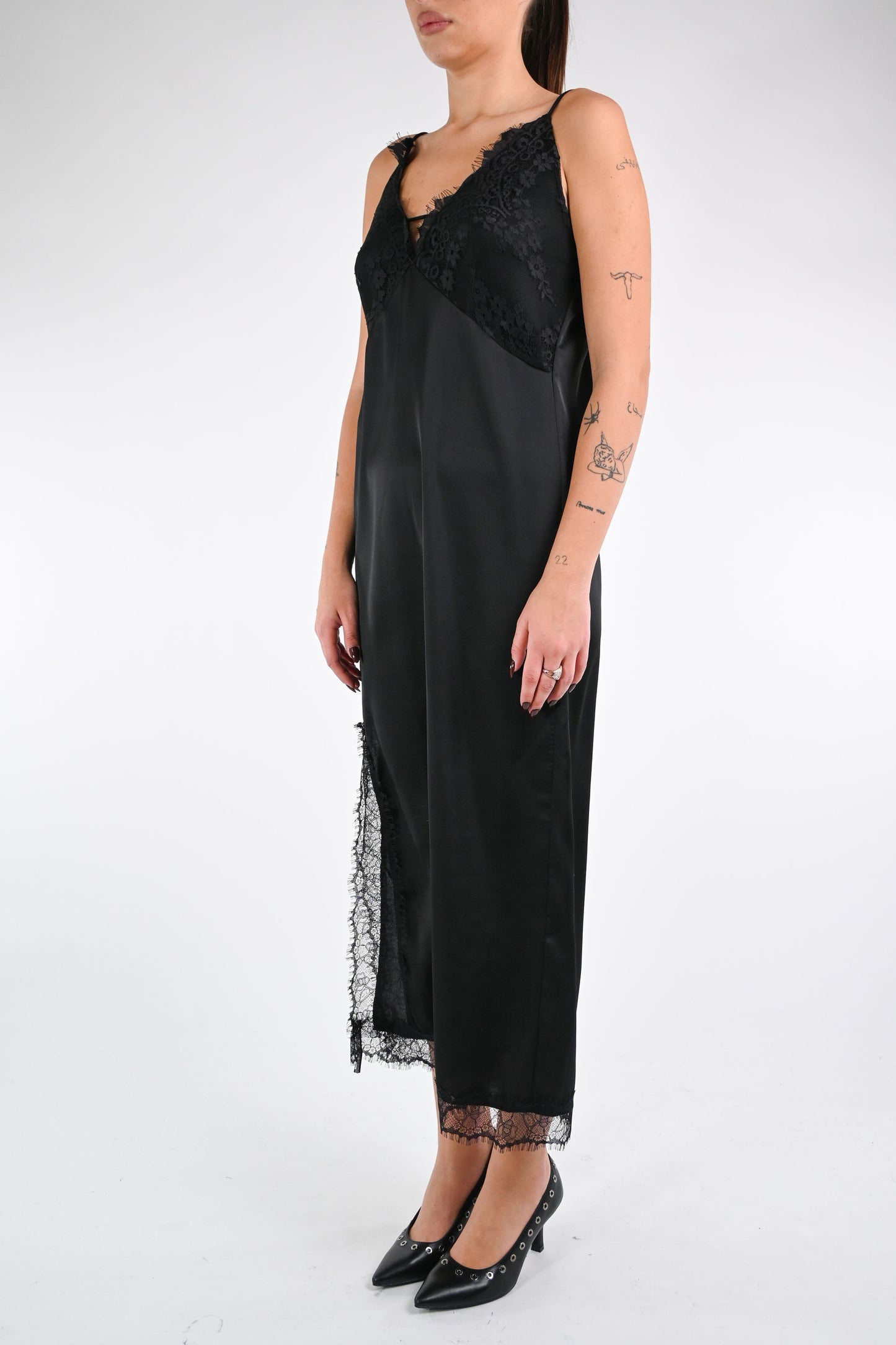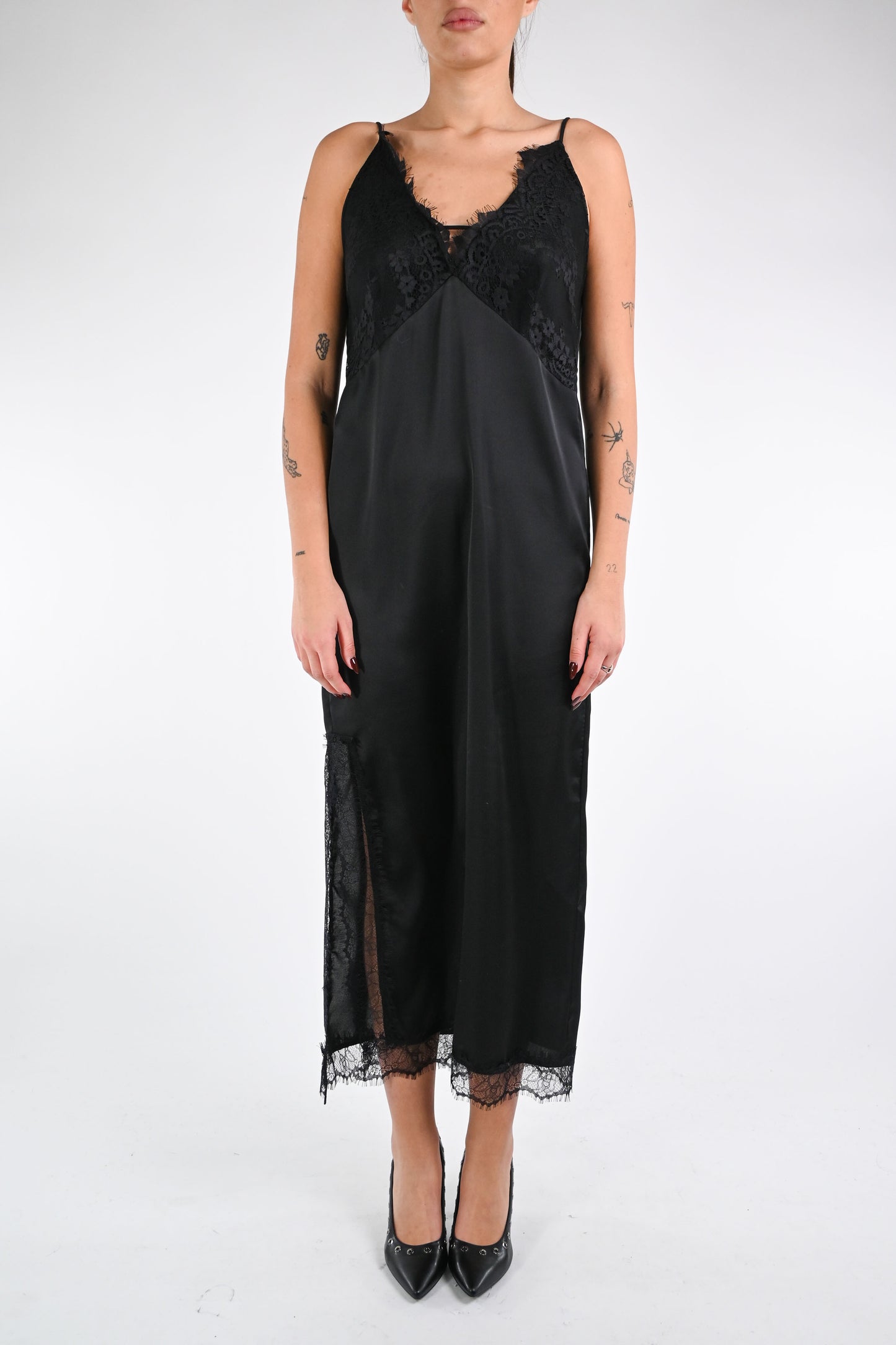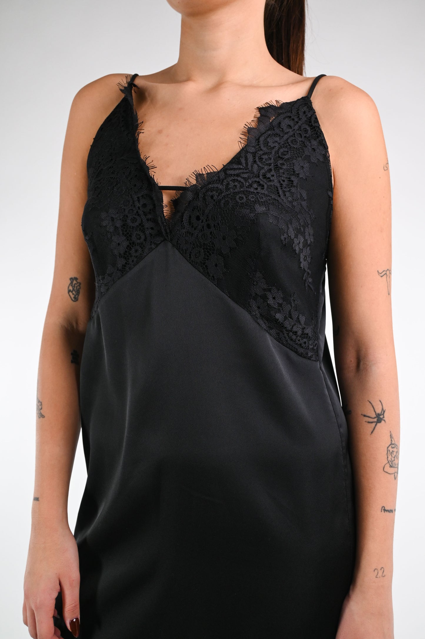 Abito spallina lingerie, con coppa e profili in pizzo, con spacco, colore nero
