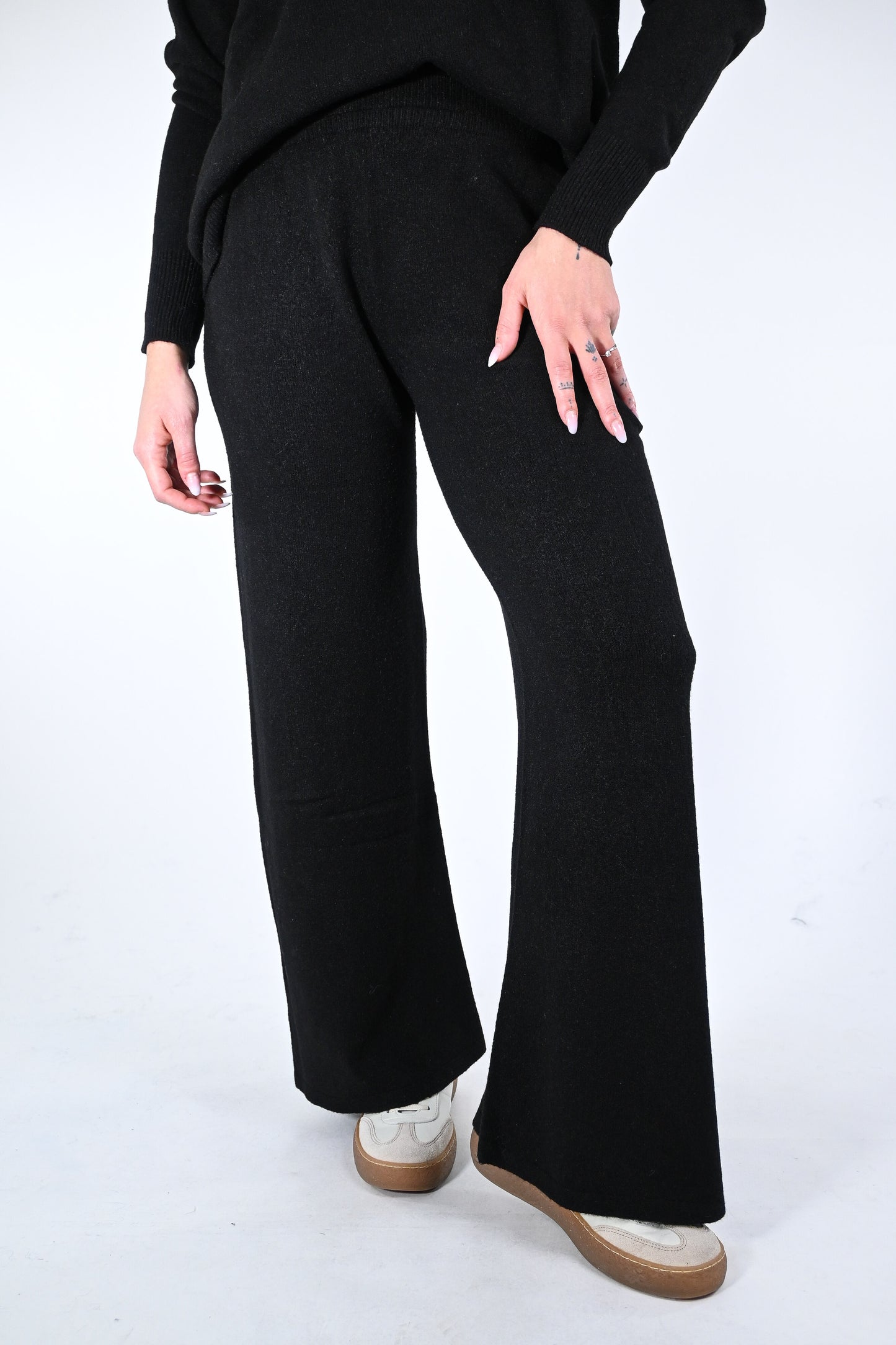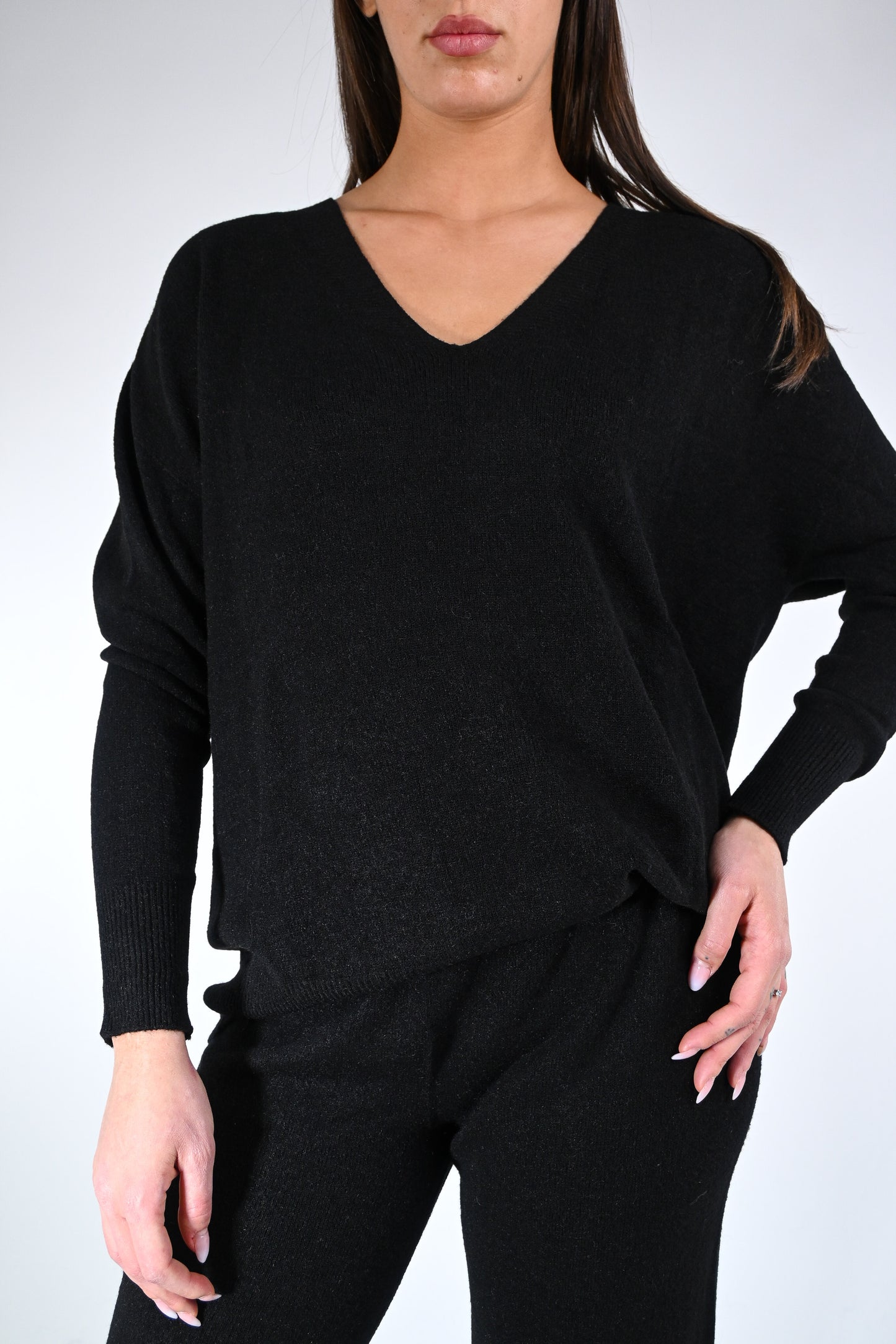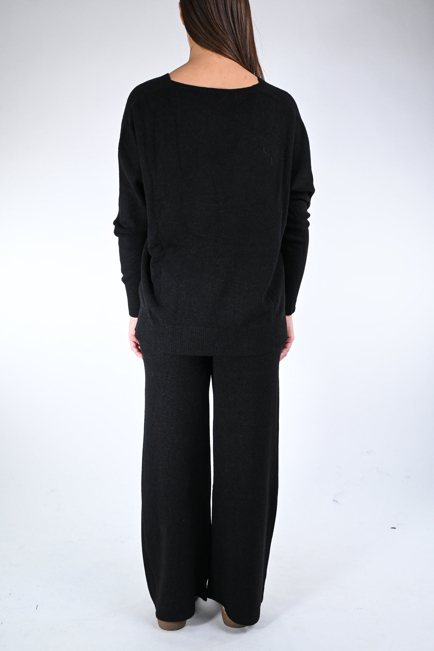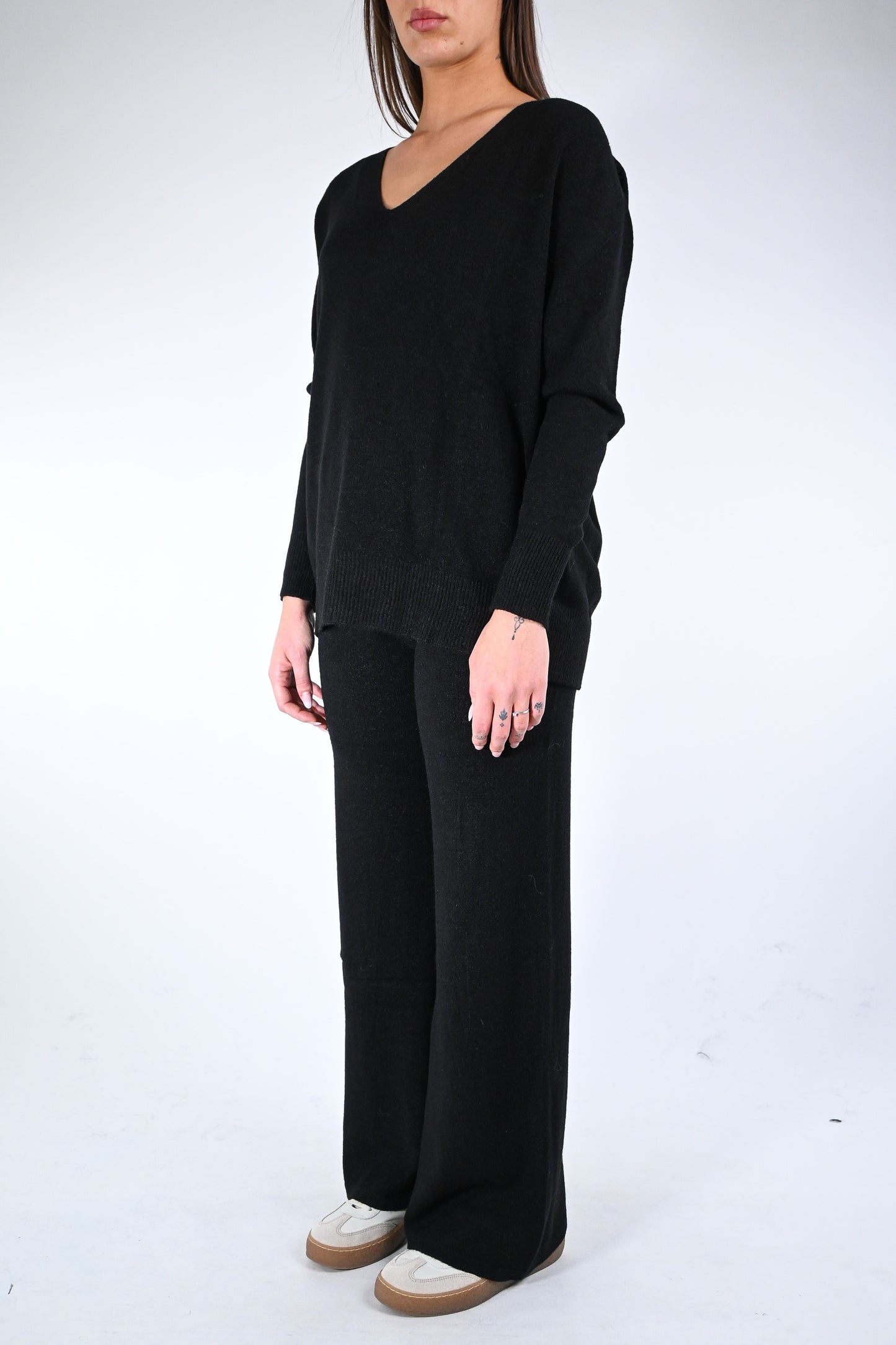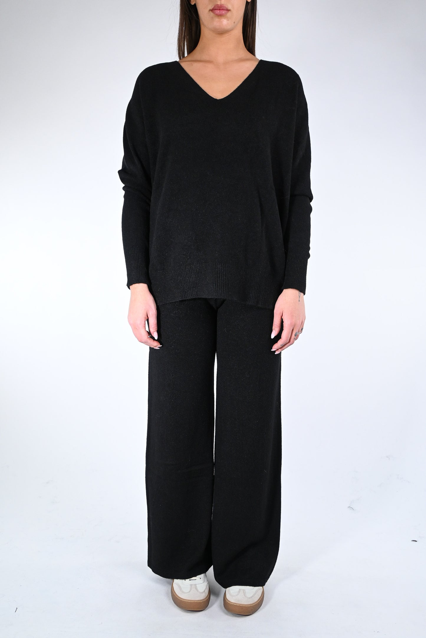 Prezzo normale €59,50Completo in maglia scollo V con pantalone palazzo con coulisse in vita, elasticizzato, colore nero