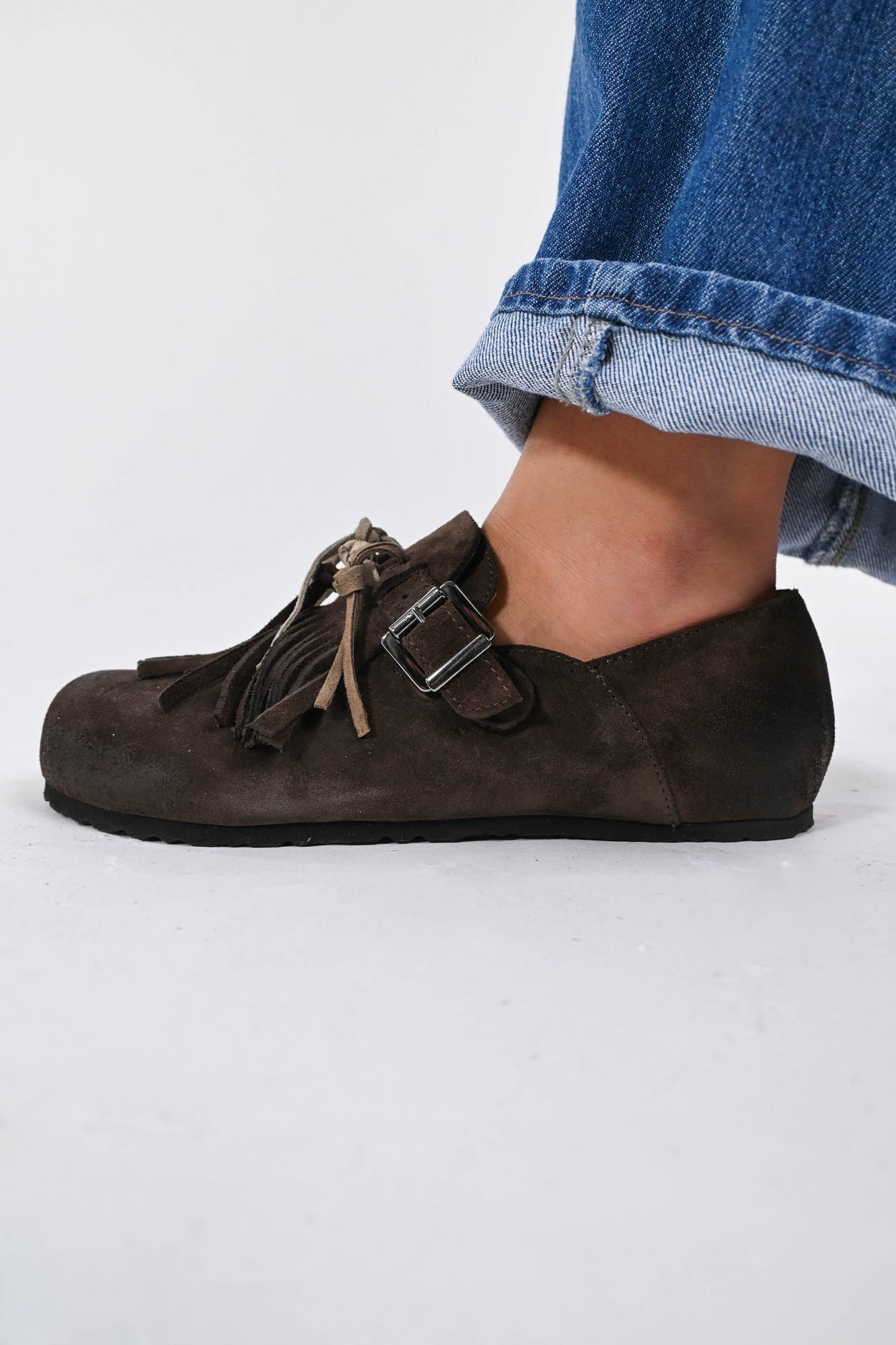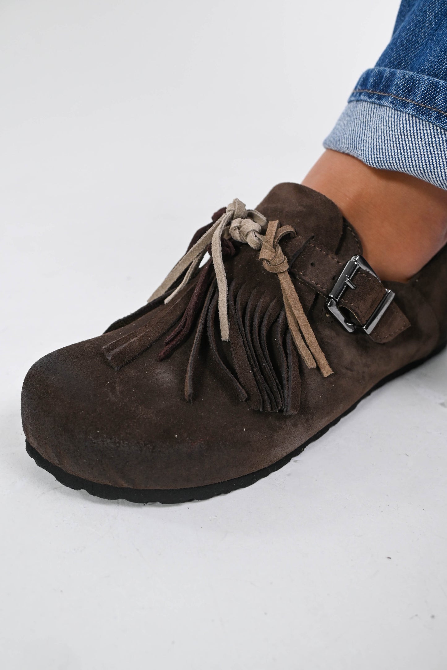 Ciabatta con frange chiusa sul tallone , con fibbia, in pelle scamosciata moro