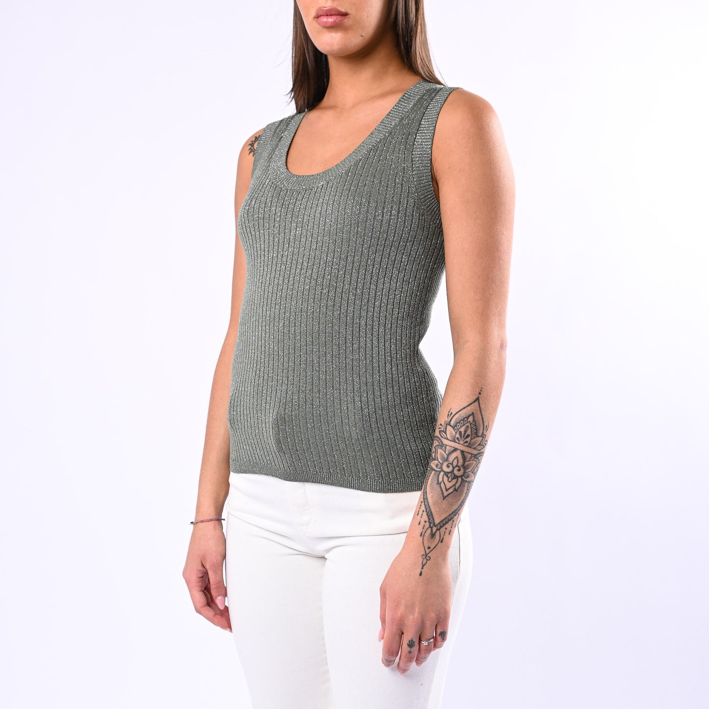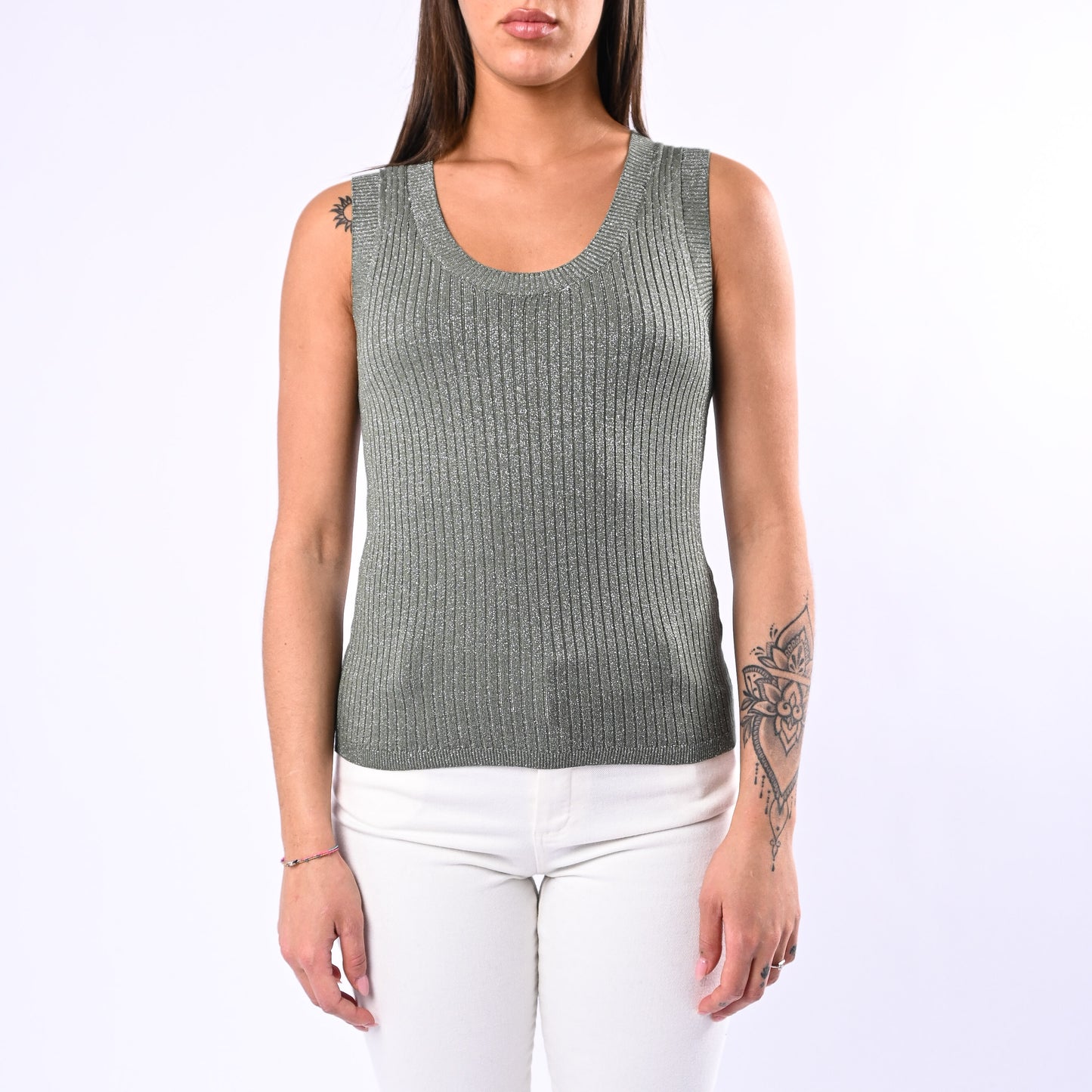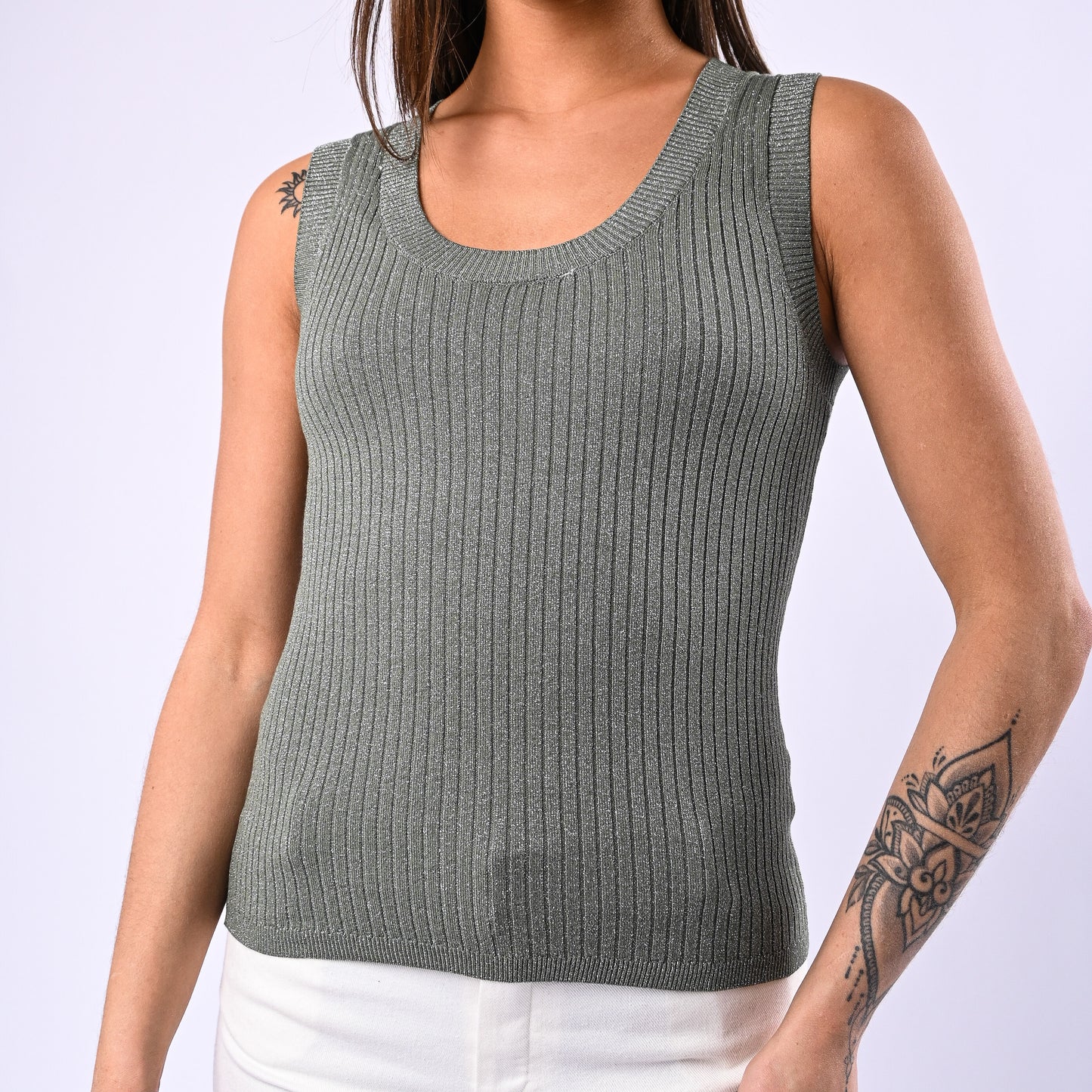 Canotta in maglia a coste con scollo a madonna impreziosita da dettagli lurex beige. Pratica e sofisticata, si rivela la scelta ideale per chi ricerca semplicità senza rinunciare all'eleganza.