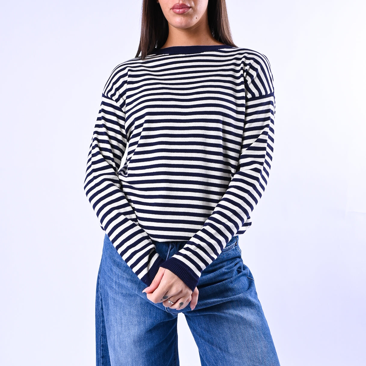 B LOVE - MAGLIA RIGHE SCOLLO BARCHETTA ART.C225 - PANNA/BLU