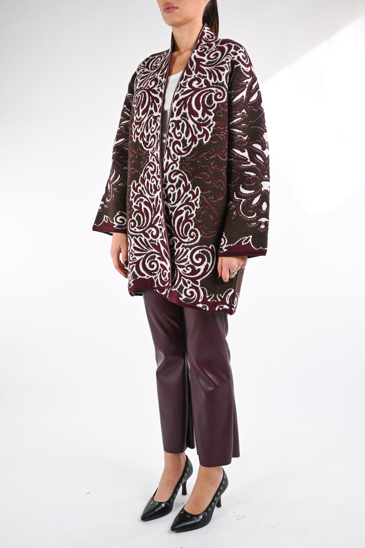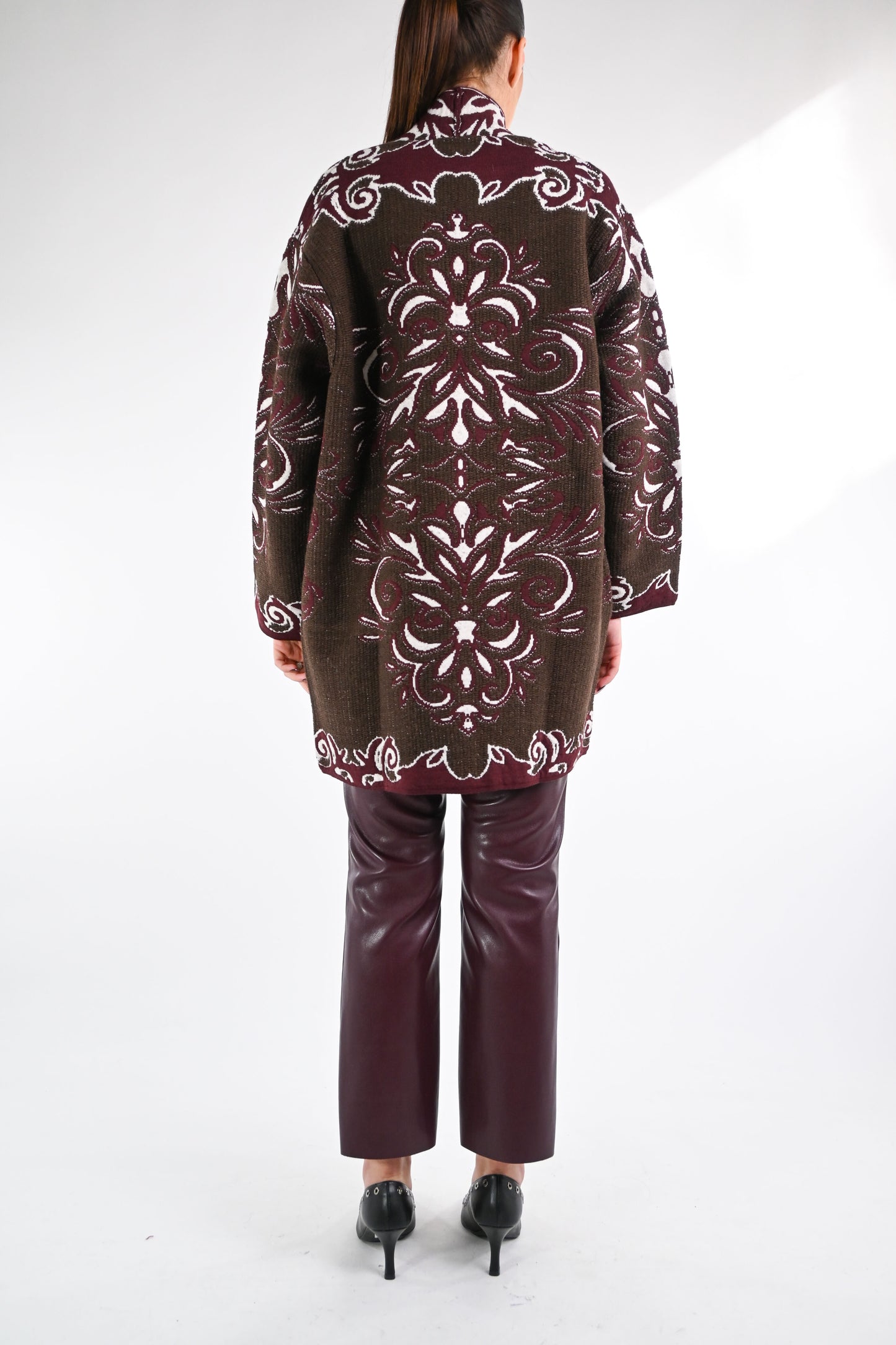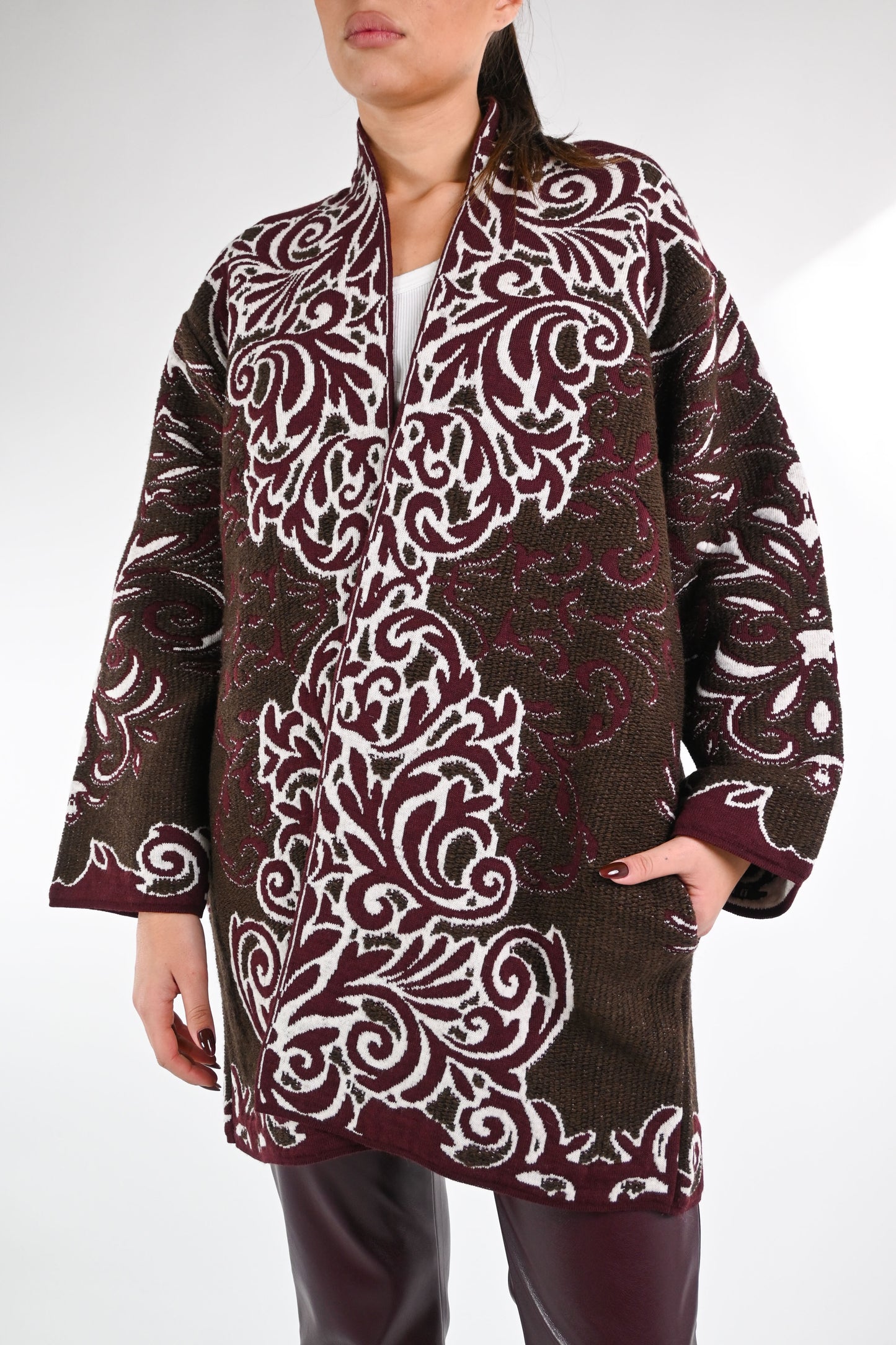 Cardigan/cappotto jaquard damascato, senza bottoni, colore brown