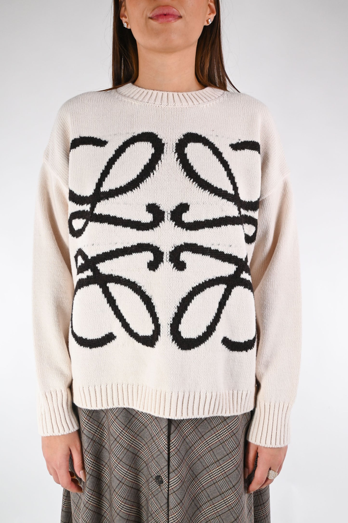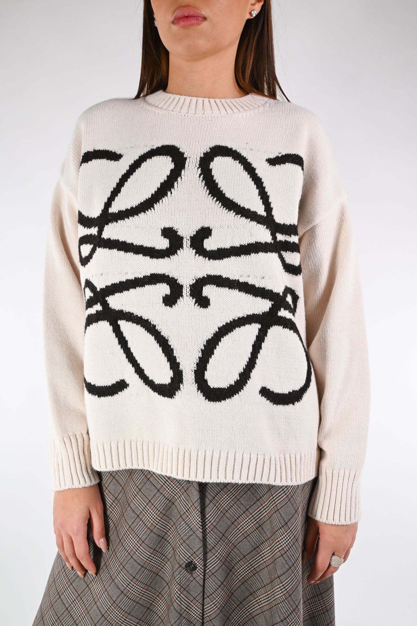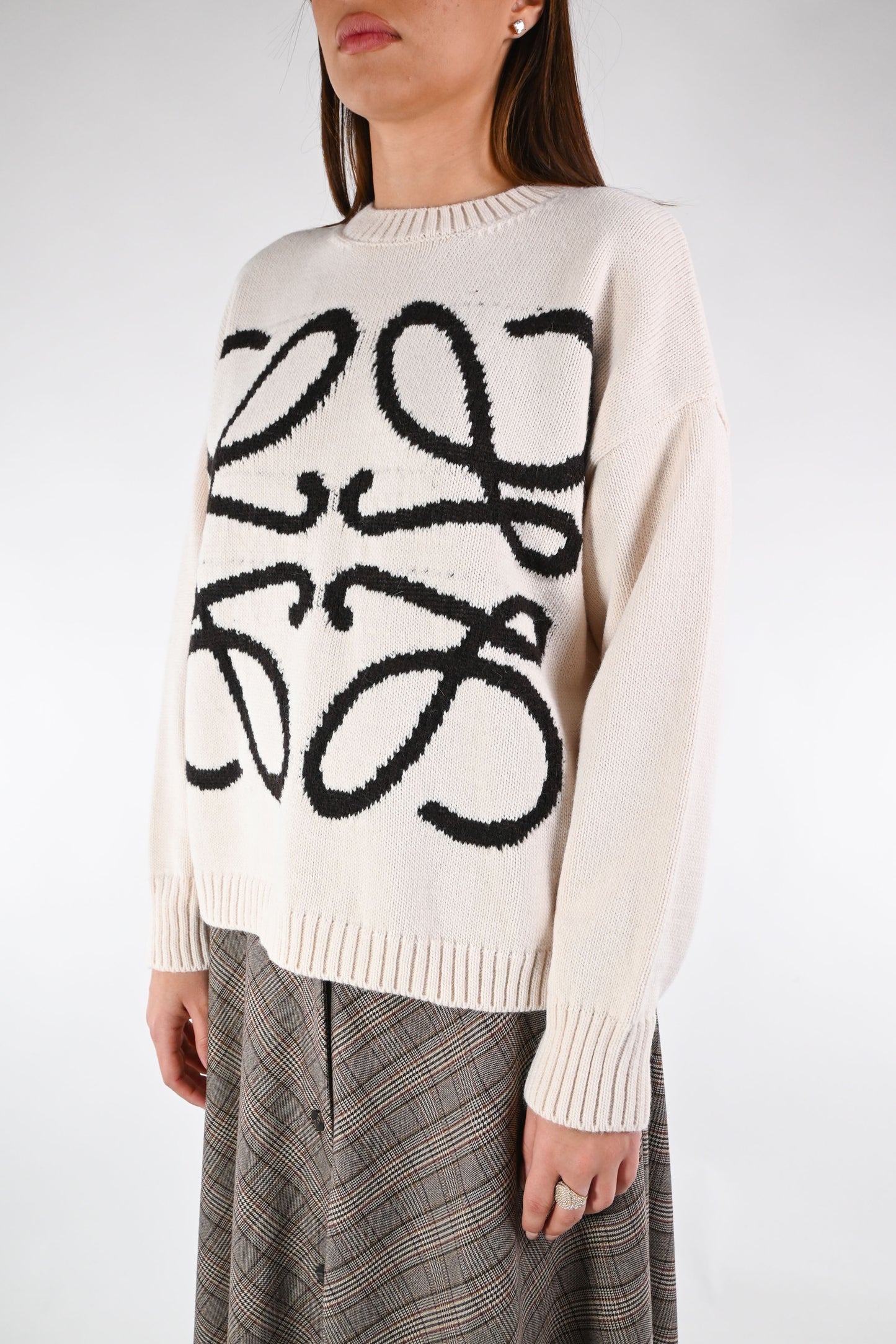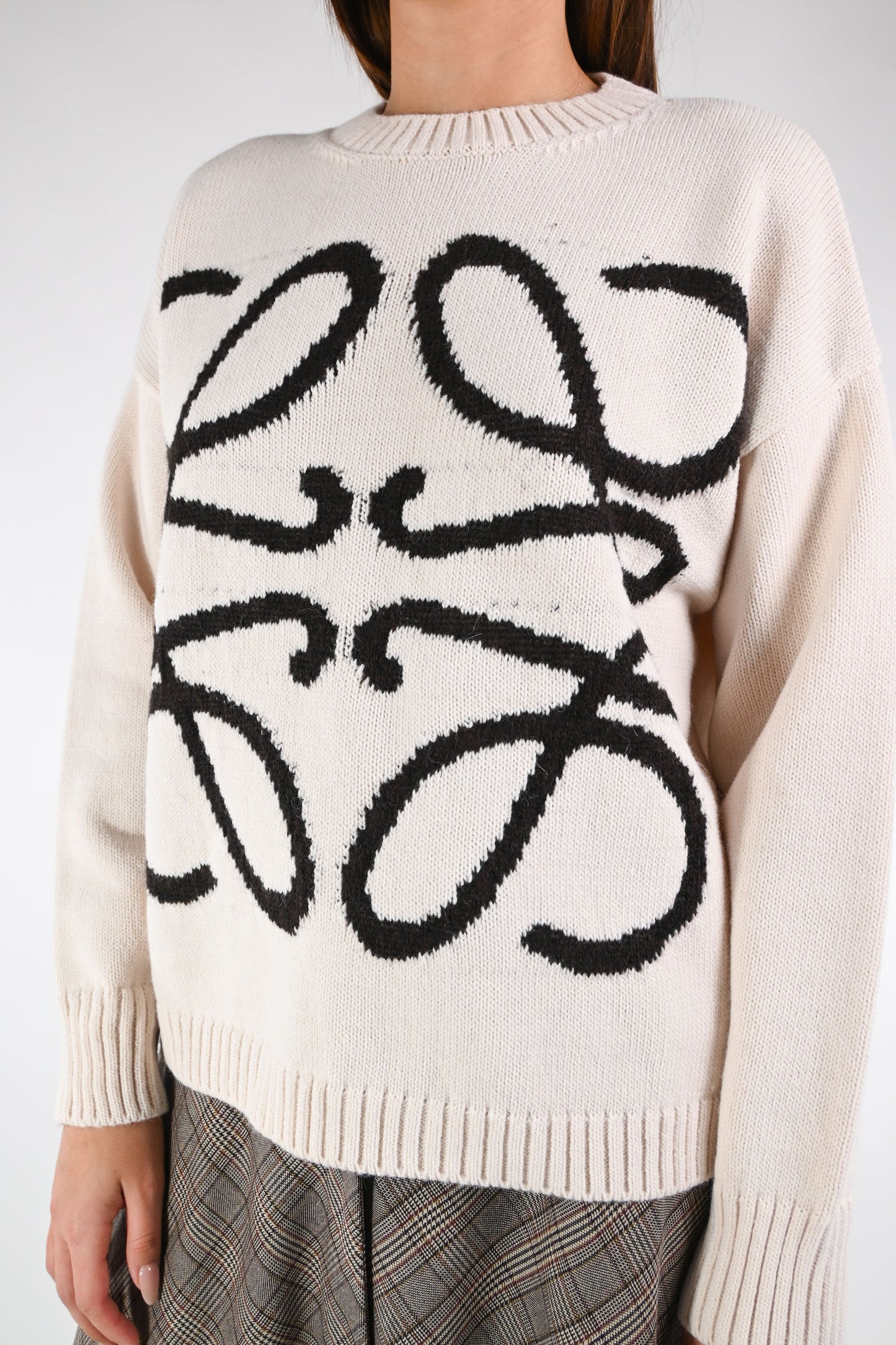 Maglia a scatola girocollo, con ricamo a contrasto, colore panna/nero
