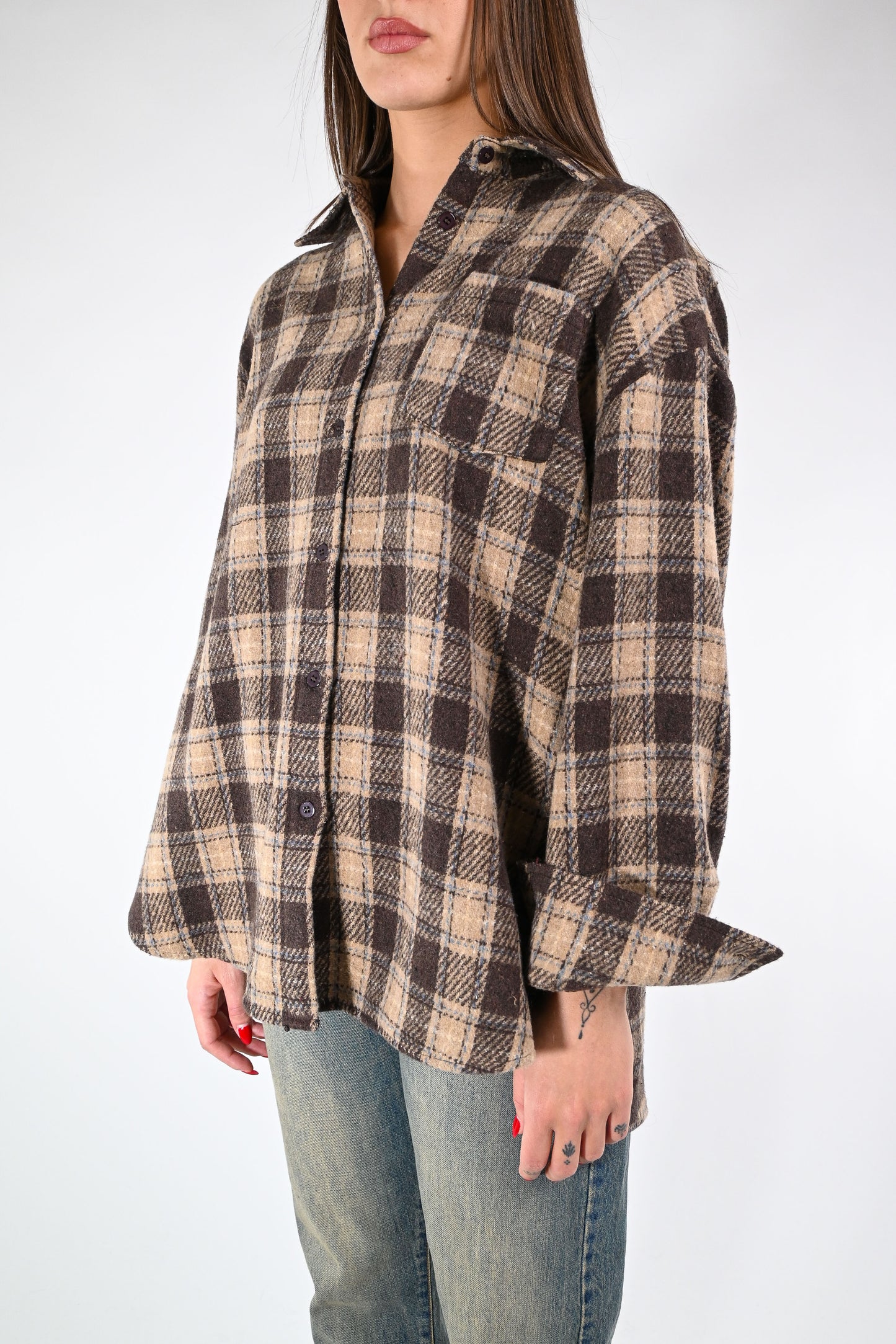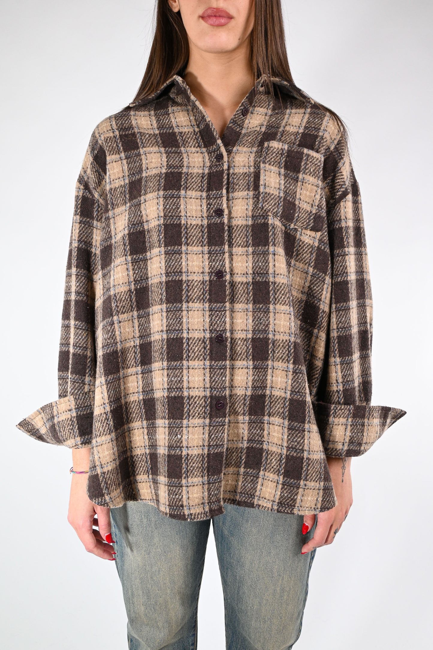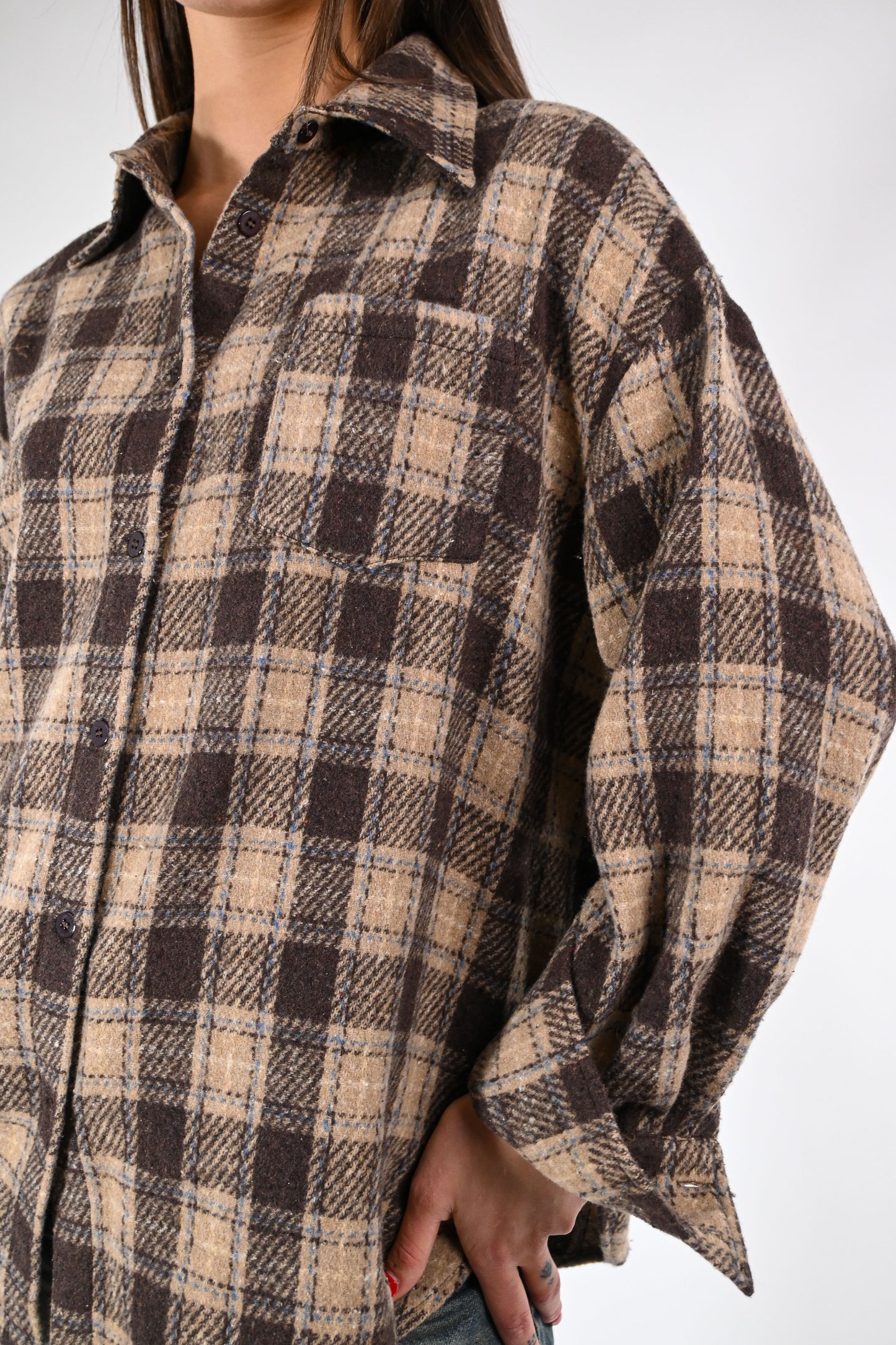 Camicia in morbida flanella fantasia a quadri, abbottonata fino in fondo, con tasca applicata , colore moro/cammello