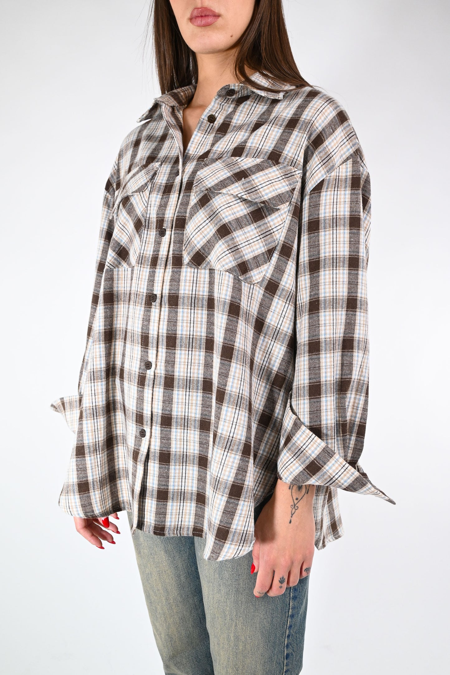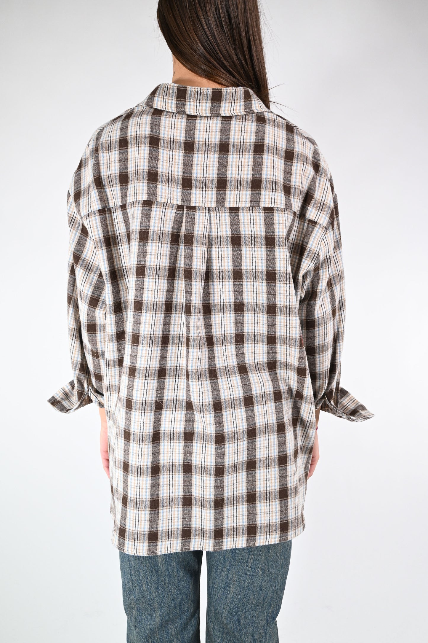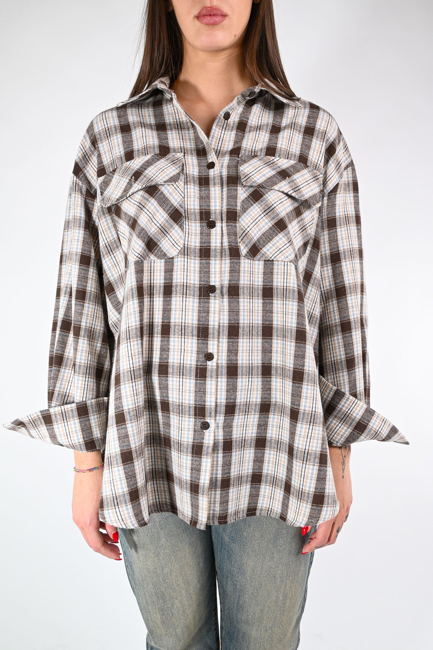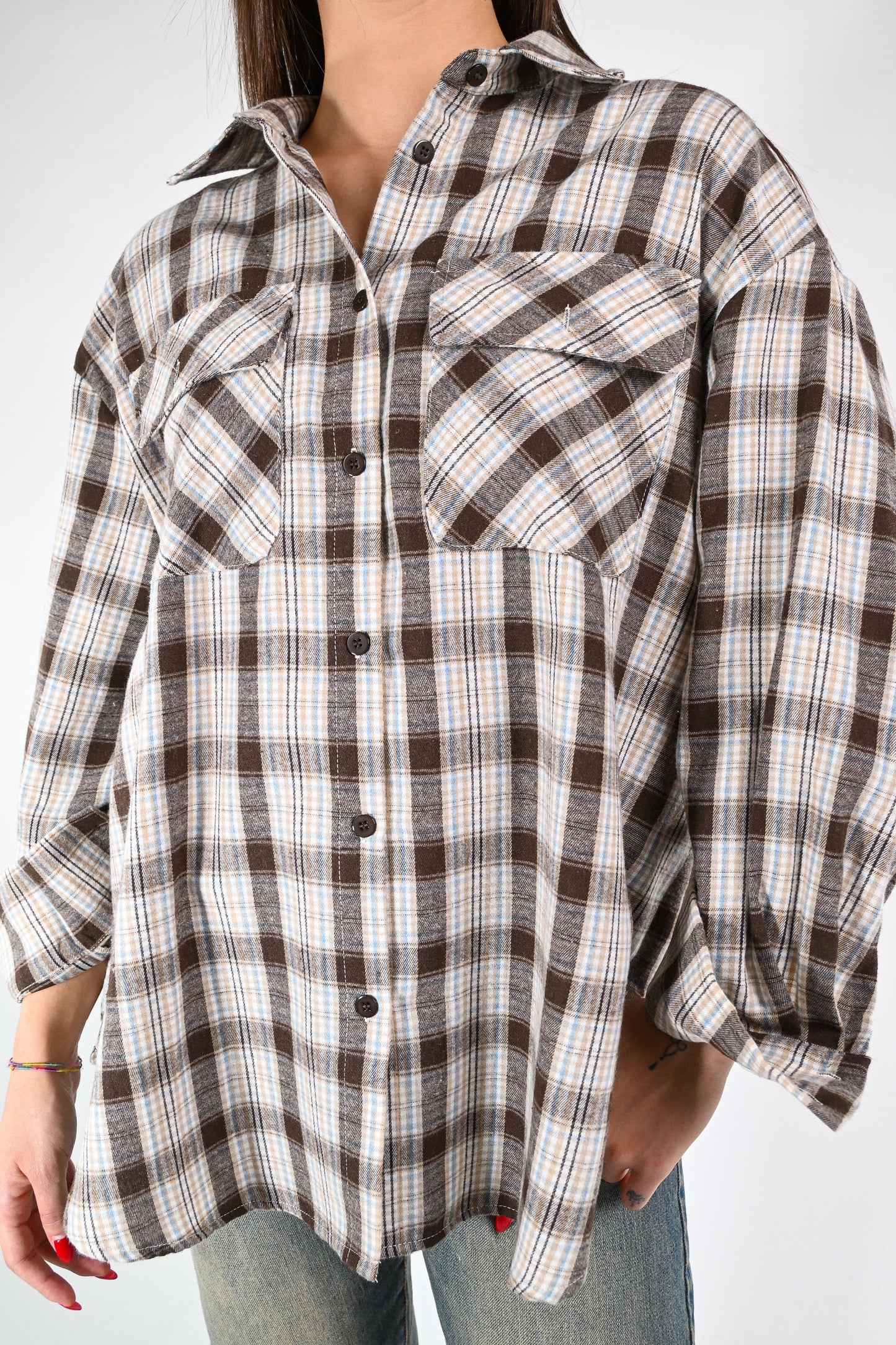 Camicia in flanella fantasia scozzese, abbottonata fino in fondo, con doppia tasca applicata , colore moro/panna/celeste